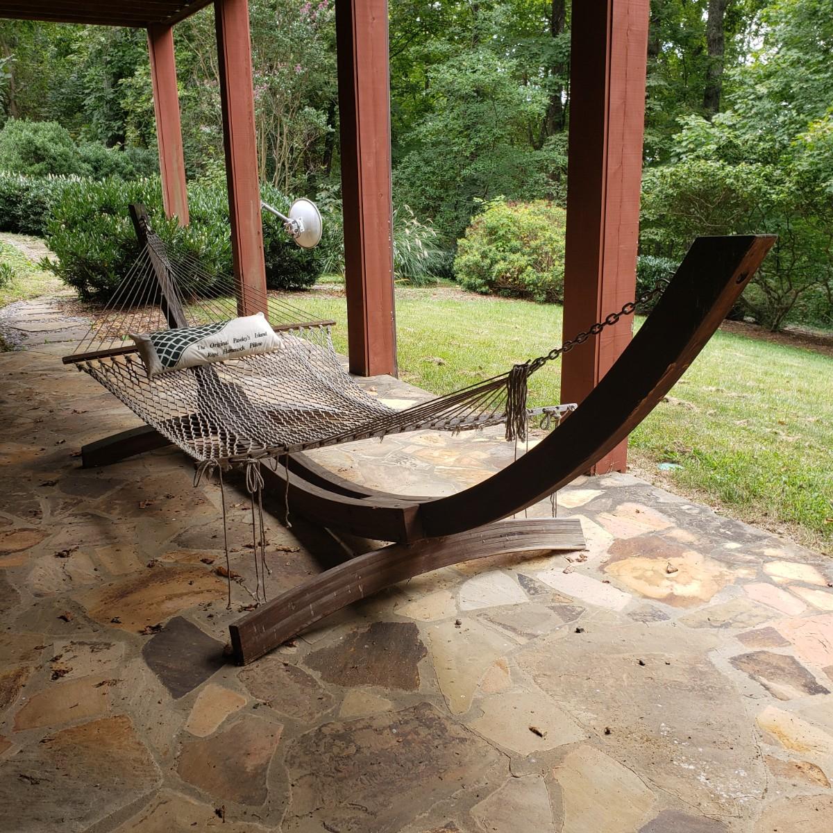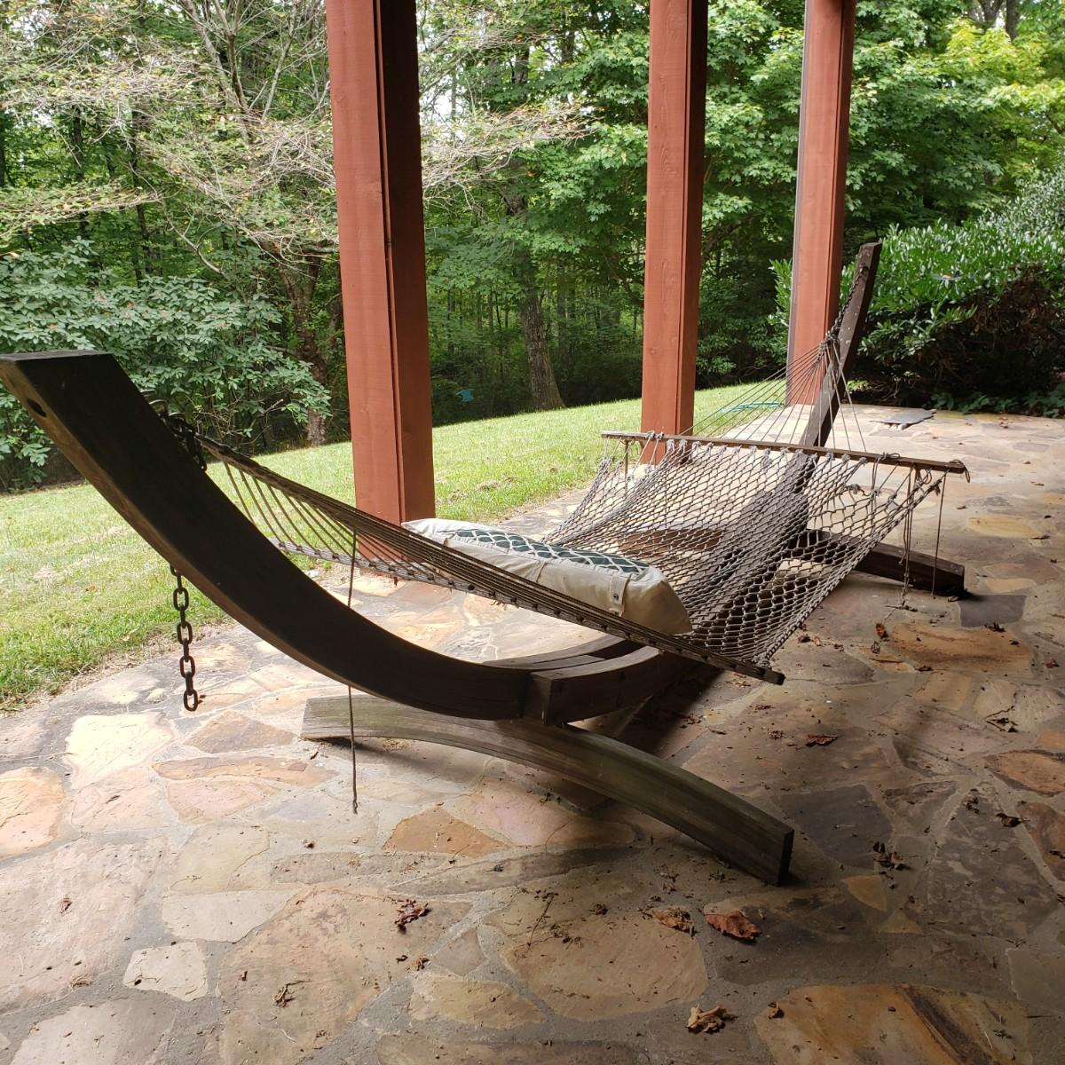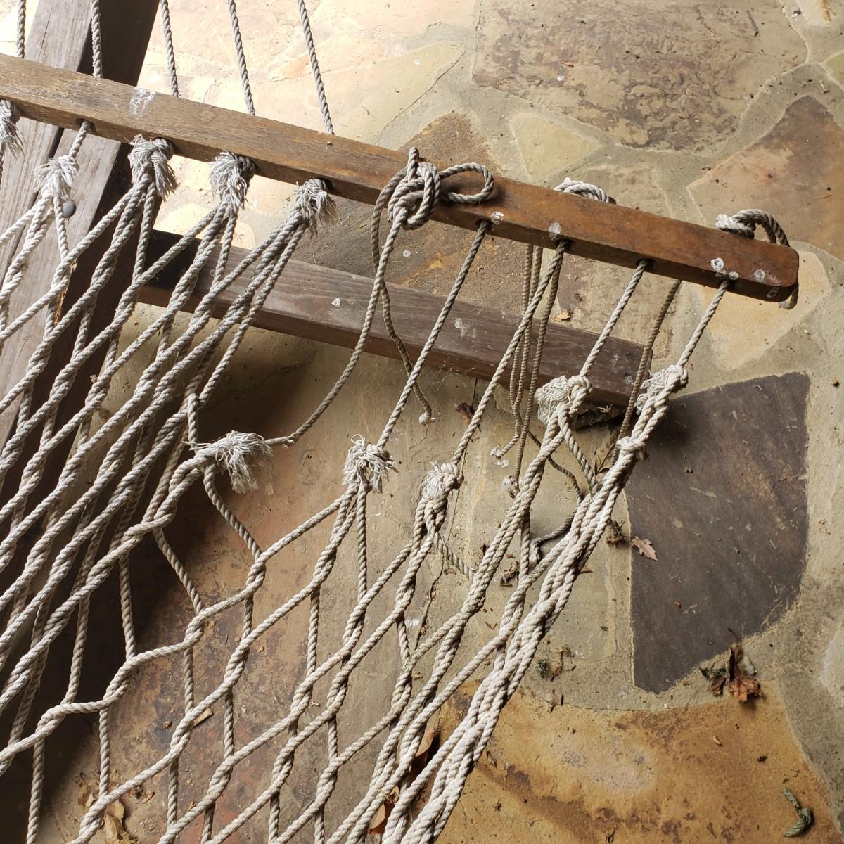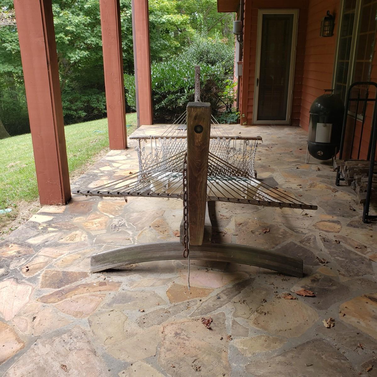This wooden sleigh style hammock measures 184" x 58" x 52"H. The roped hammock attaches with chains and "S" hooks. The hammock has some rope broken, see pictures. It also comes with a head pillow.