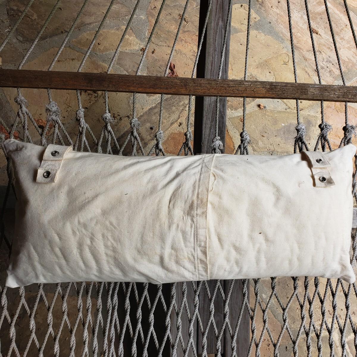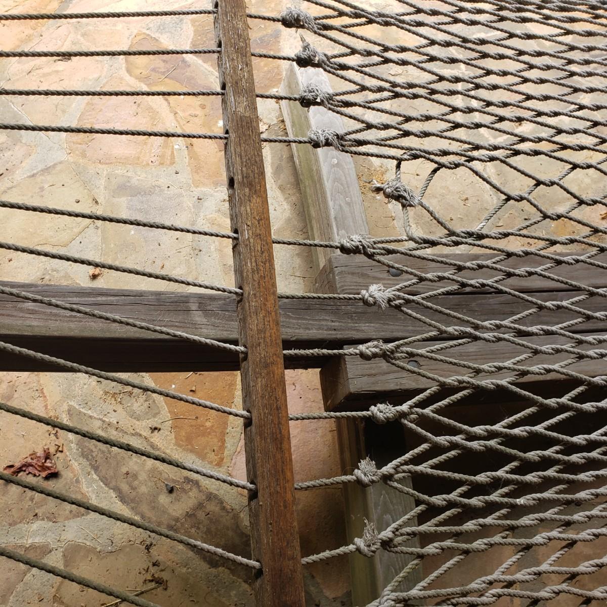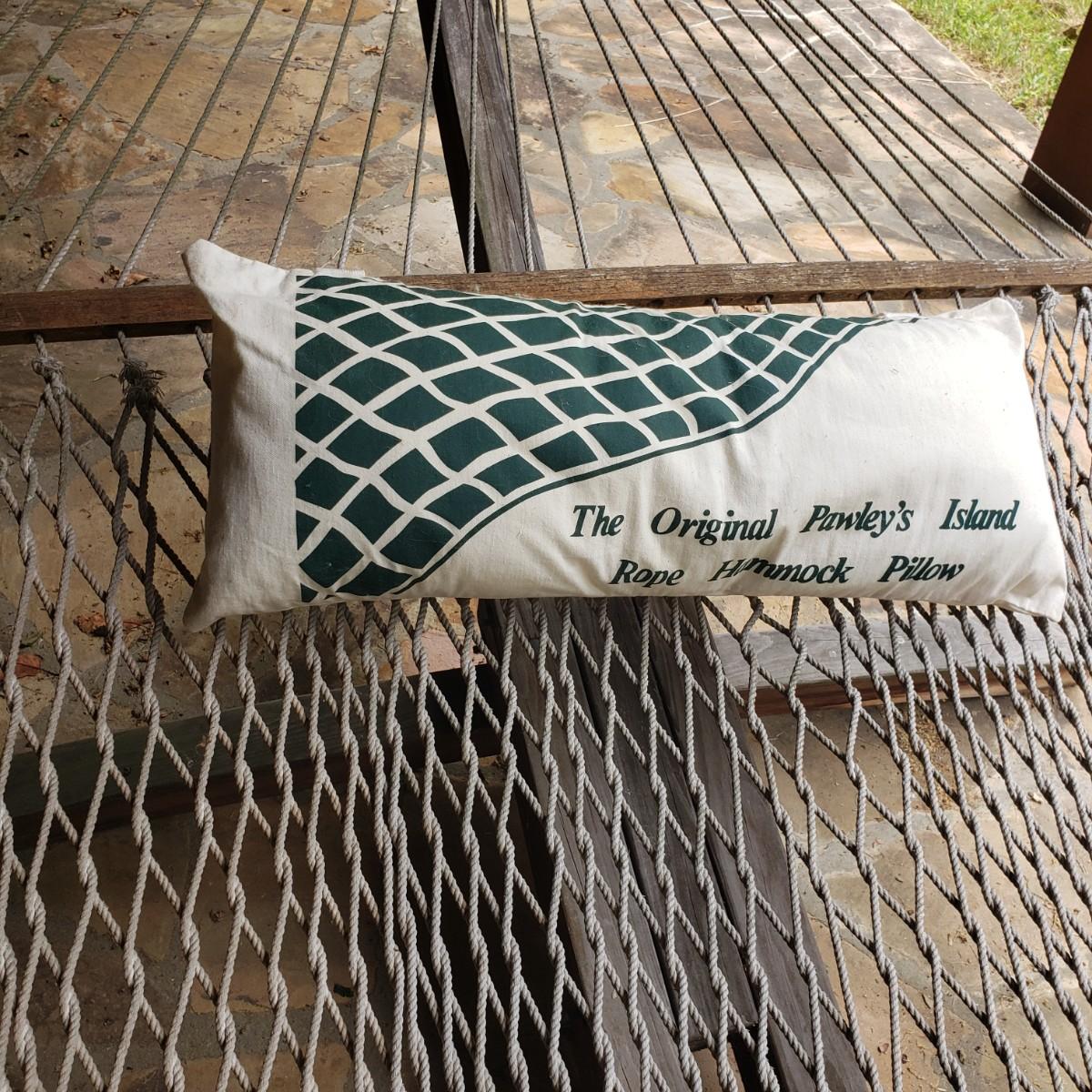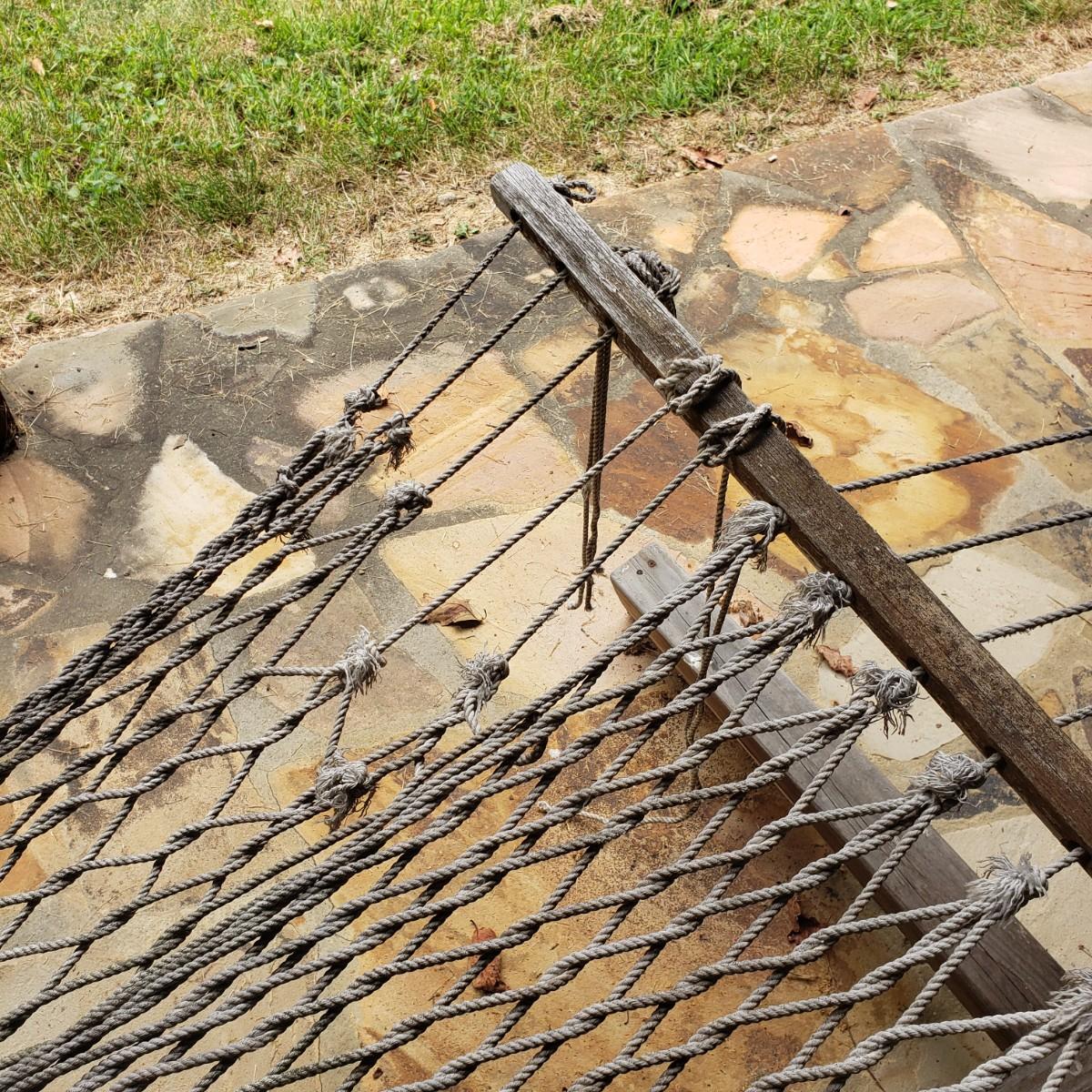 This wooden sleigh style hammock measures 184" x 58" x 52"H. The roped hammock attaches with chains and "S" hooks. The hammock has some rope broken, see pictures. It also comes with a head pillow.