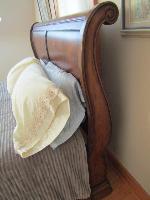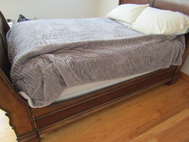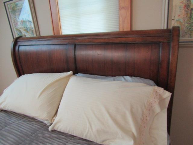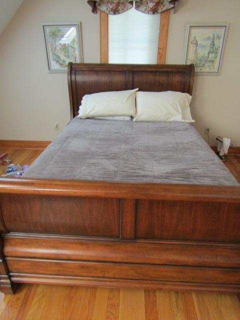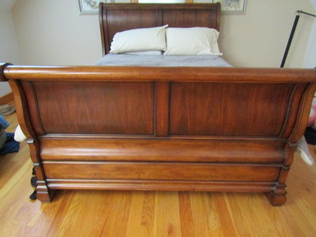 Wooden Sleigh Style Bed- Queen Size. No mattress or linens. Bring tools to disassemble item. Item is upstairs.