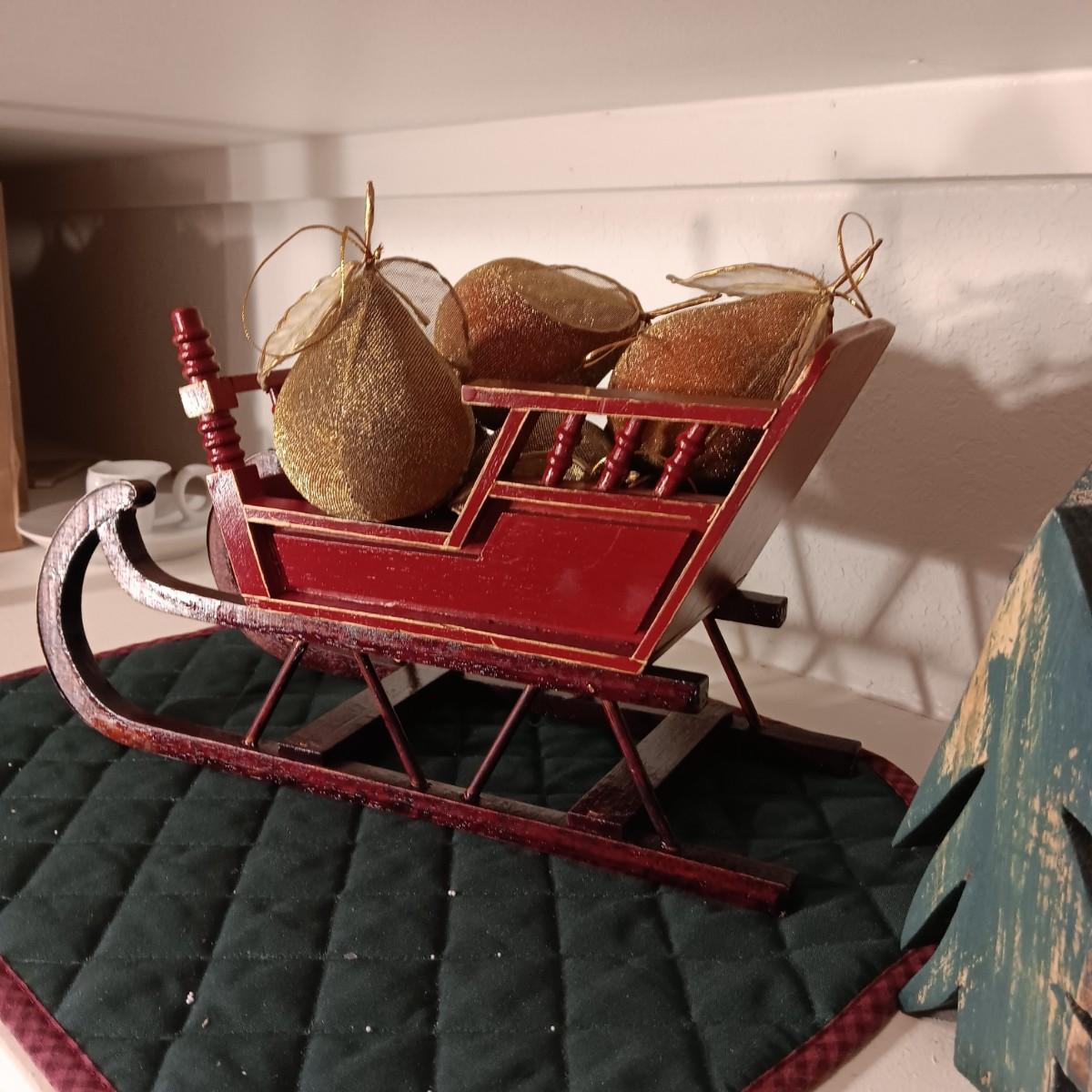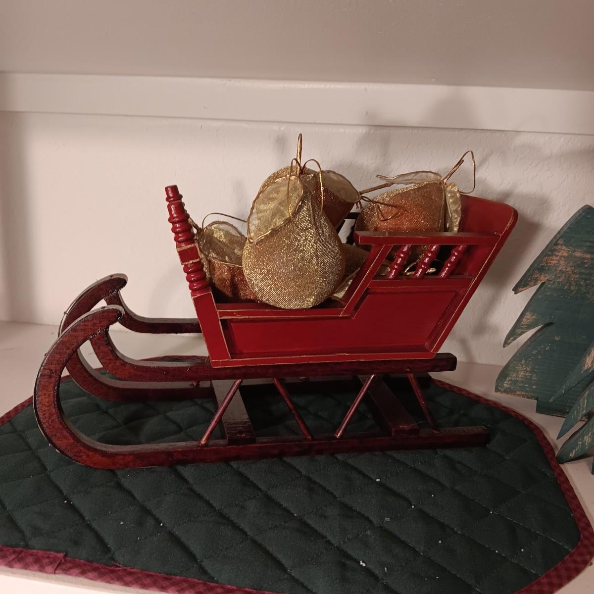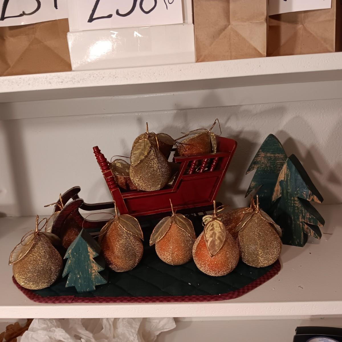 WOODEN SLEIGH WITH SATIN LIKE PEAR ORNAMENTS AND WOODEN TREES