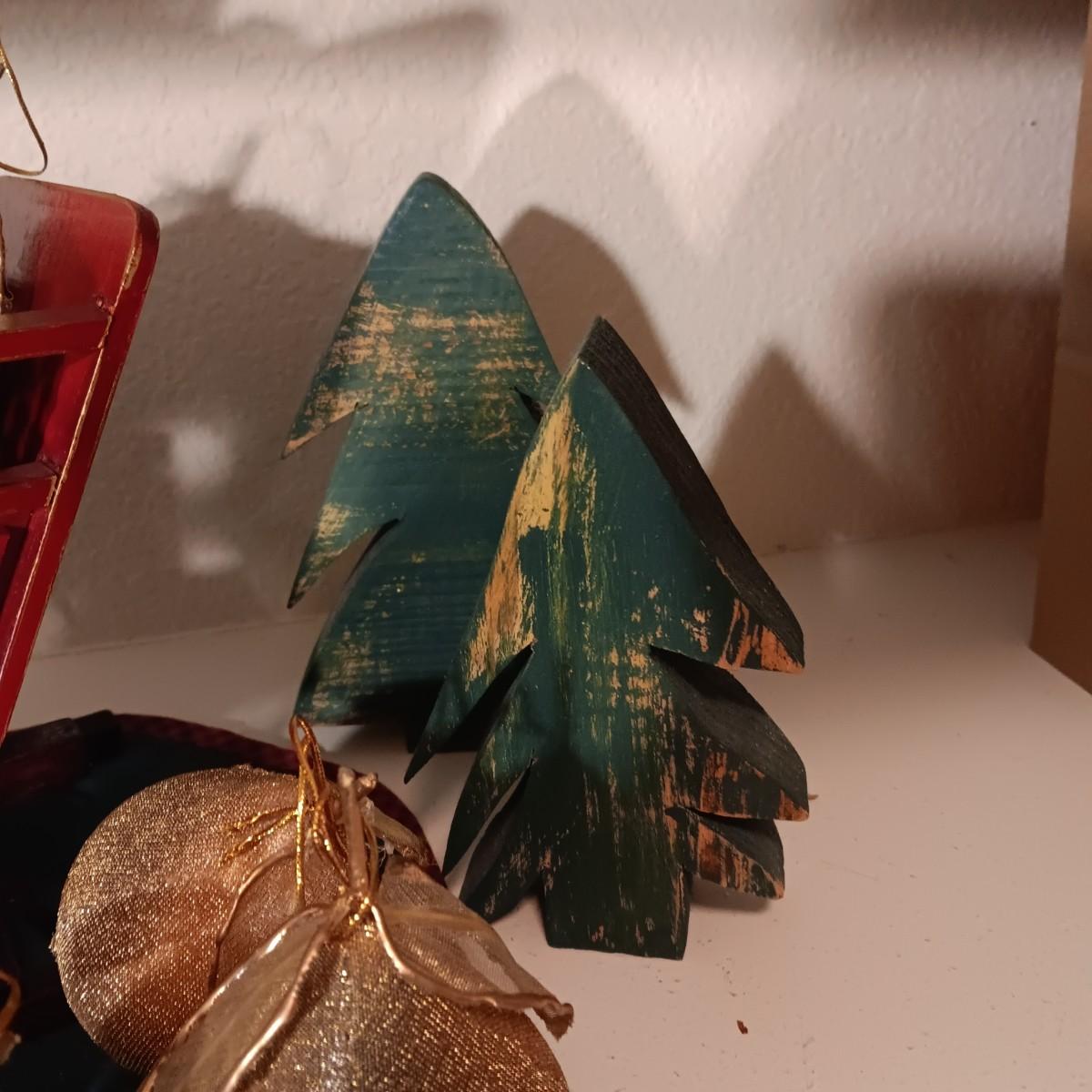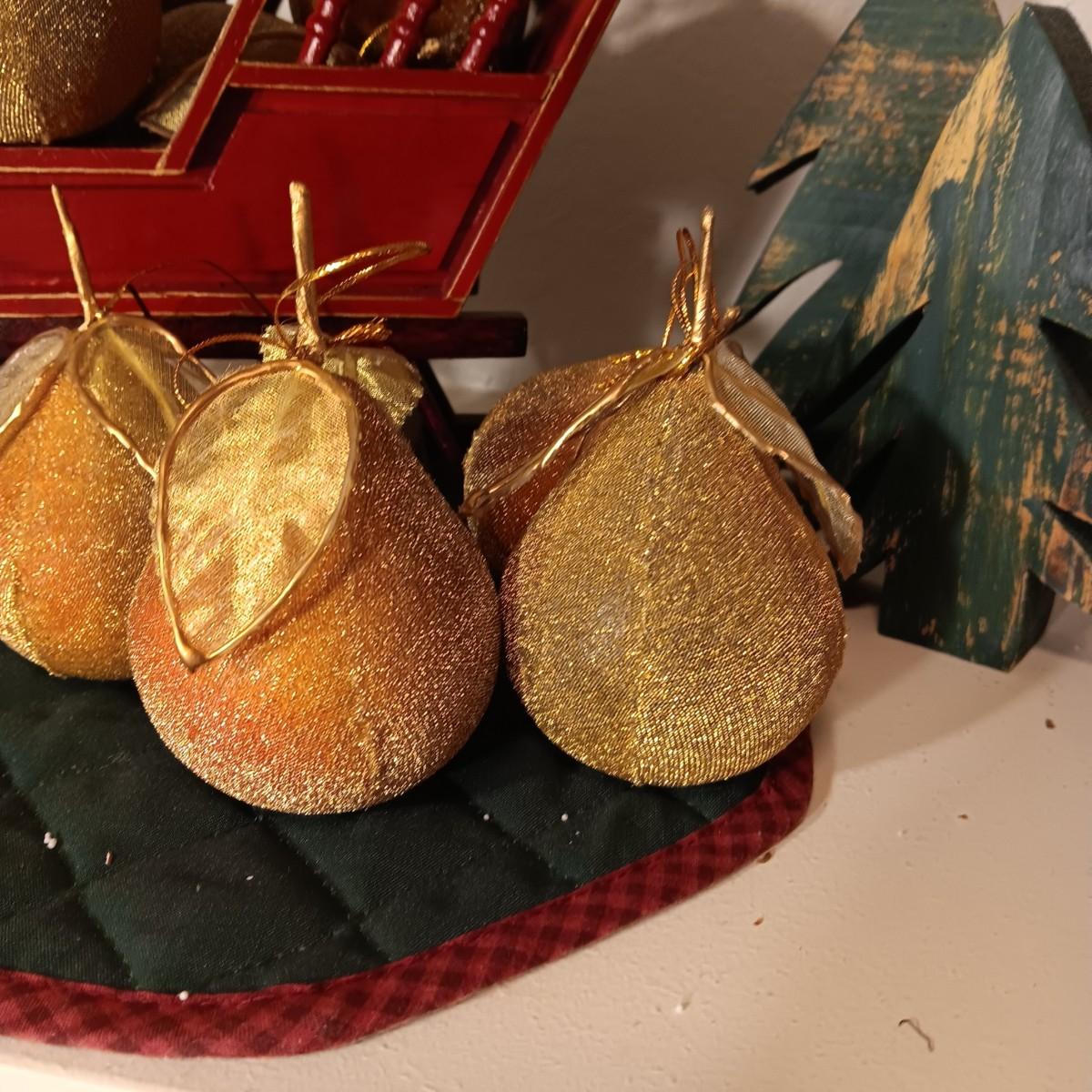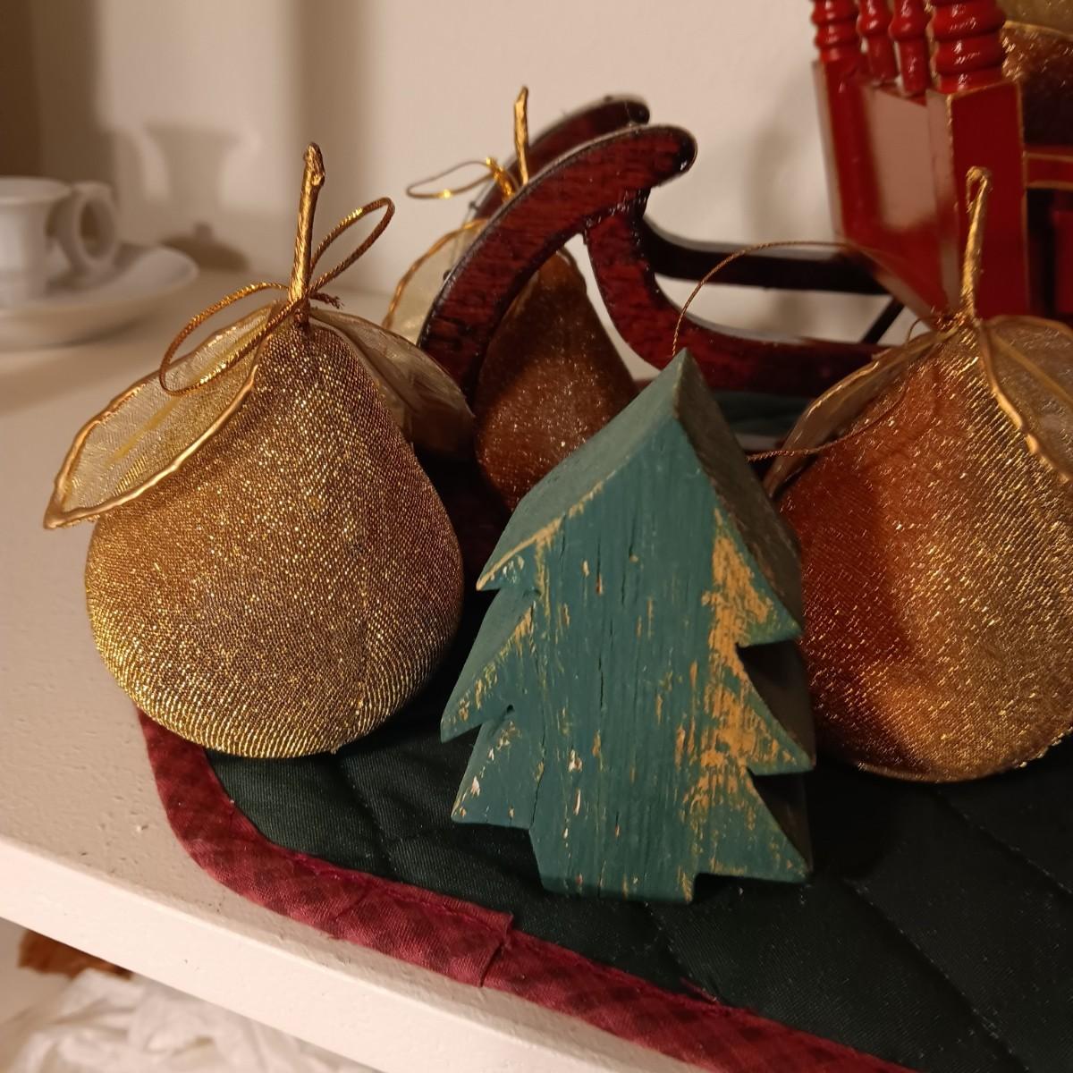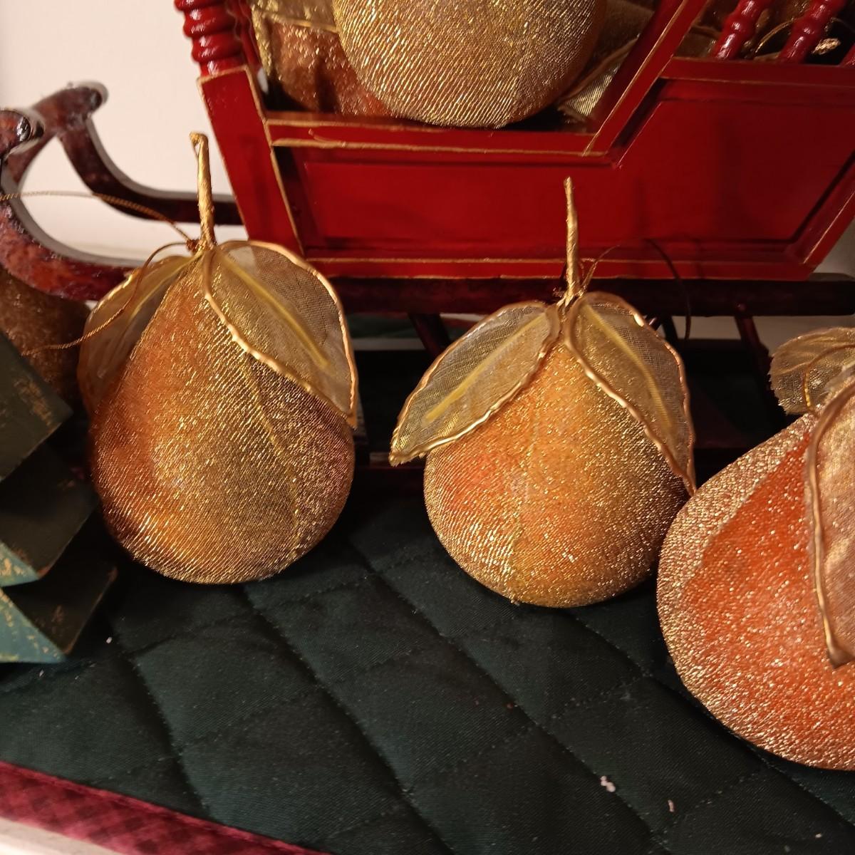WOODEN SLEIGH WITH SATIN LIKE PEAR ORNAMENTS AND WOODEN TREES