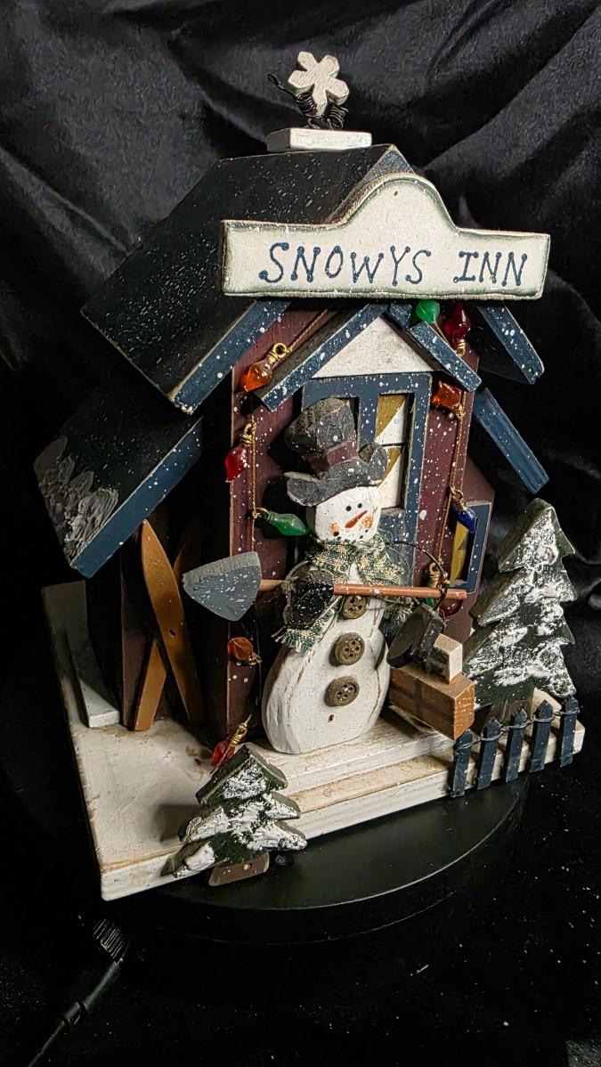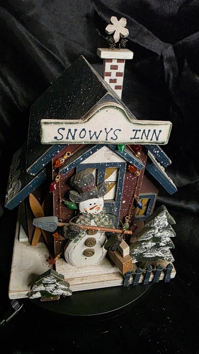Wooden Snowy’s Inn Winter Cabin Décor – Hand-Crafted Snowman Lodge Scene