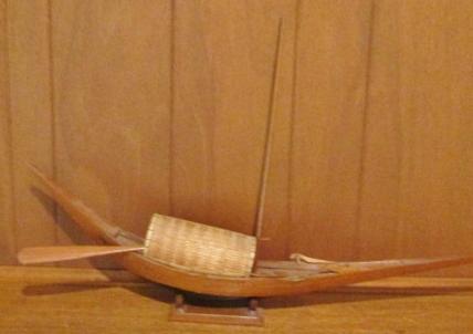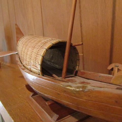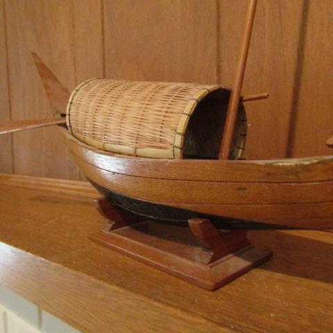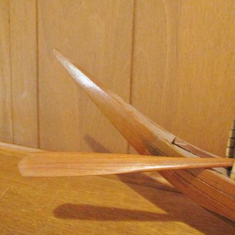 ALL WOOD BOAT WITH A STRAW LIKE COVER, 2 WOODEN OARS