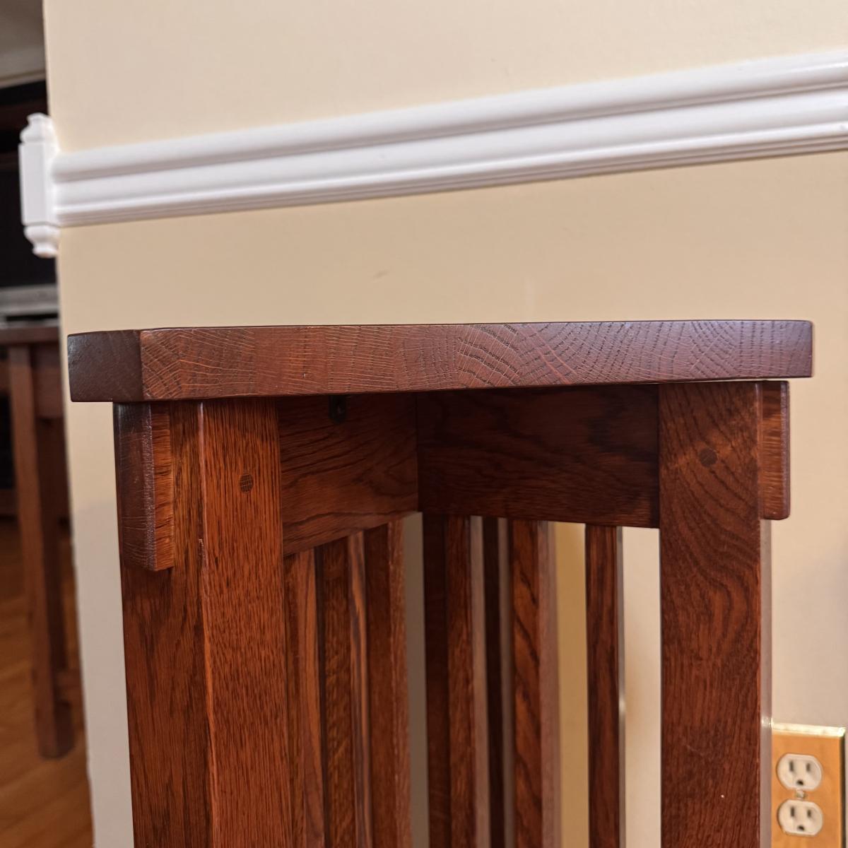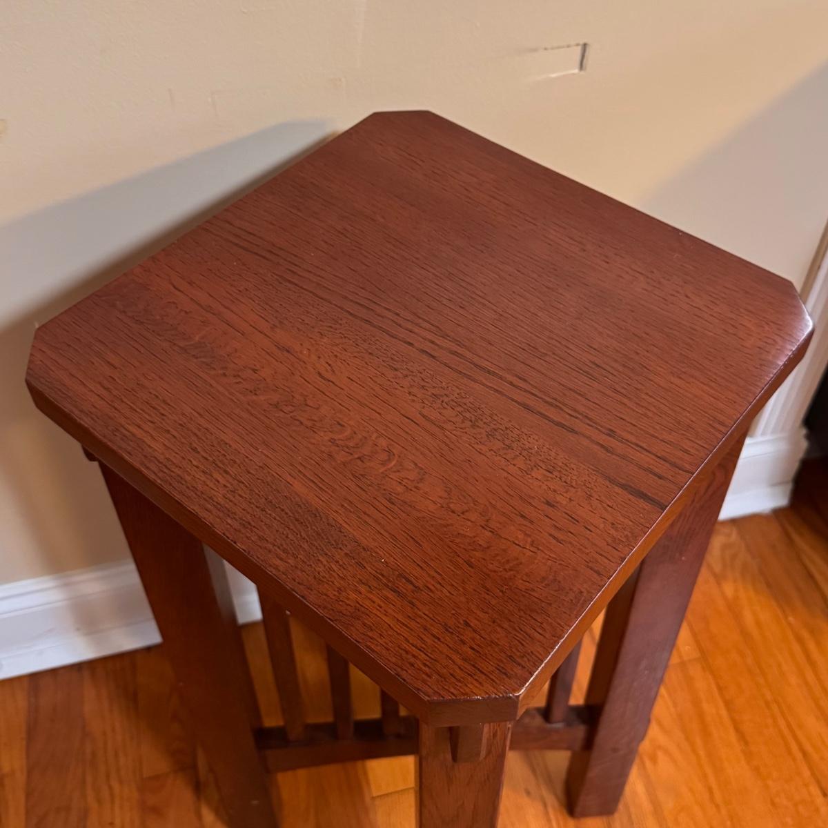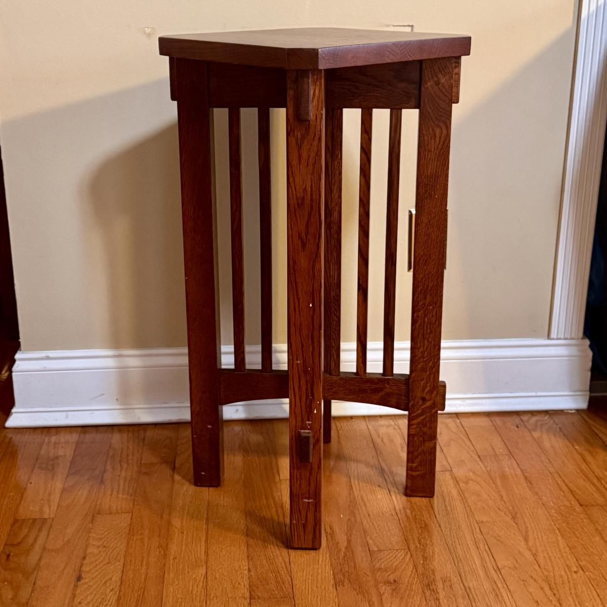 Lot includes one unique solid wooden spindle side table or plant stand. This piece features a slatted interior, with detail at every corner. The side table/plant stand measures 13” x 13” x 27.5”H. There are a few tiny white speckled paint marks on the stand - see picture included. Local pickup only.