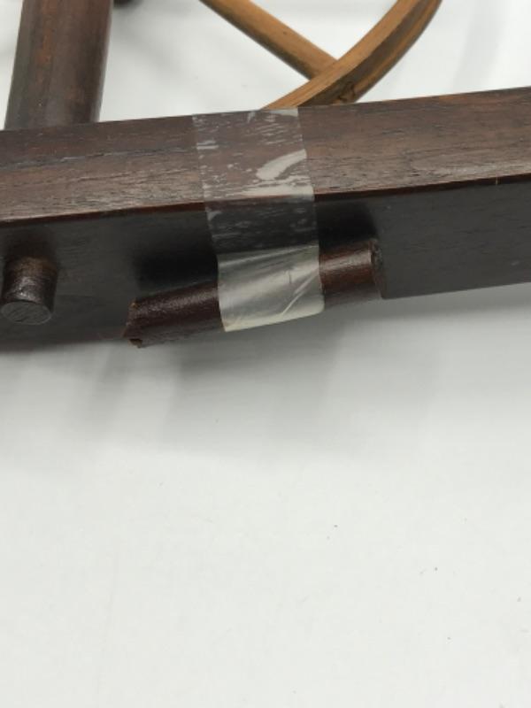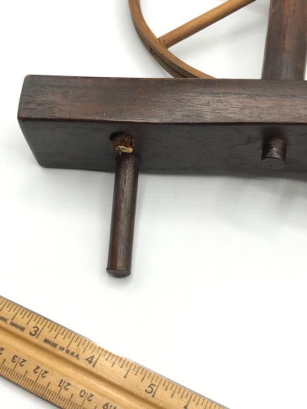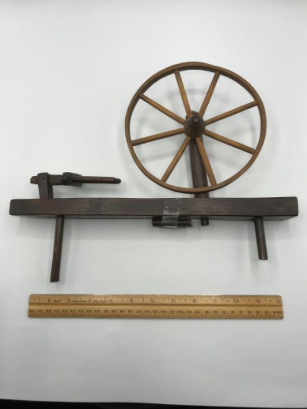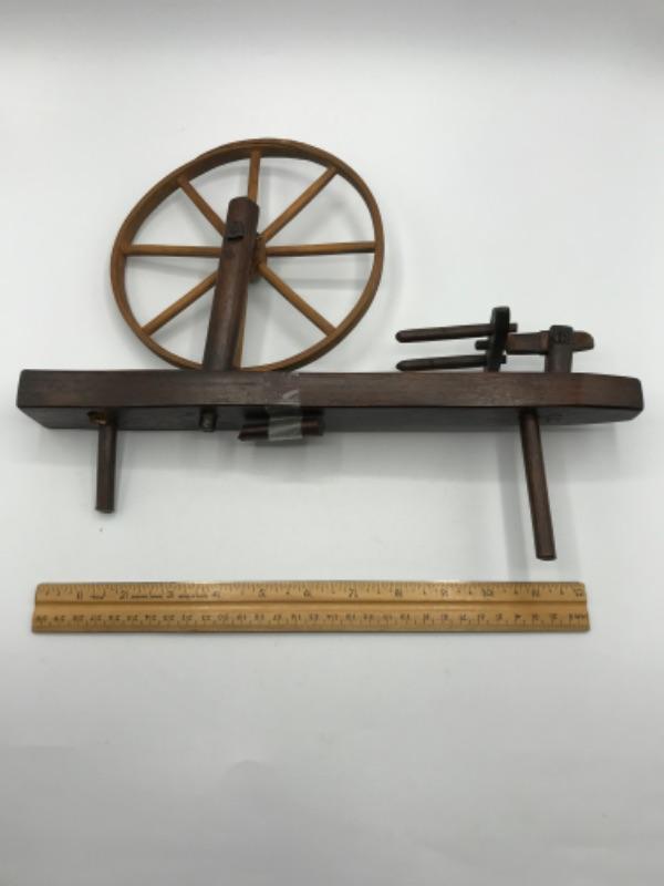 One wooden spinning-wheel for yarn or twine. A repair to reattach one snapped leg will be needed so this item is being sold as-is. Refer to pictures for condition.