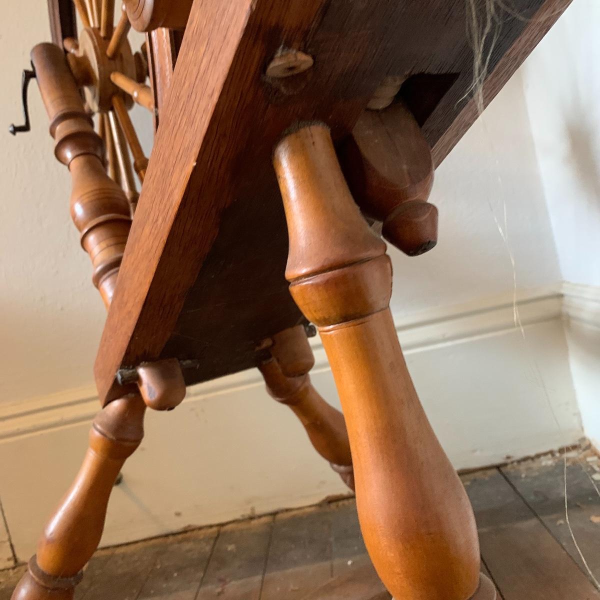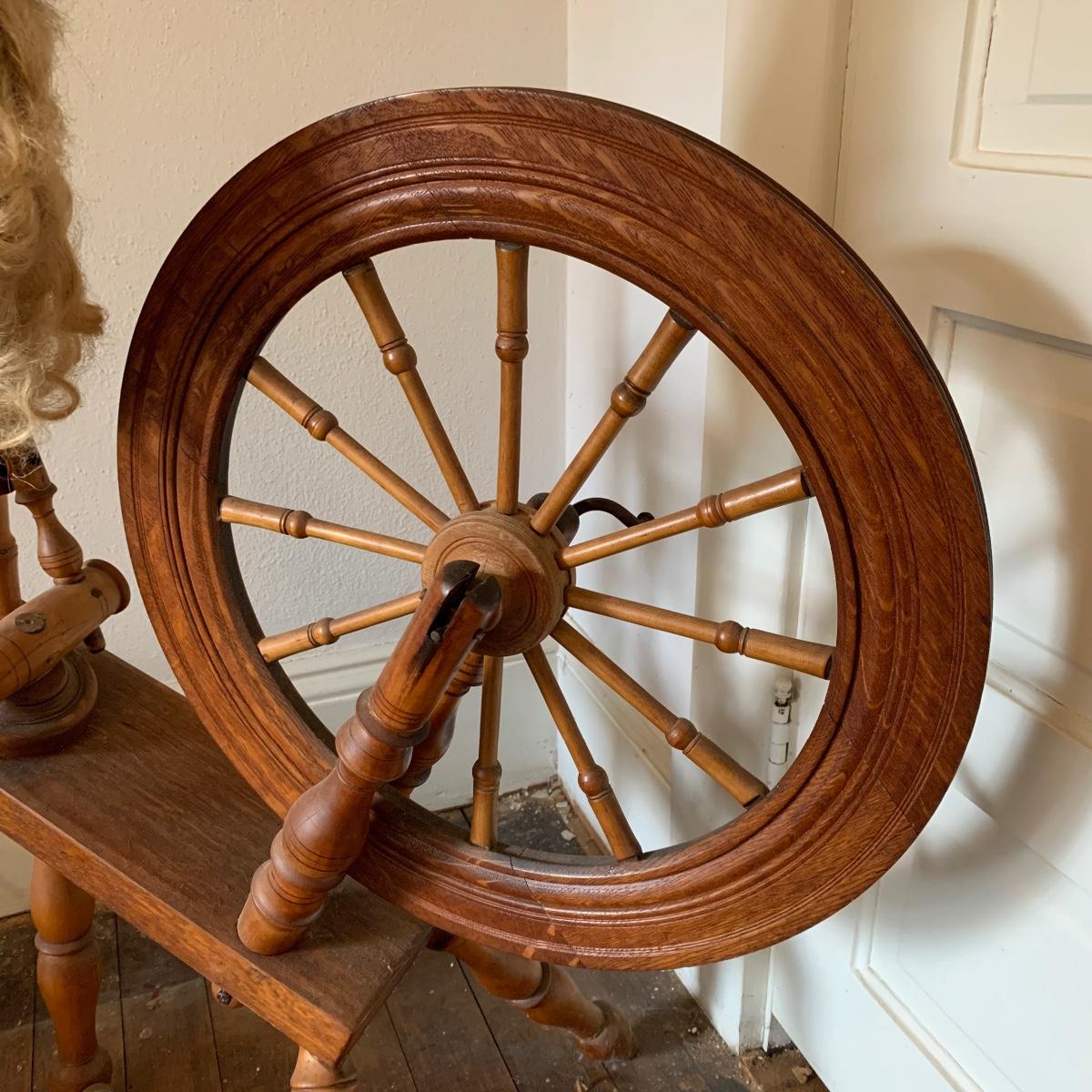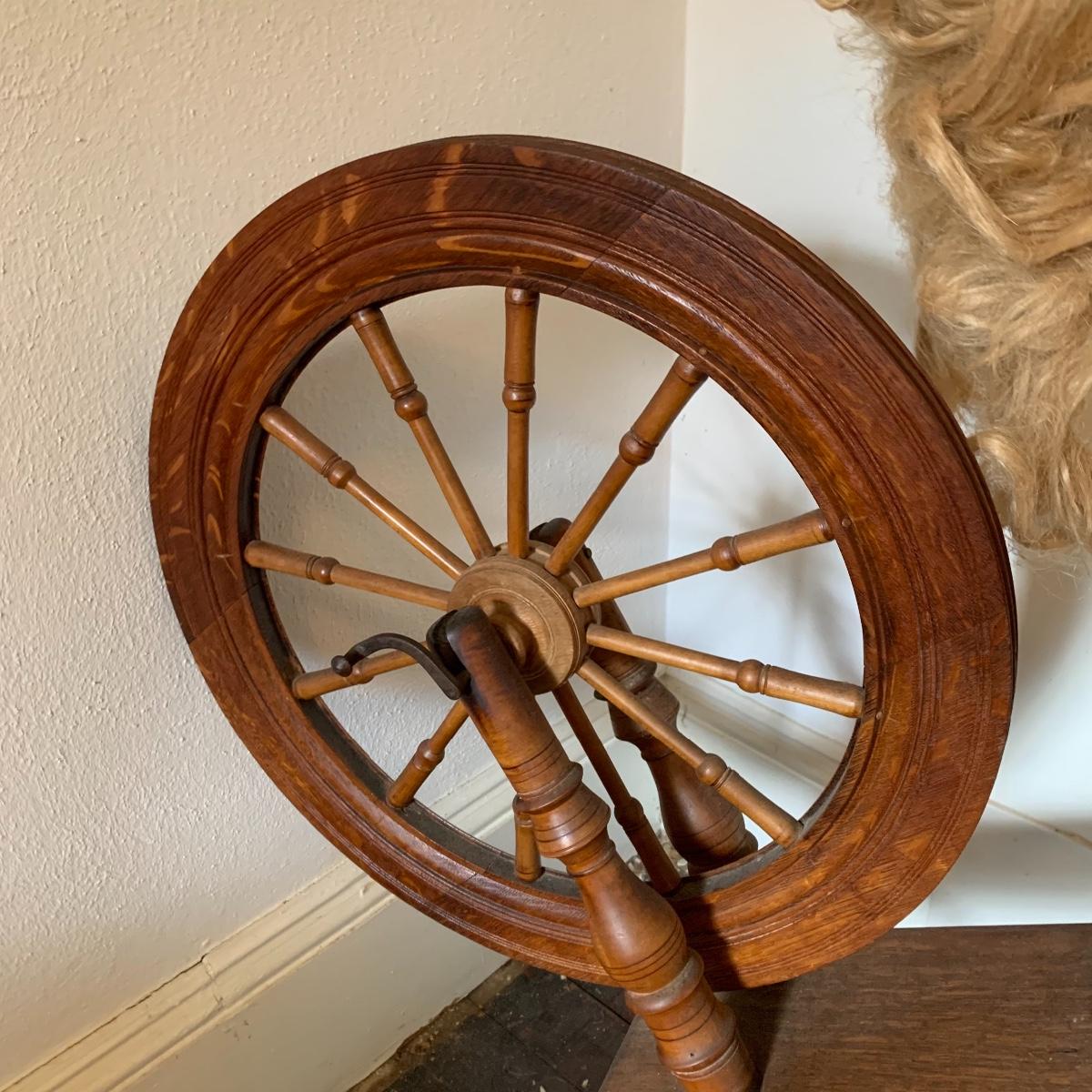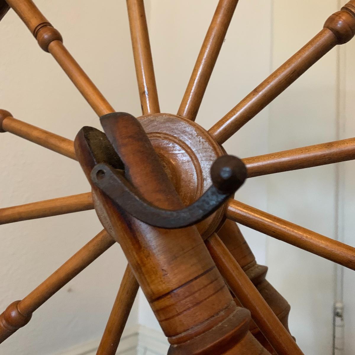 This lot is a wooden spinning wheel. It measures approximately 33” x 20” x 47”. The wheel diameter is 20.5”. It has an iron handle. The item has collected some dust but is in good condition. Local Pickup Only