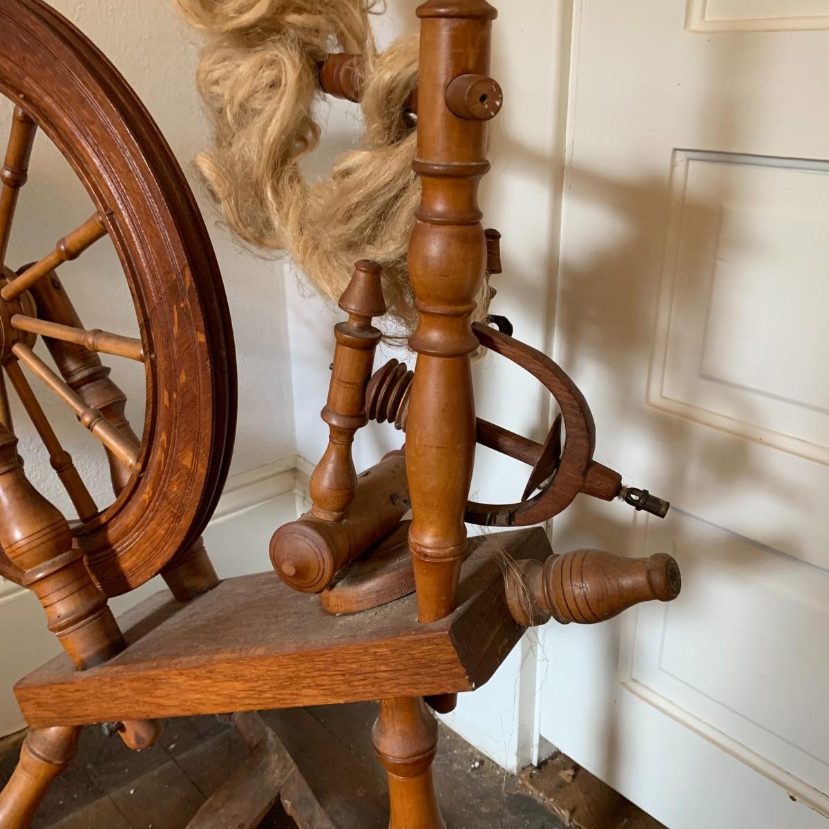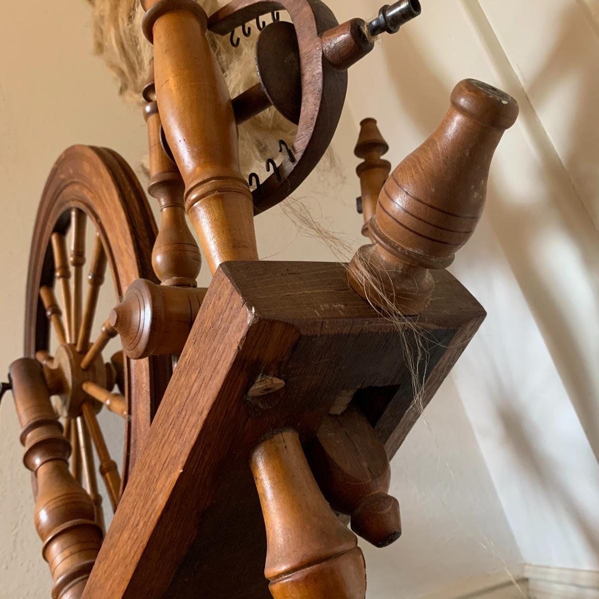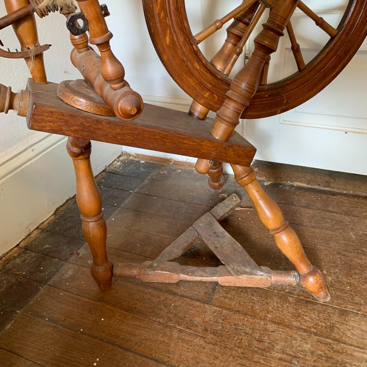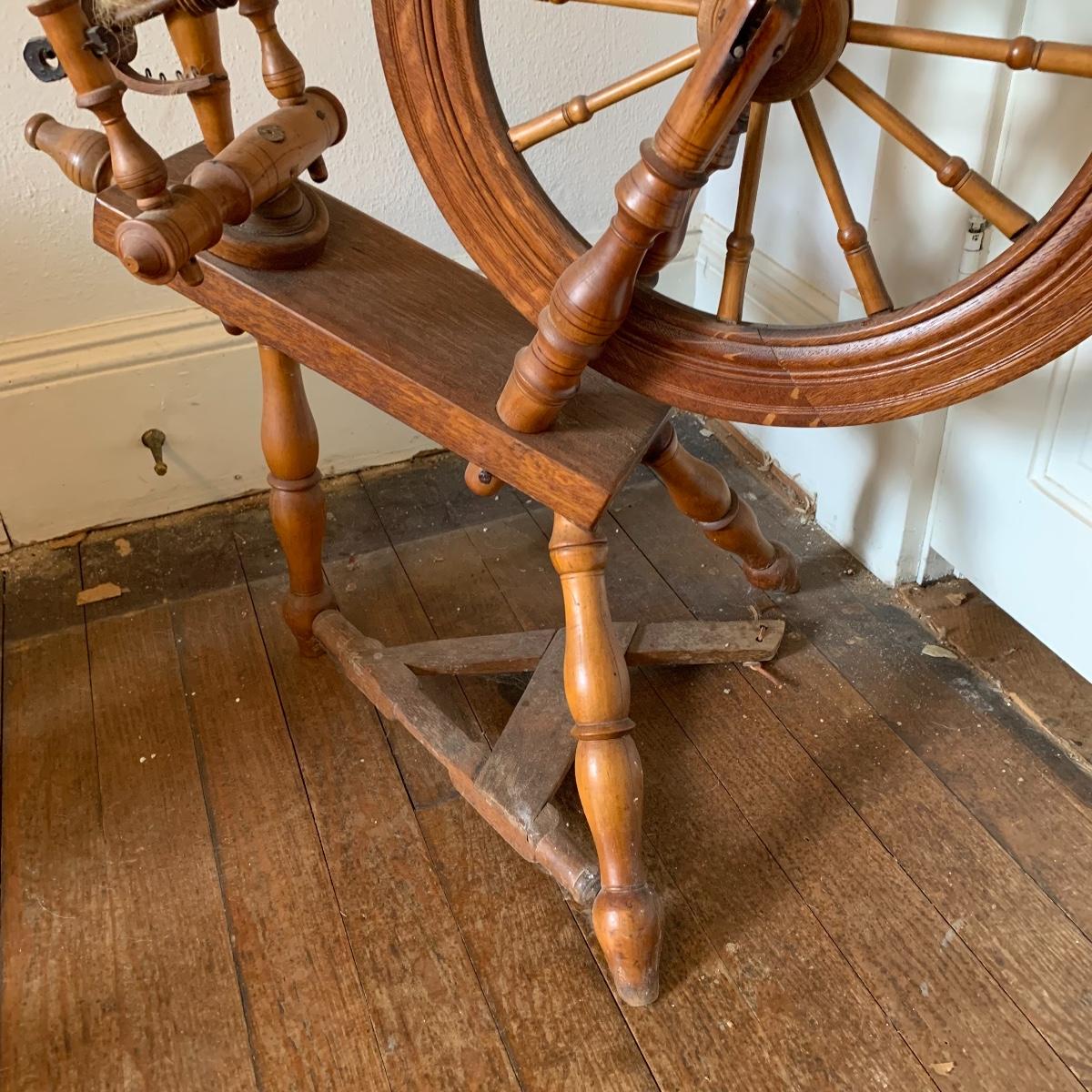 This lot is a wooden spinning wheel. It measures approximately 33” x 20” x 47”. The wheel diameter is 20.5”. It has an iron handle. The item has collected some dust but is in good condition. Local Pickup Only