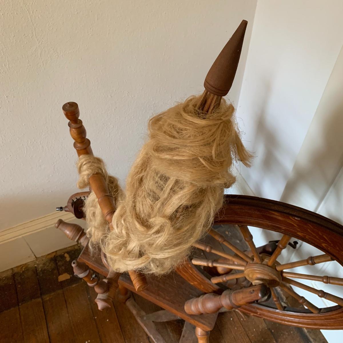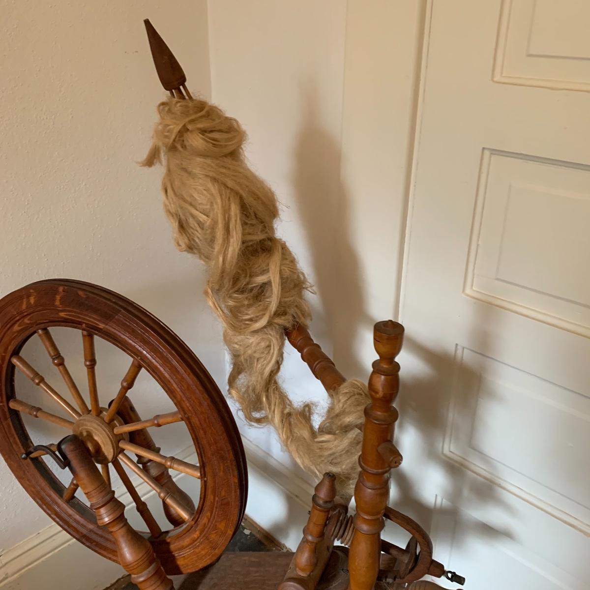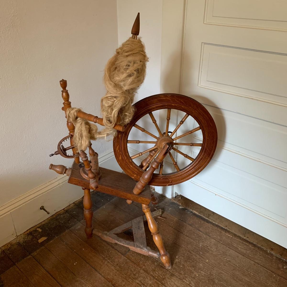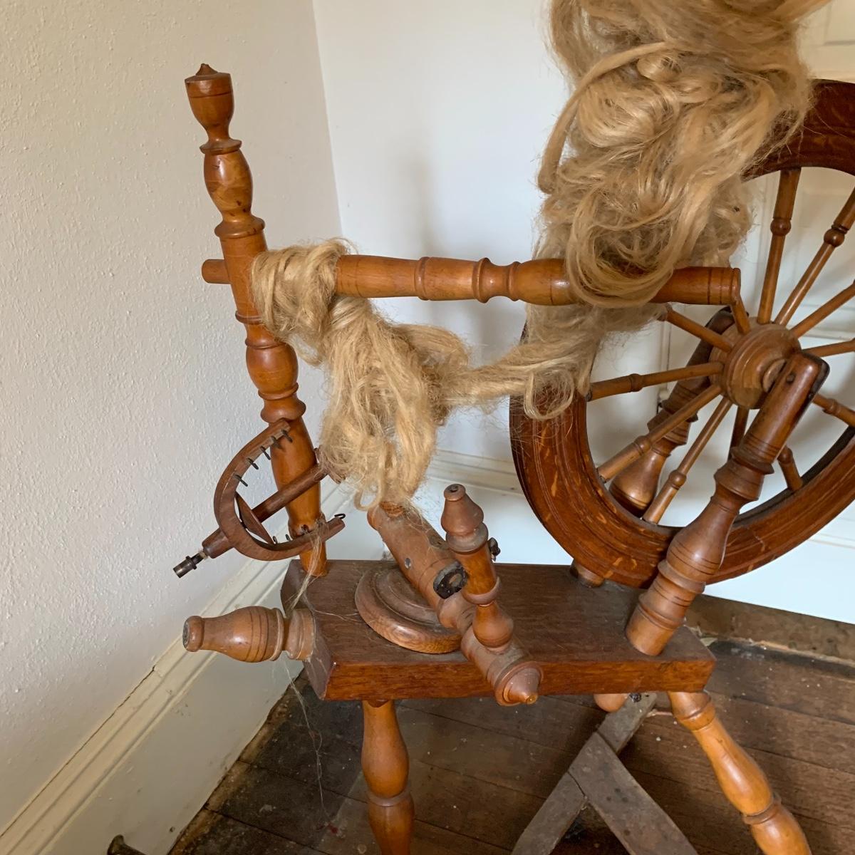 This lot is a wooden spinning wheel. It measures approximately 33” x 20” x 47”. The wheel diameter is 20.5”. It has an iron handle. The item has collected some dust but is in good condition. Local Pickup Only
