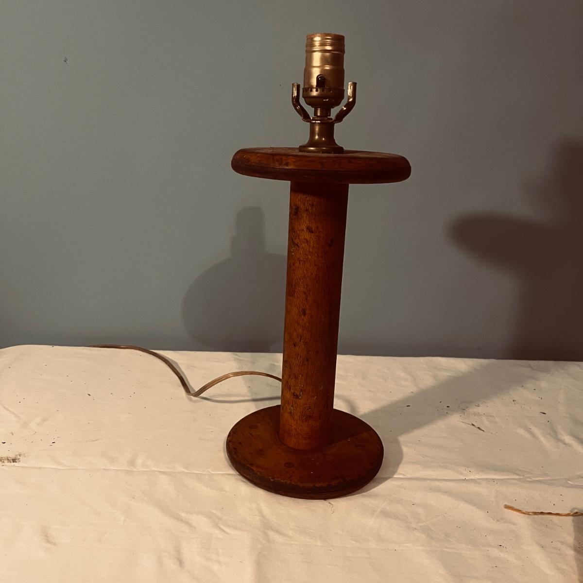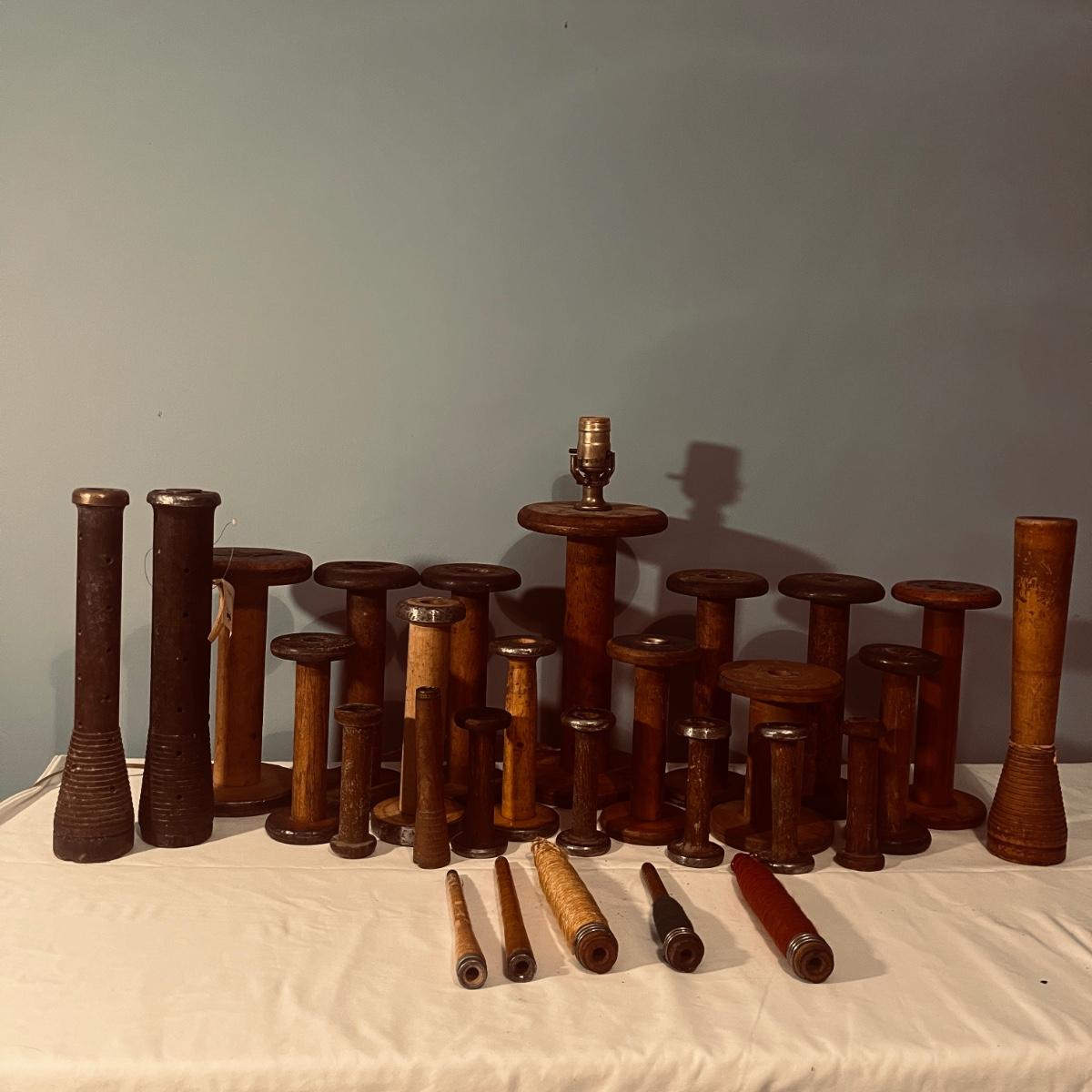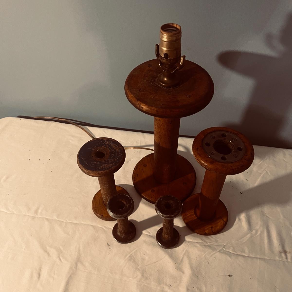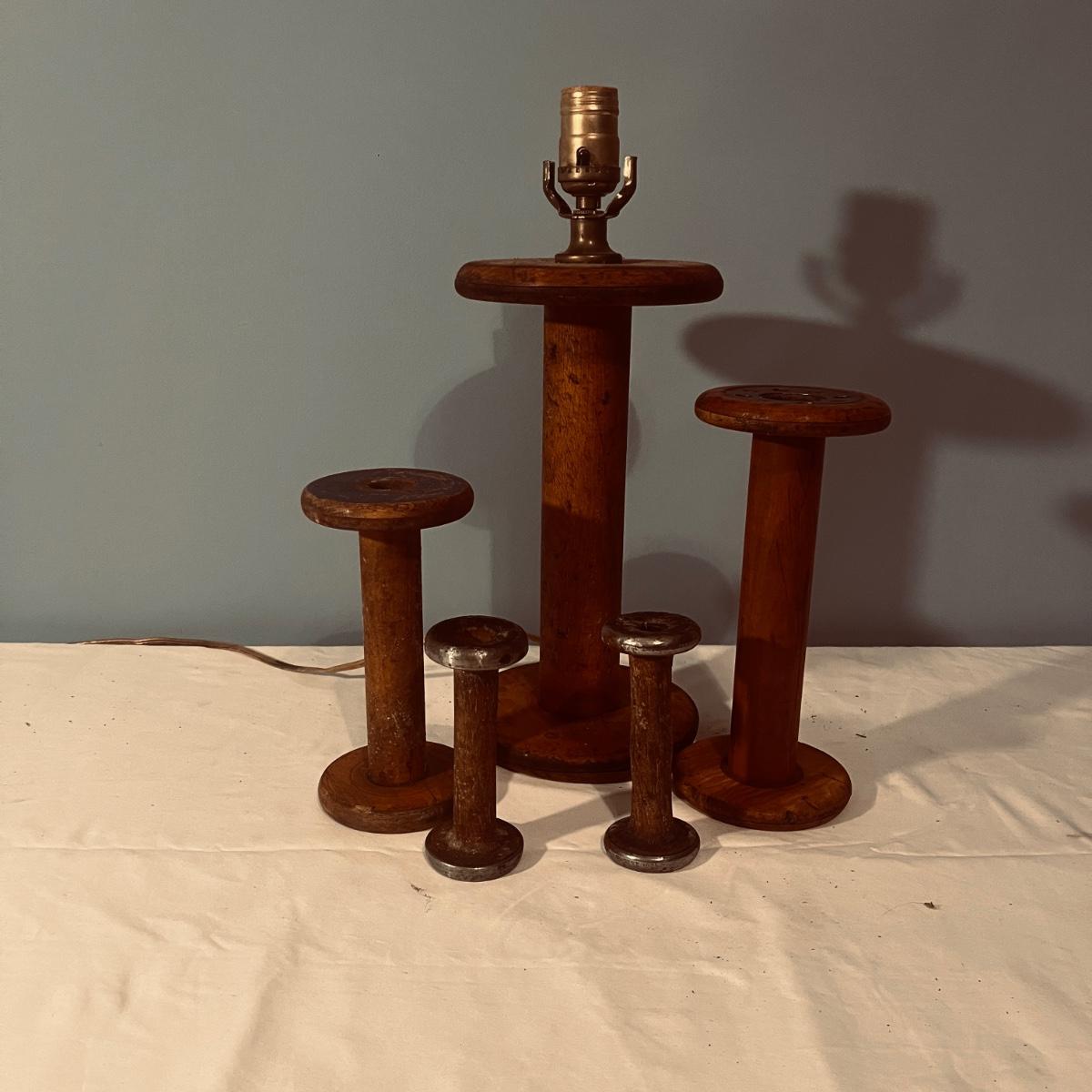 Lot includes over 15 wooden spools in a variety of sizes, over five bobbins and one spool made into a lamp. Lamp measures 6”D x 16”H. Lamp did not power on when plugged in.