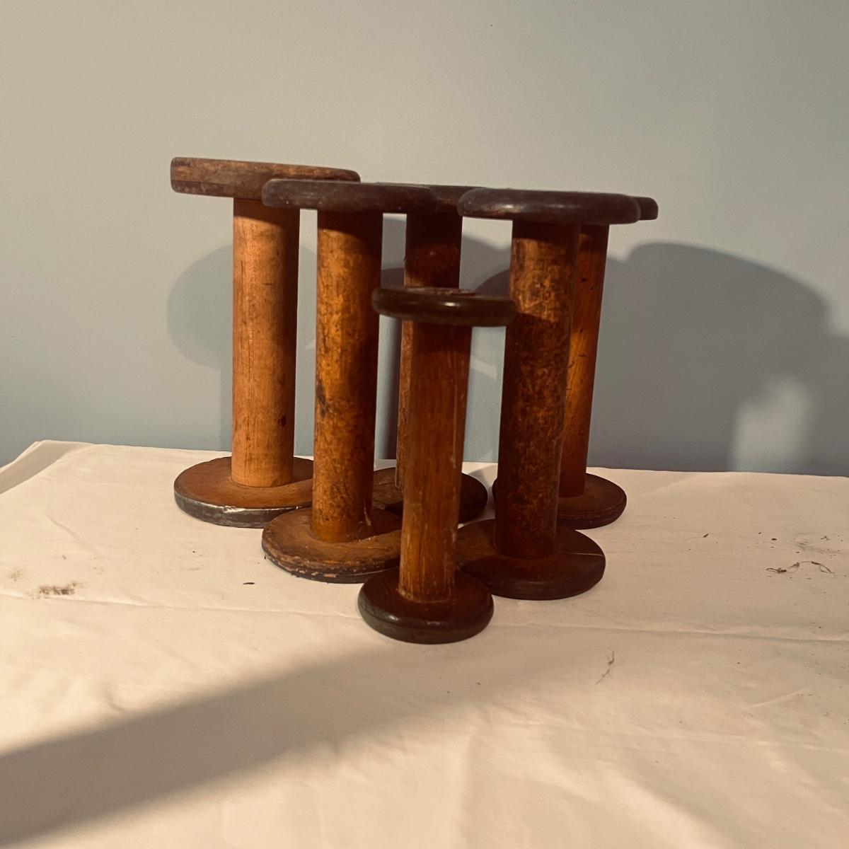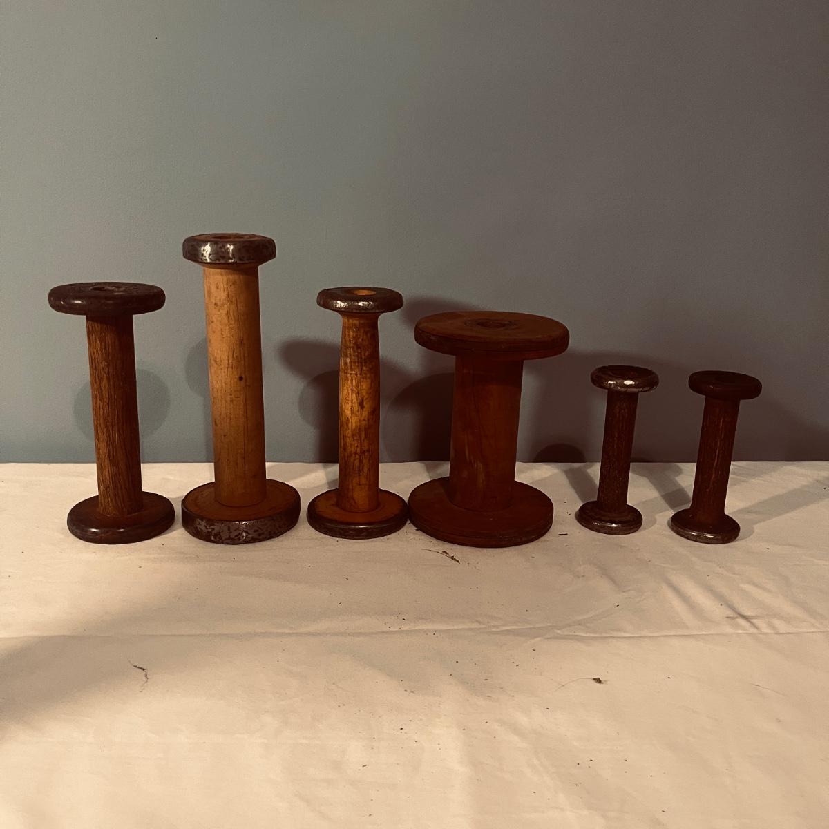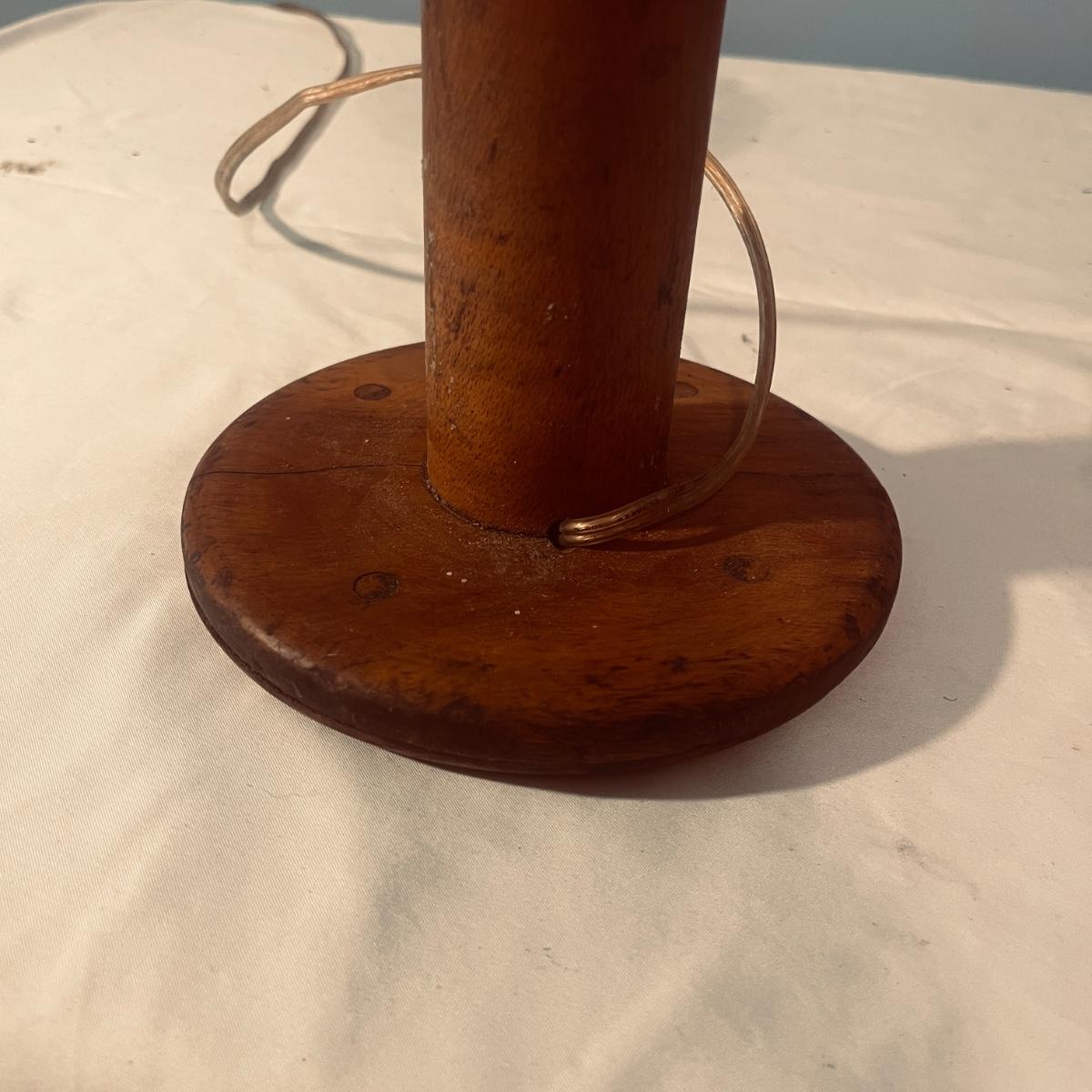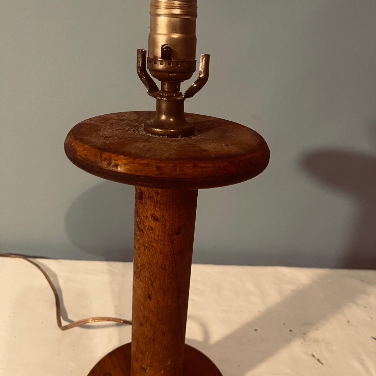 Lot includes over 15 wooden spools in a variety of sizes, over five bobbins and one spool made into a lamp. Lamp measures 6”D x 16”H. Lamp did not power on when plugged in.