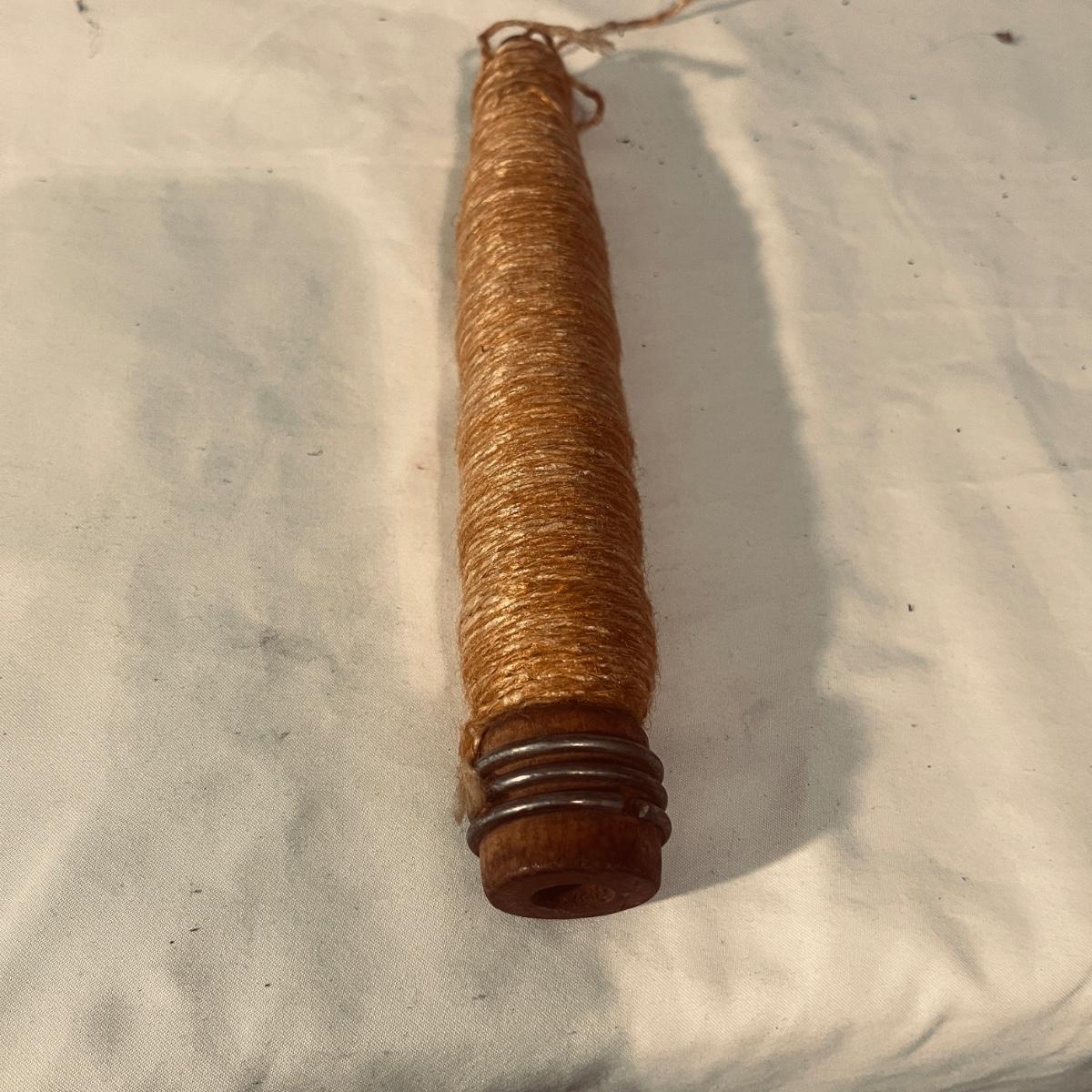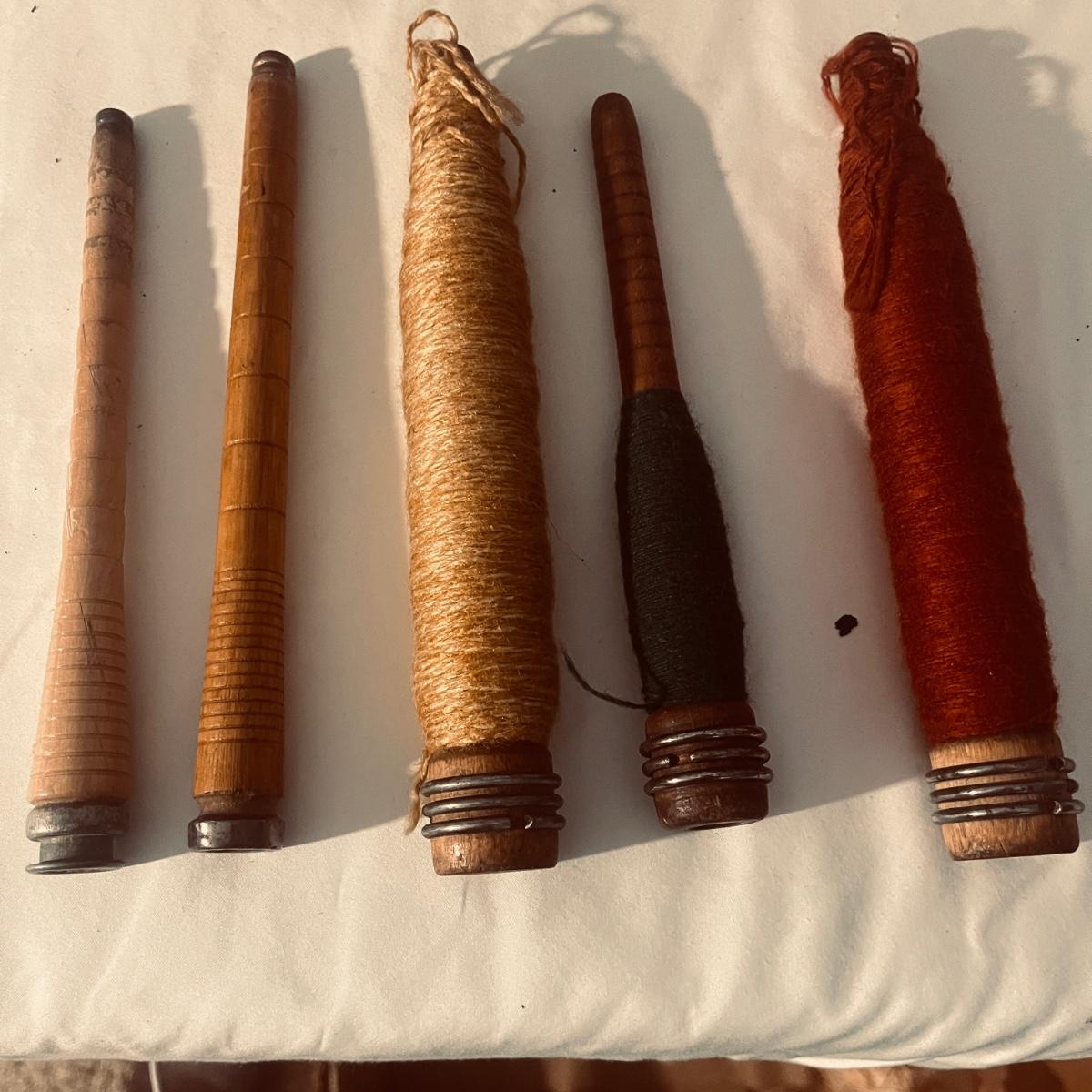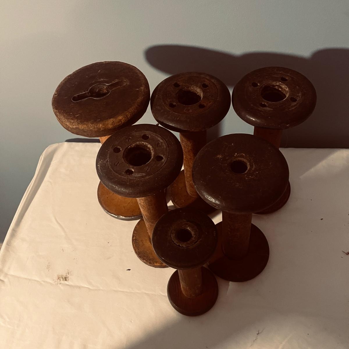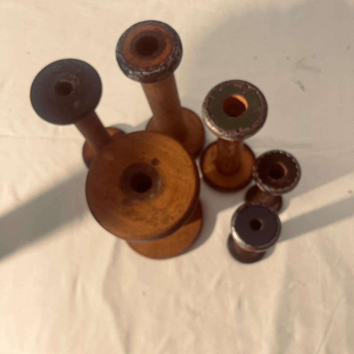 Lot includes over 15 wooden spools in a variety of sizes, over five bobbins and one spool made into a lamp. Lamp measures 6”D x 16”H. Lamp did not power on when plugged in.