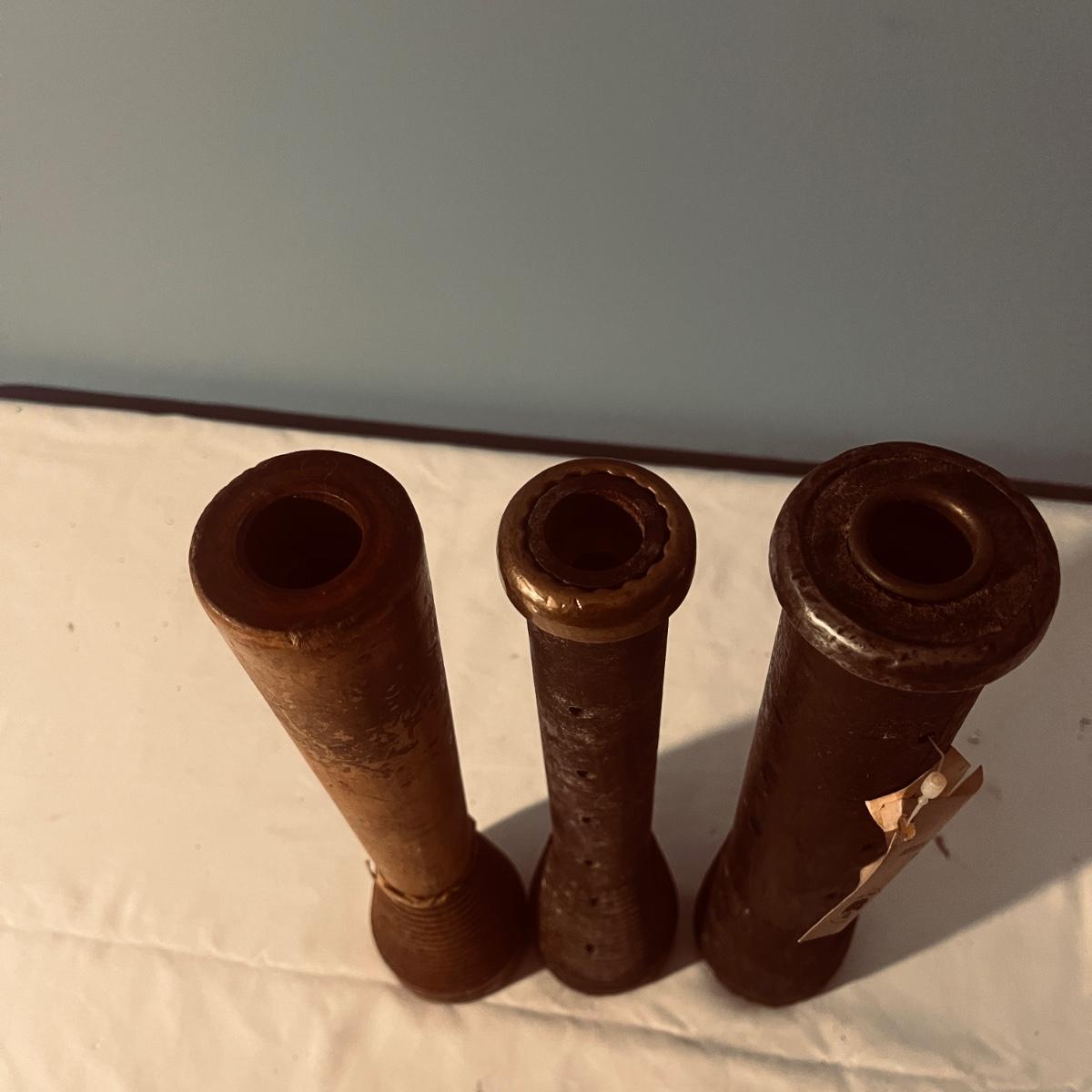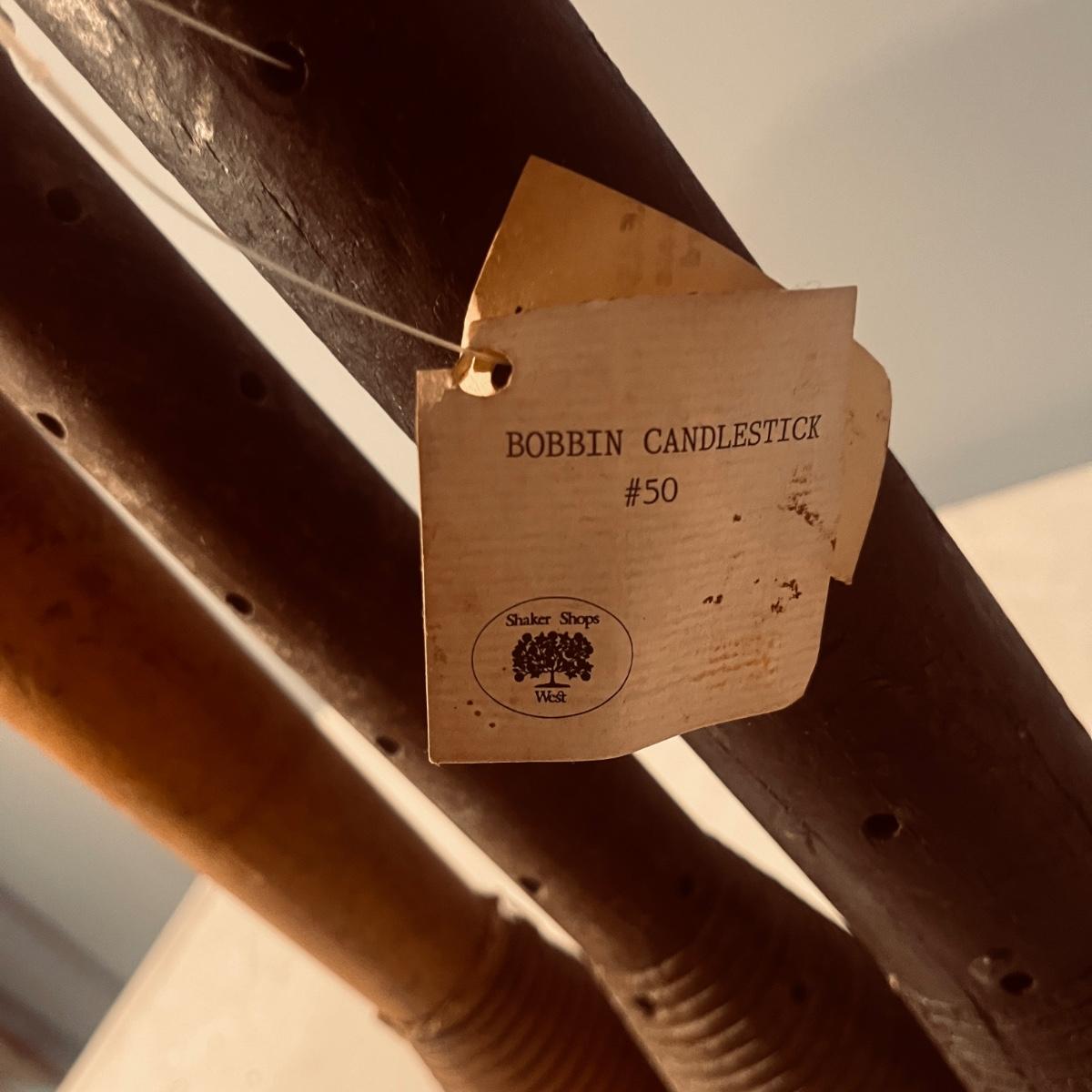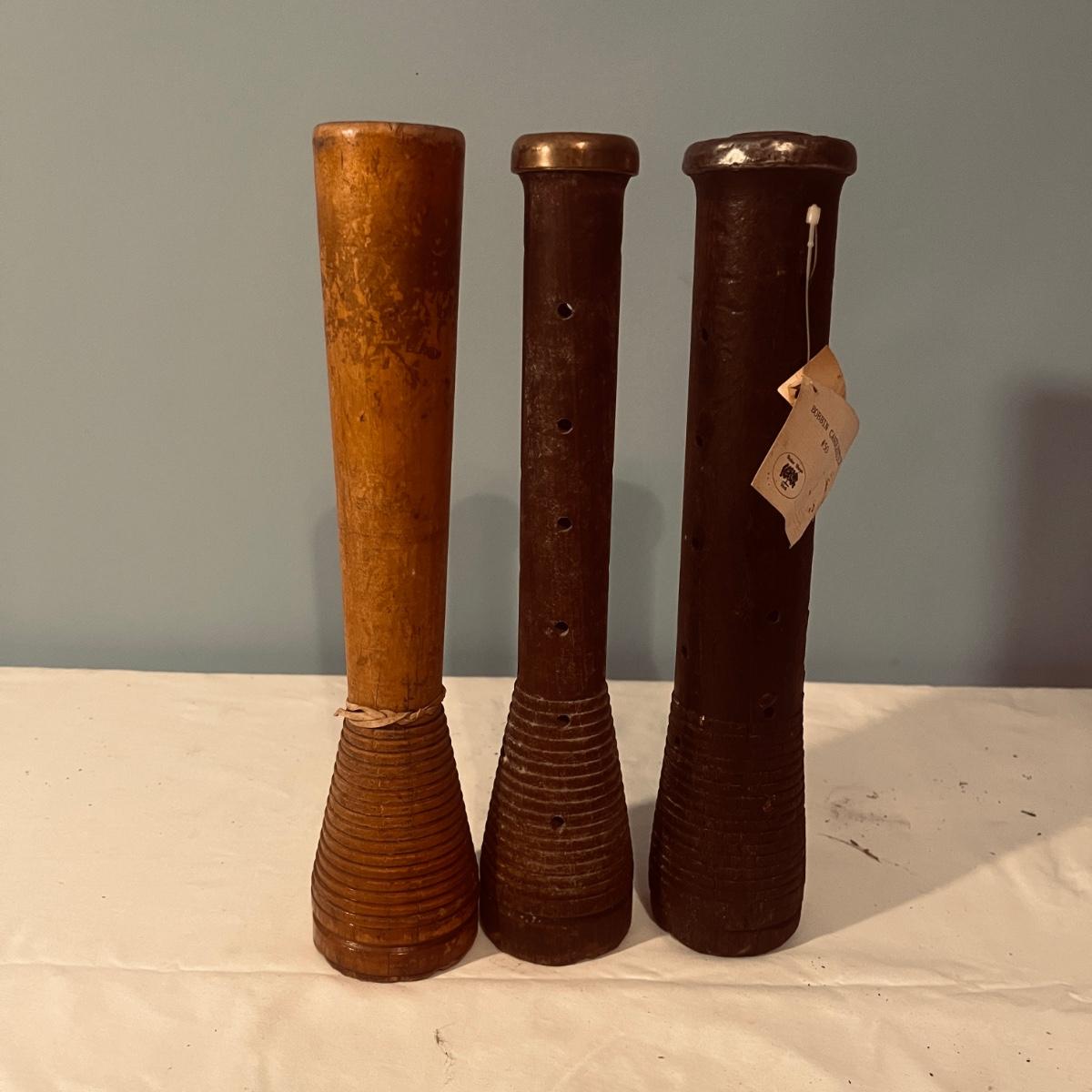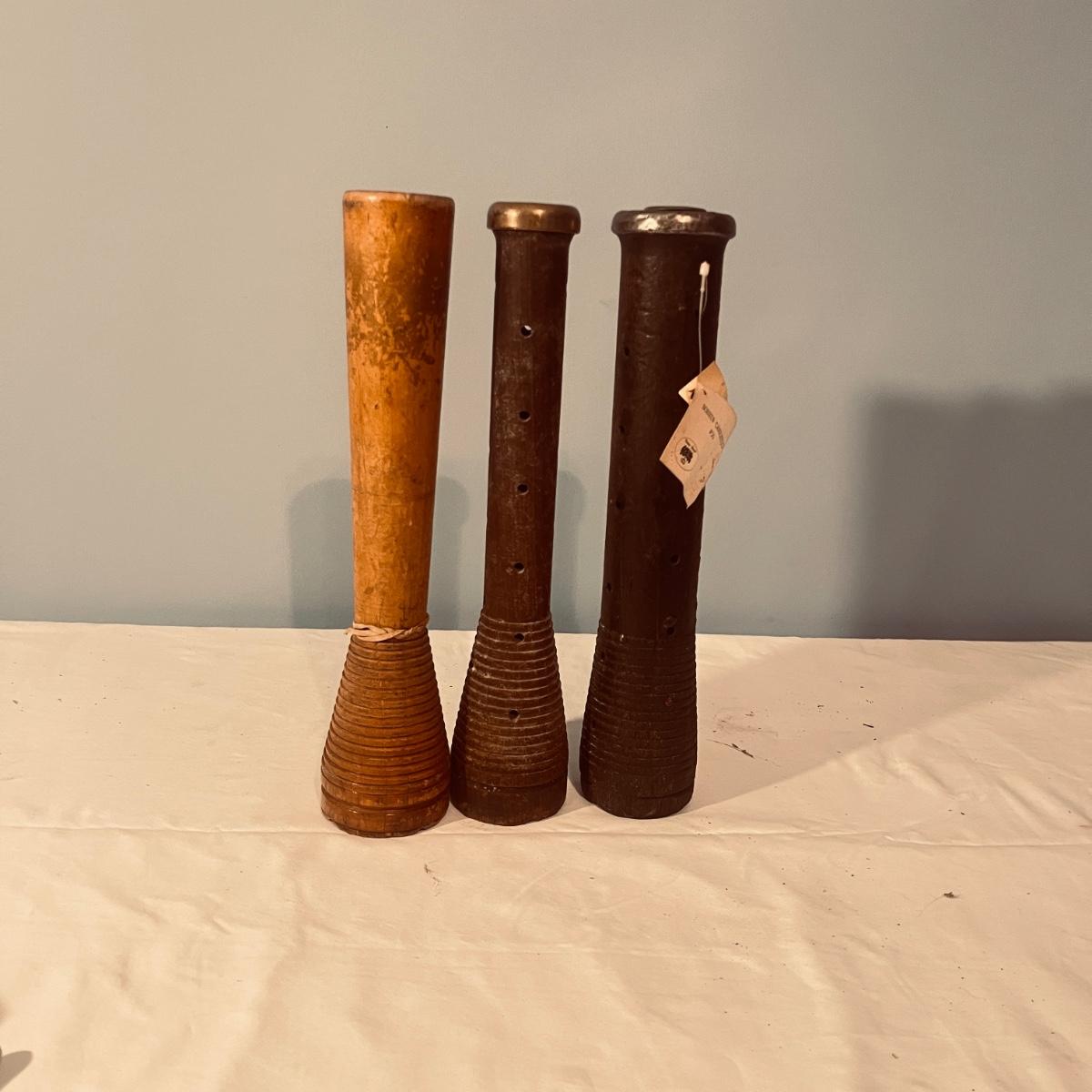 Lot includes over 15 wooden spools in a variety of sizes, over five bobbins and one spool made into a lamp. Lamp measures 6”D x 16”H. Lamp did not power on when plugged in.