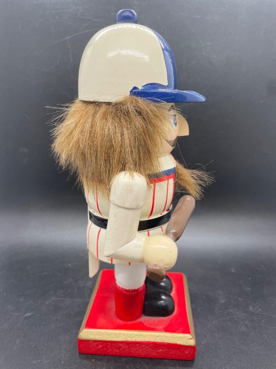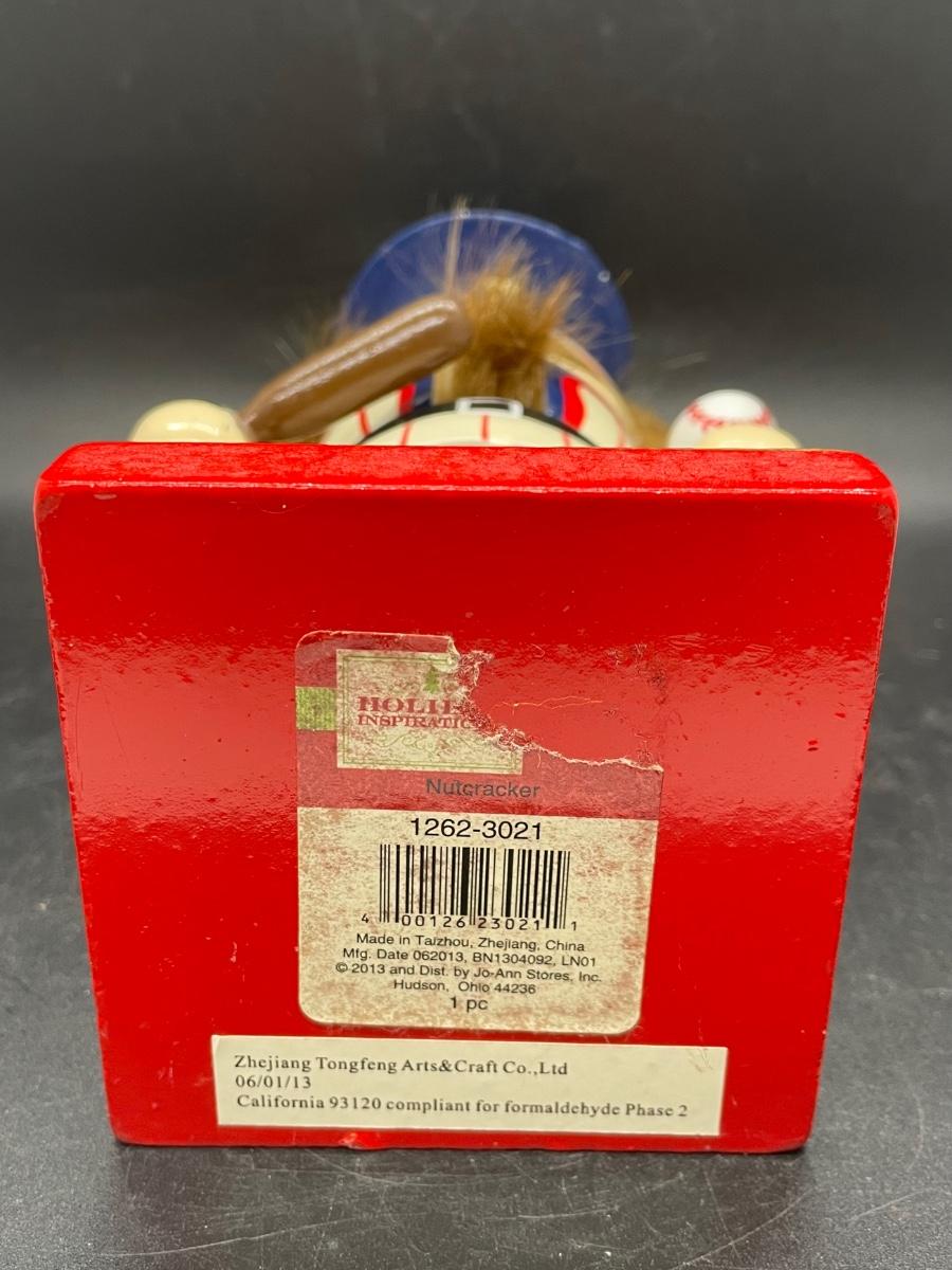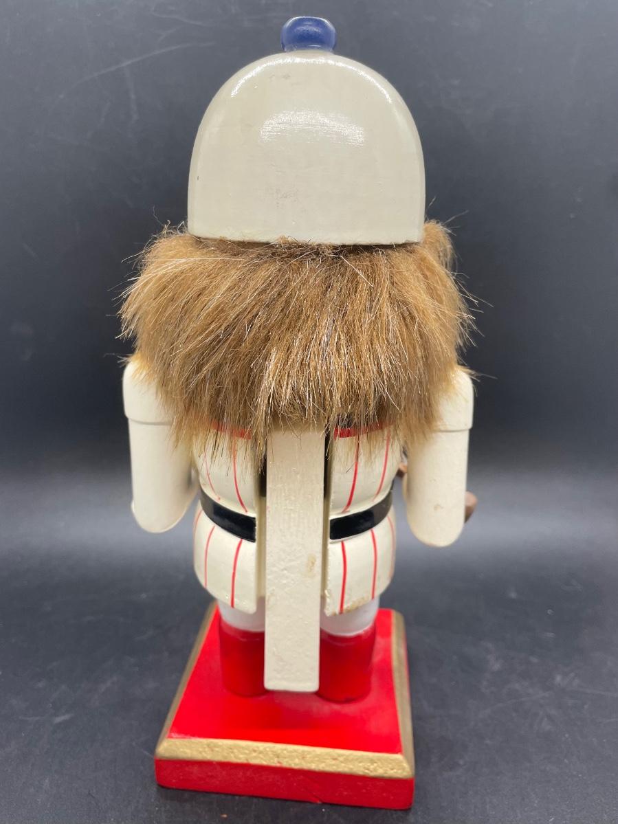 This nutcracker is in great condition. It has no noticeable damages to it, just small spots of discoloration here and there. The item is approximately 9” tall. It was made in Taizhou, Zhejiang, China.