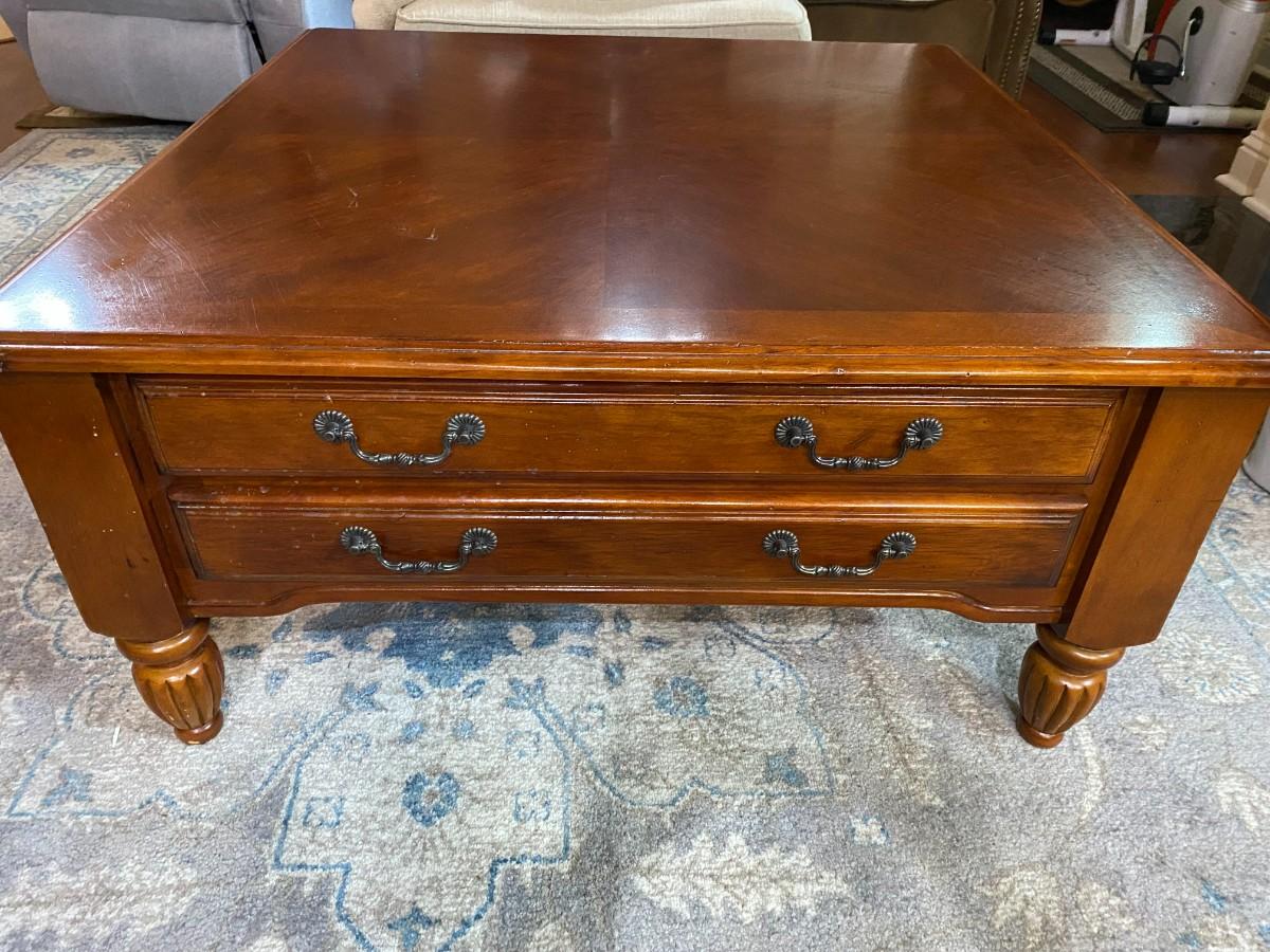 Wooden square coffee table with two drawers. Has repair to one corner and some surface scratches. Otherwise in good condition. Approx. 38" x 38" x 18" H