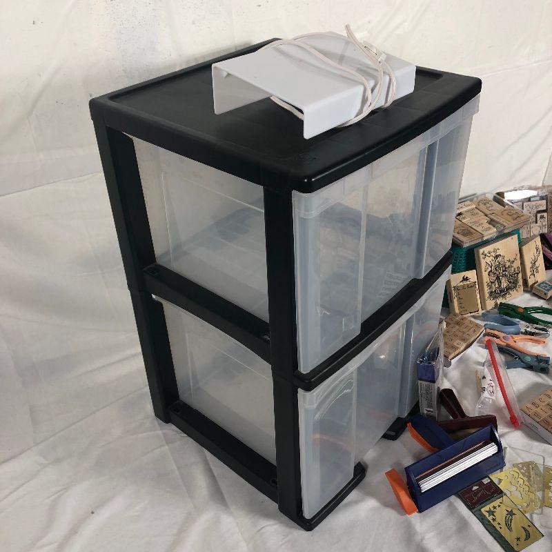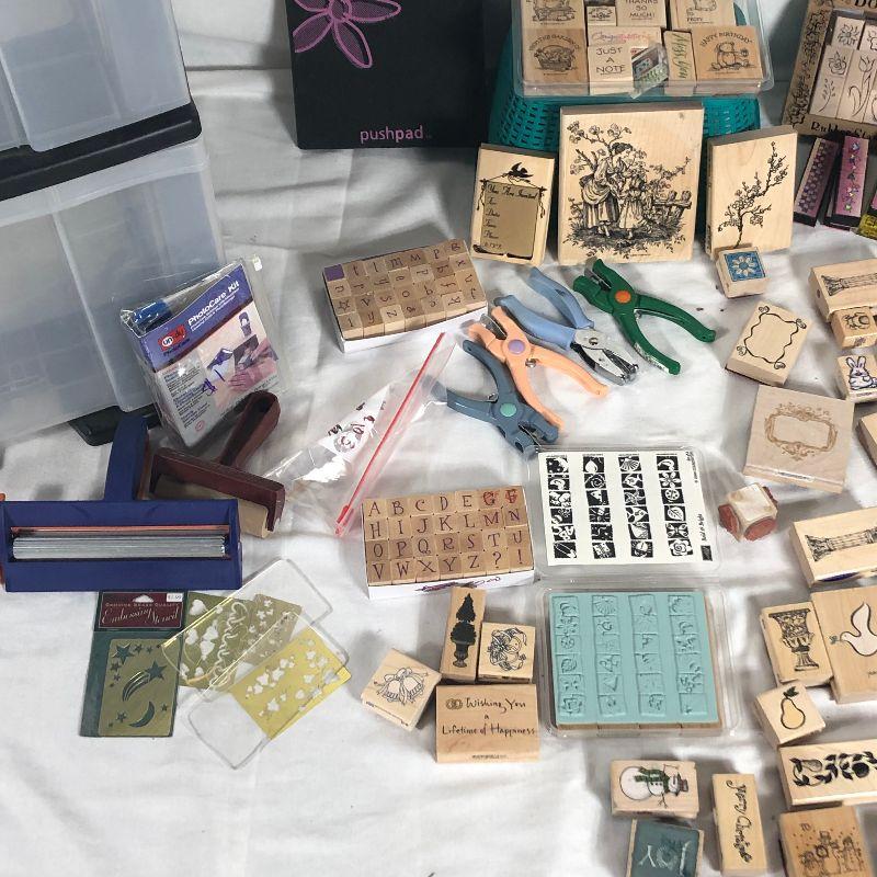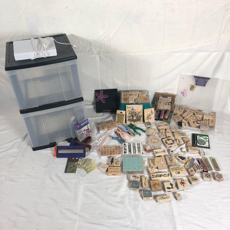 Over 100 Wood stamps for all occasions. Crimper, Hole Punches, and more! 2 Level drawer storage bin included