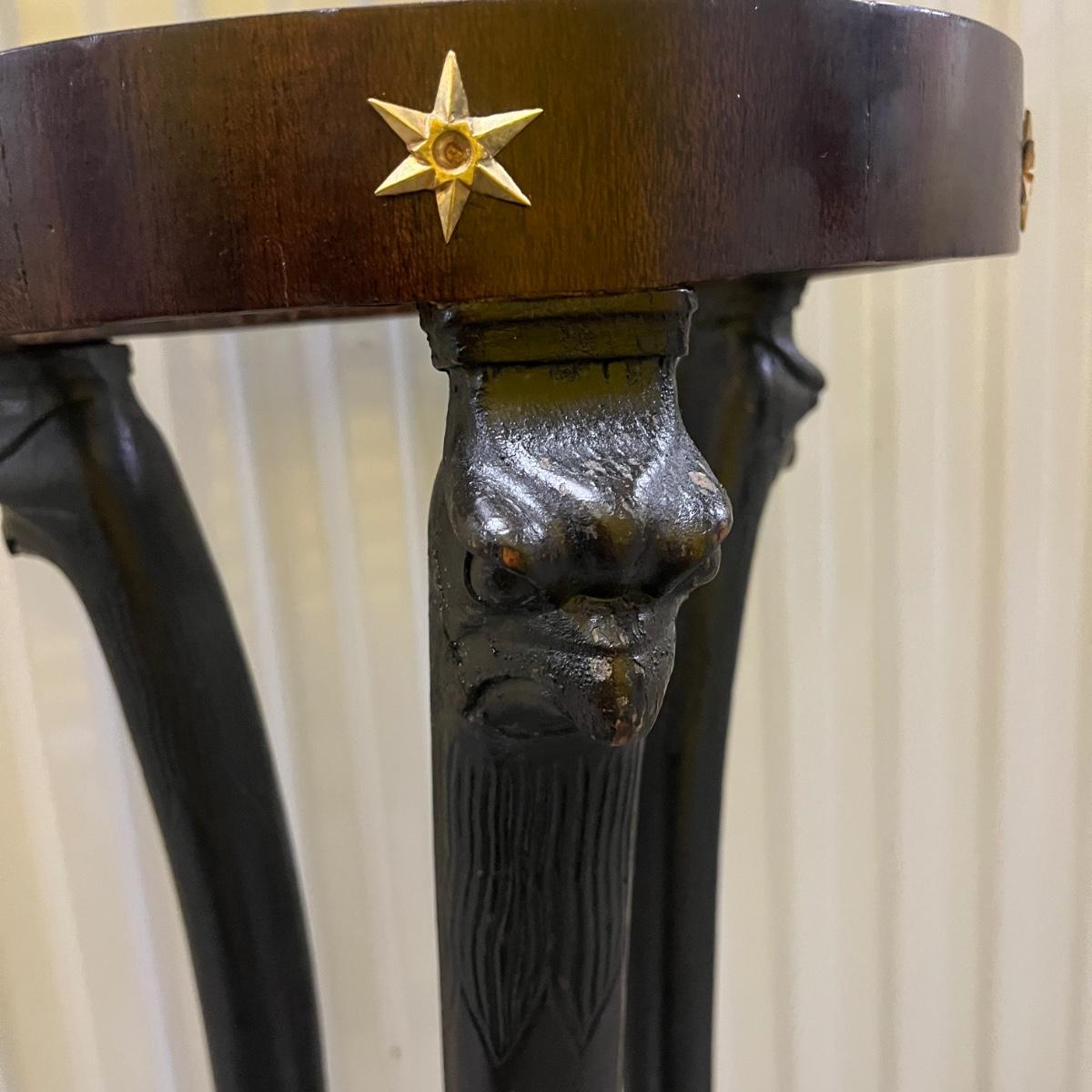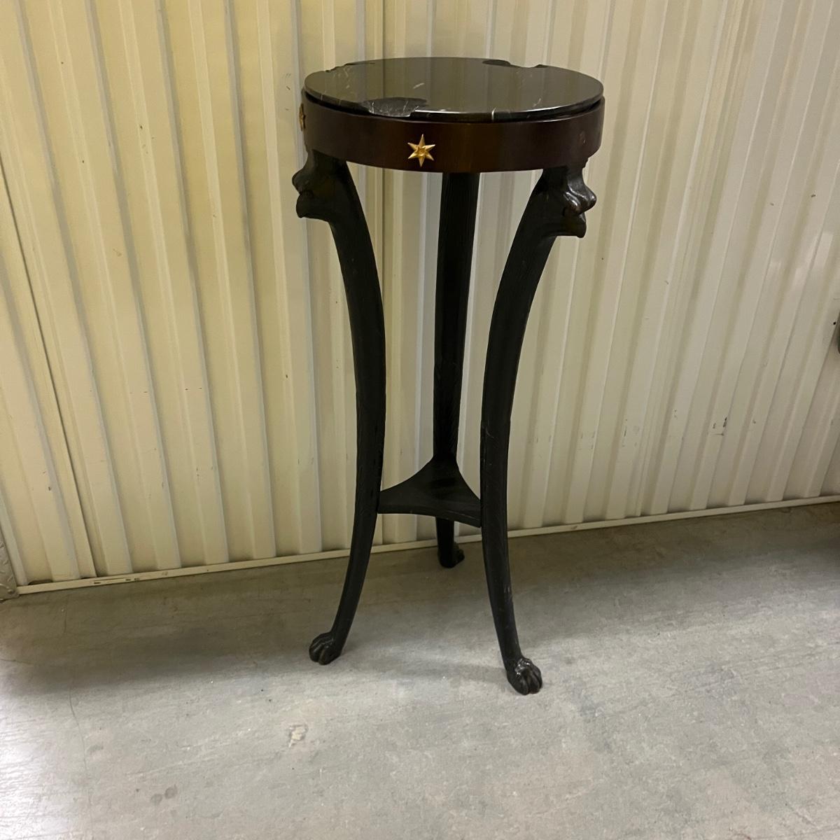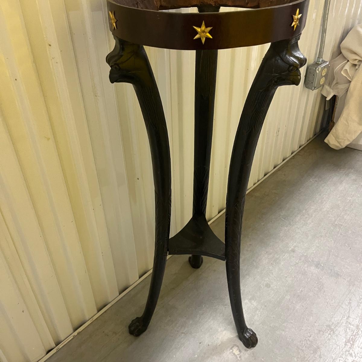 This unique plant stand is in the Federalist style. It has a wooden frame with claw feet and face accents. There are brass stars around the top rim. Removable stone top has chunks and chips missing, see pictures. Stand measures 12.5”D x 34.5”H.
