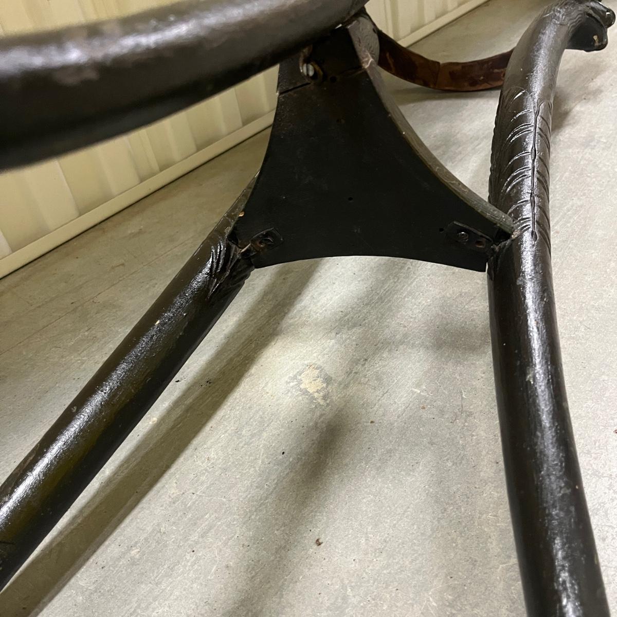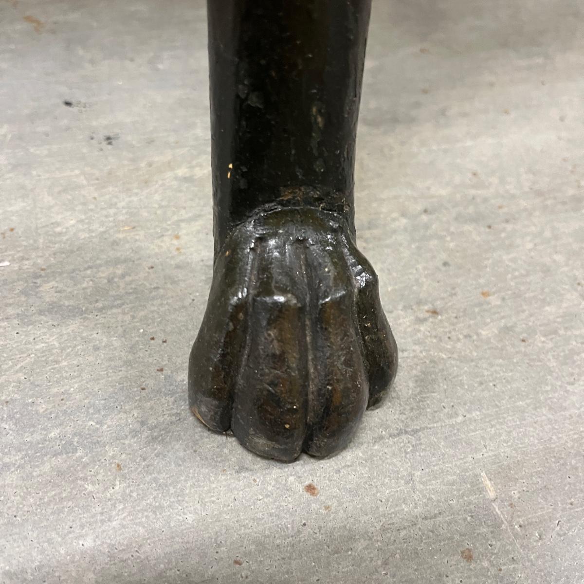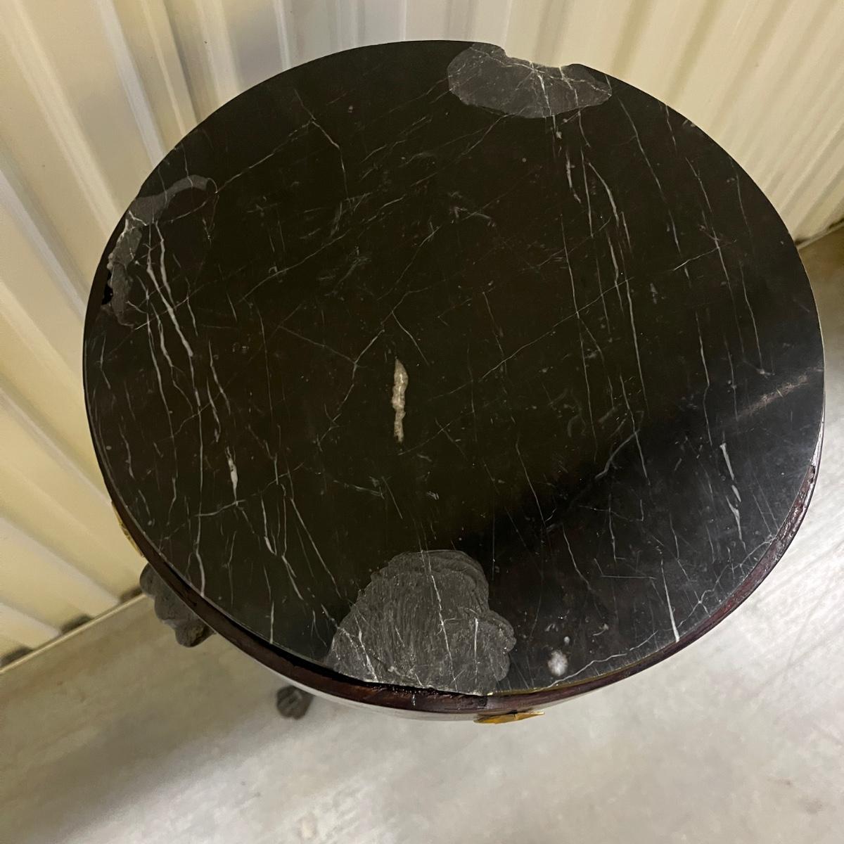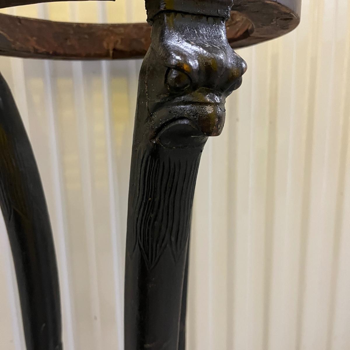 This unique plant stand is in the Federalist style. It has a wooden frame with claw feet and face accents. There are brass stars around the top rim. Removable stone top has chunks and chips missing, see pictures. Stand measures 12.5”D x 34.5”H.