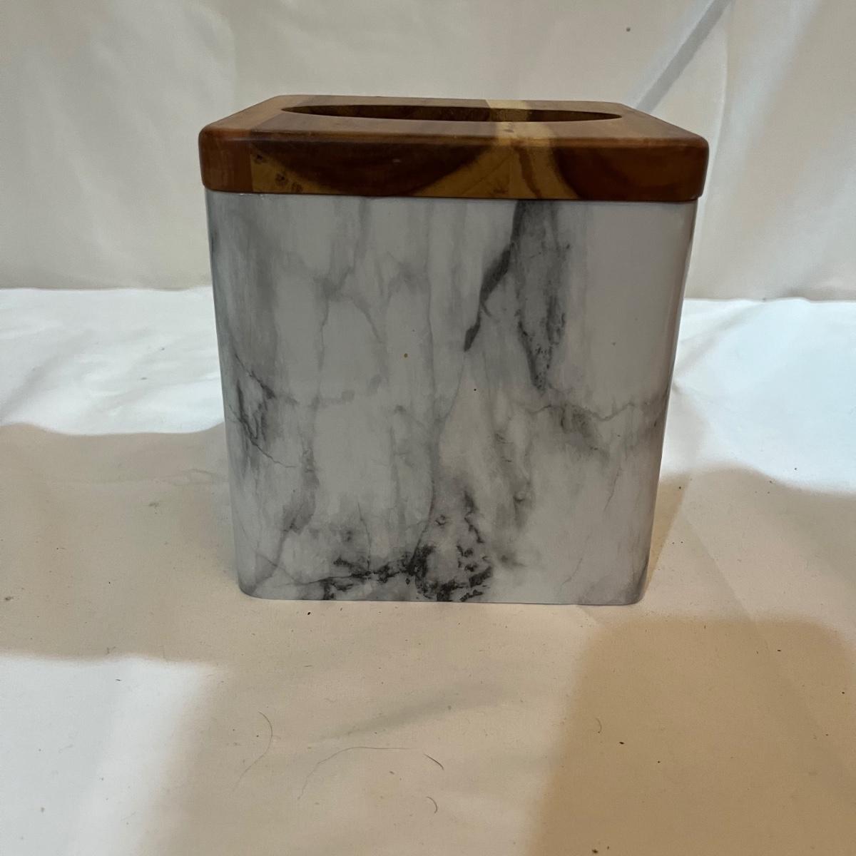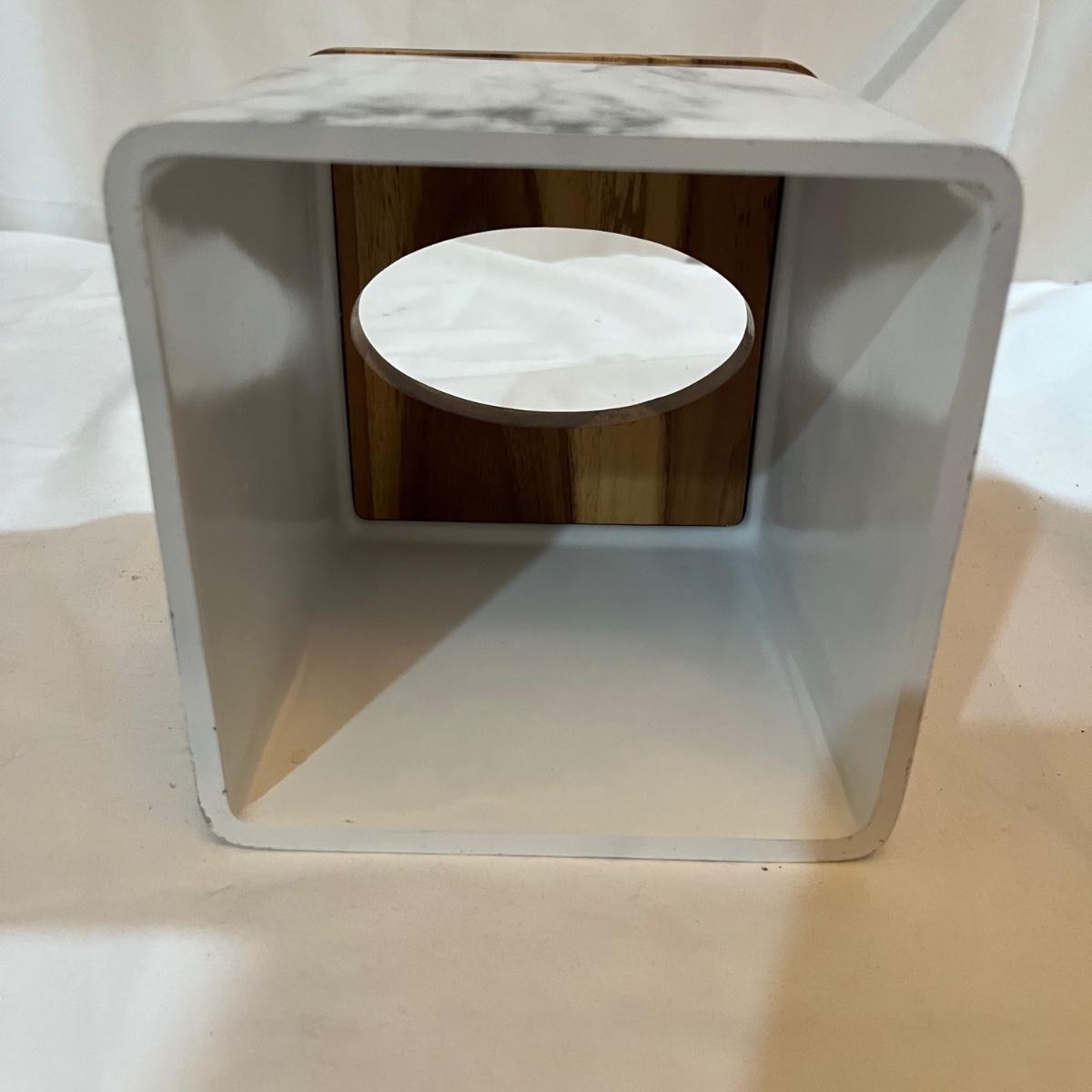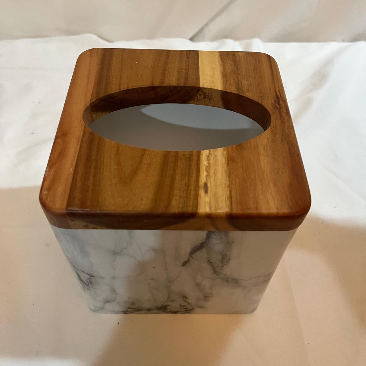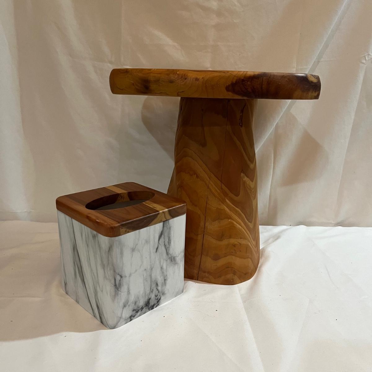 Lot includes a wooden stool that measures 12” x 13” x 13.5”. Also includes a plastic and wood tissue box cover.