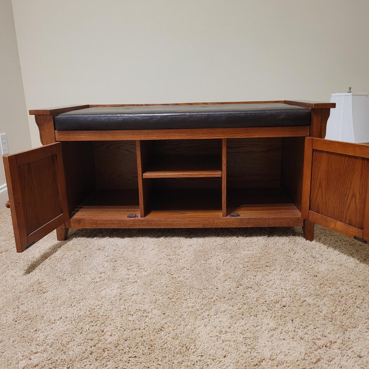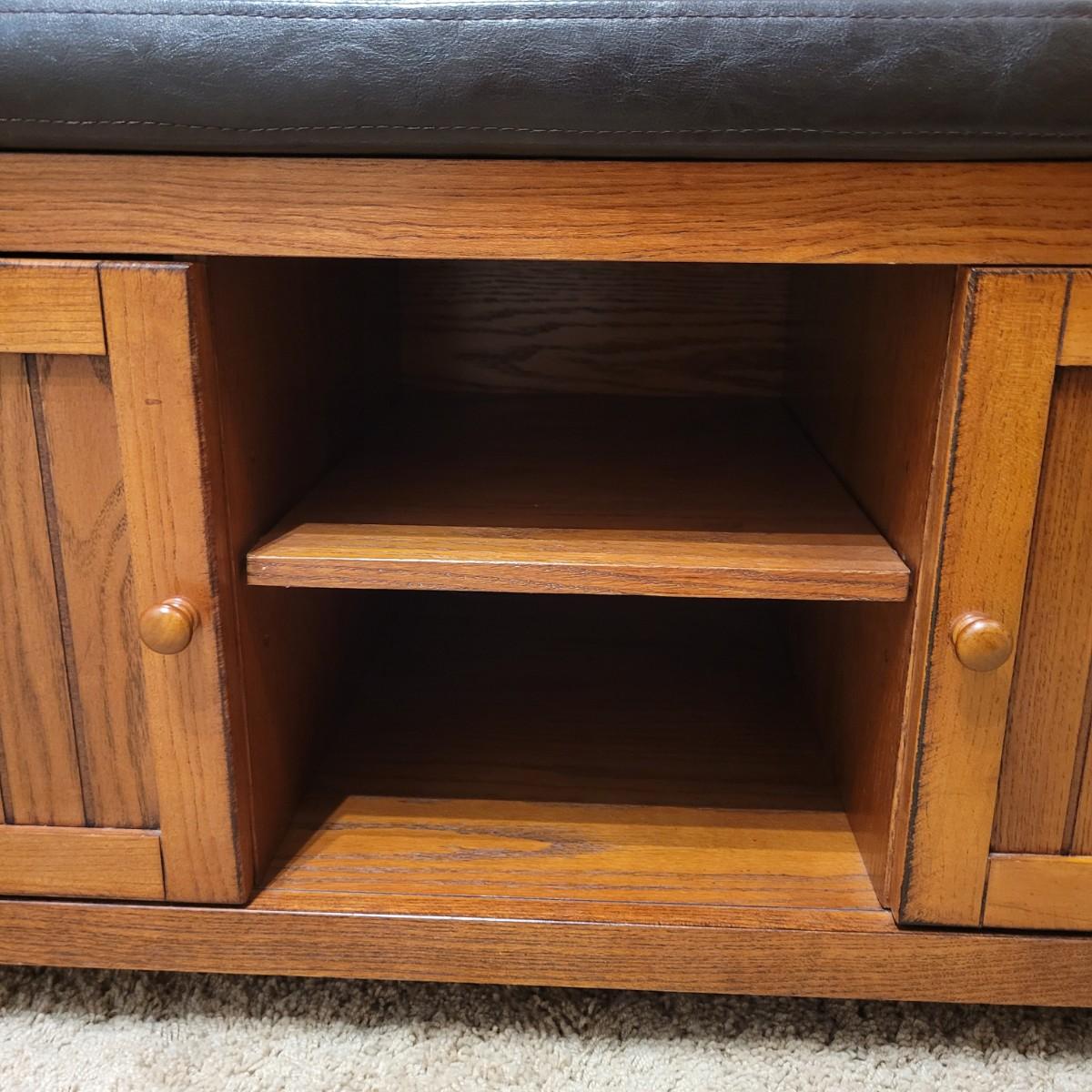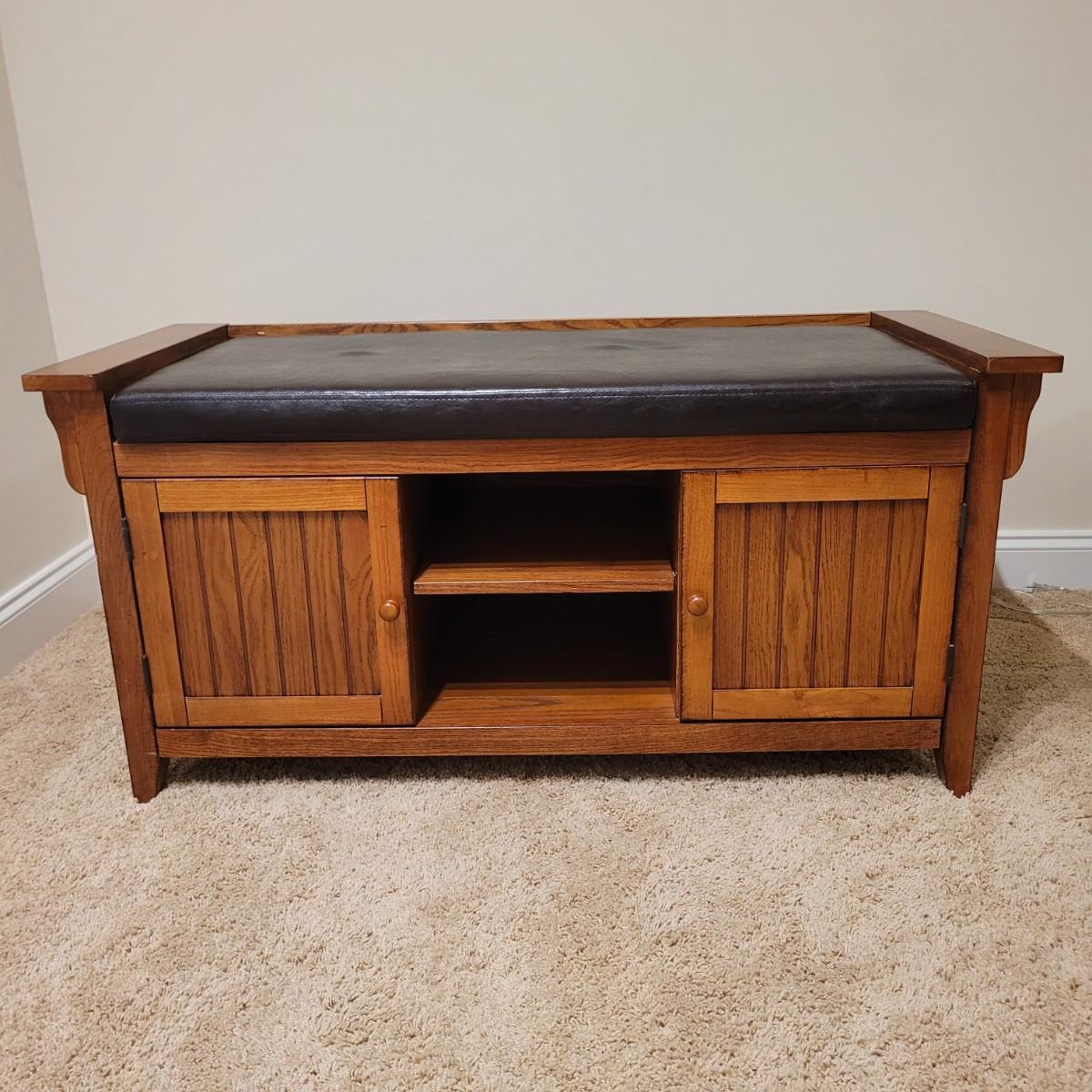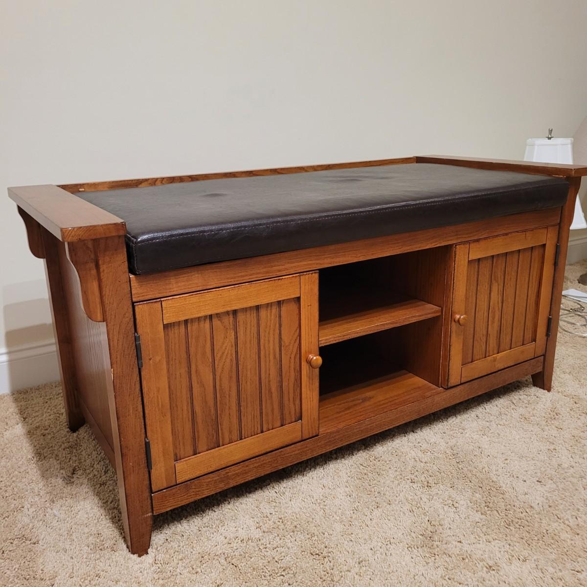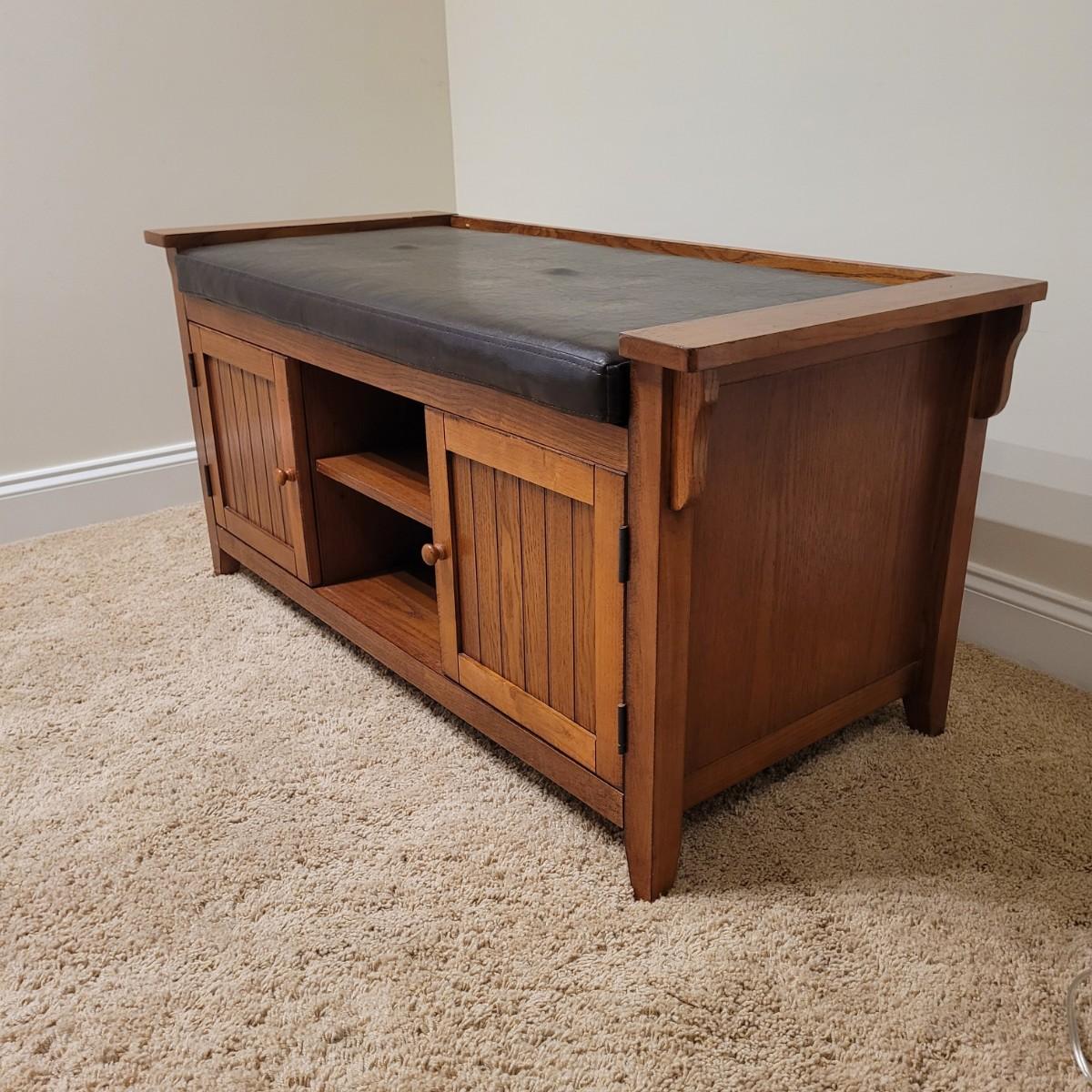 This lot includes a wooden bench with cabinets and shelves underneath. The bench is made mostly from wood and has a removable faux leather cushion top. The bench measures 45" x 20" x 22"H. It has latching cabinet on either side and two open shelves in the center on the bottom. It does not bear a makers mark and appears to be a generic brand.
