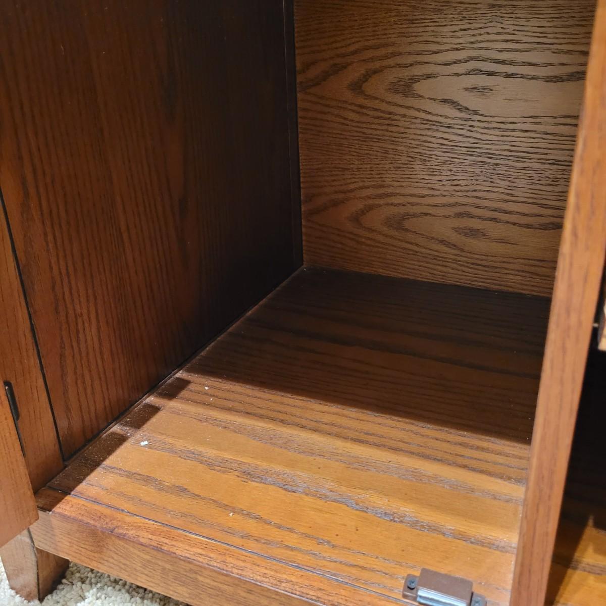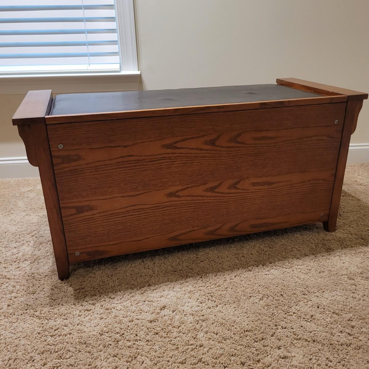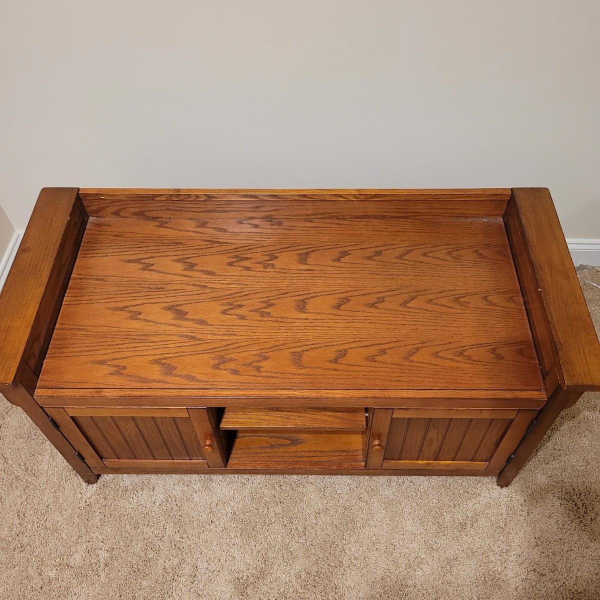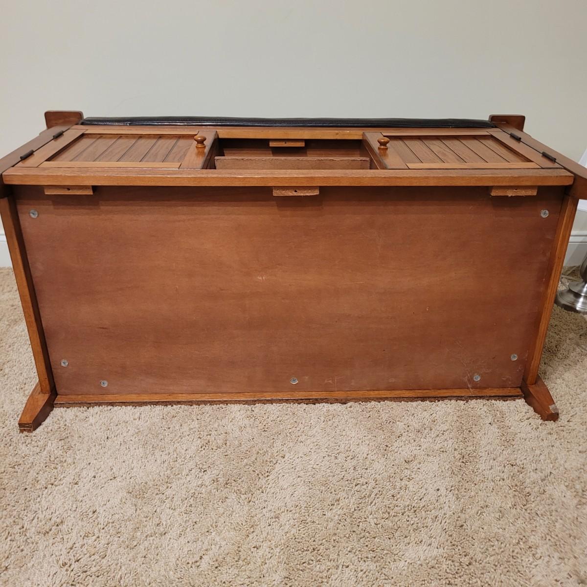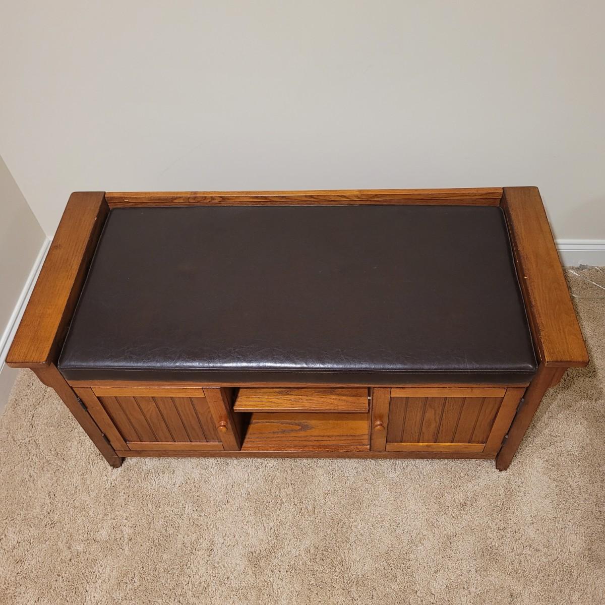 This lot includes a wooden bench with cabinets and shelves underneath. The bench is made mostly from wood and has a removable faux leather cushion top. The bench measures 45" x 20" x 22"H. It has latching cabinet on either side and two open shelves in the center on the bottom. It does not bear a makers mark and appears to be a generic brand.