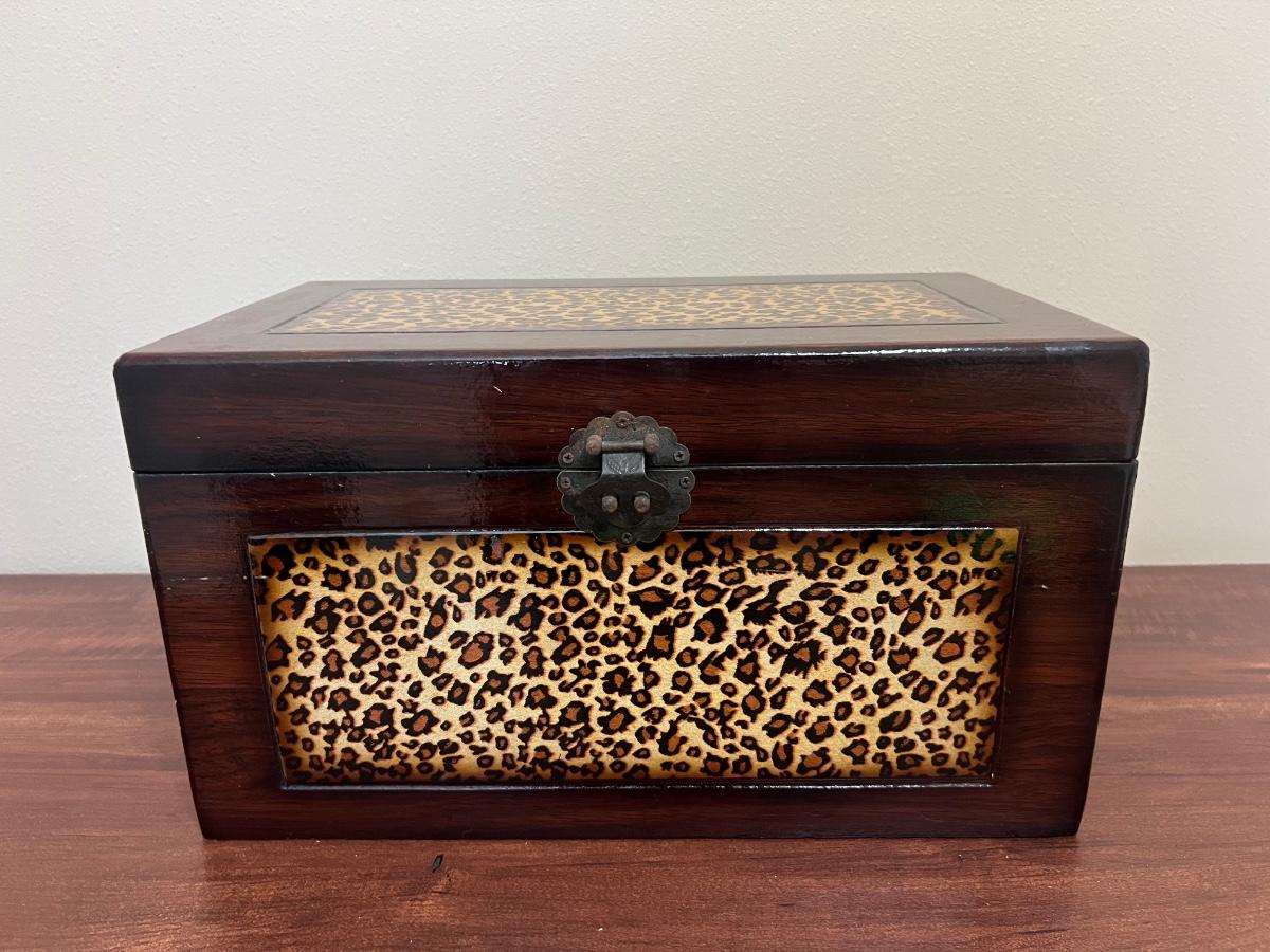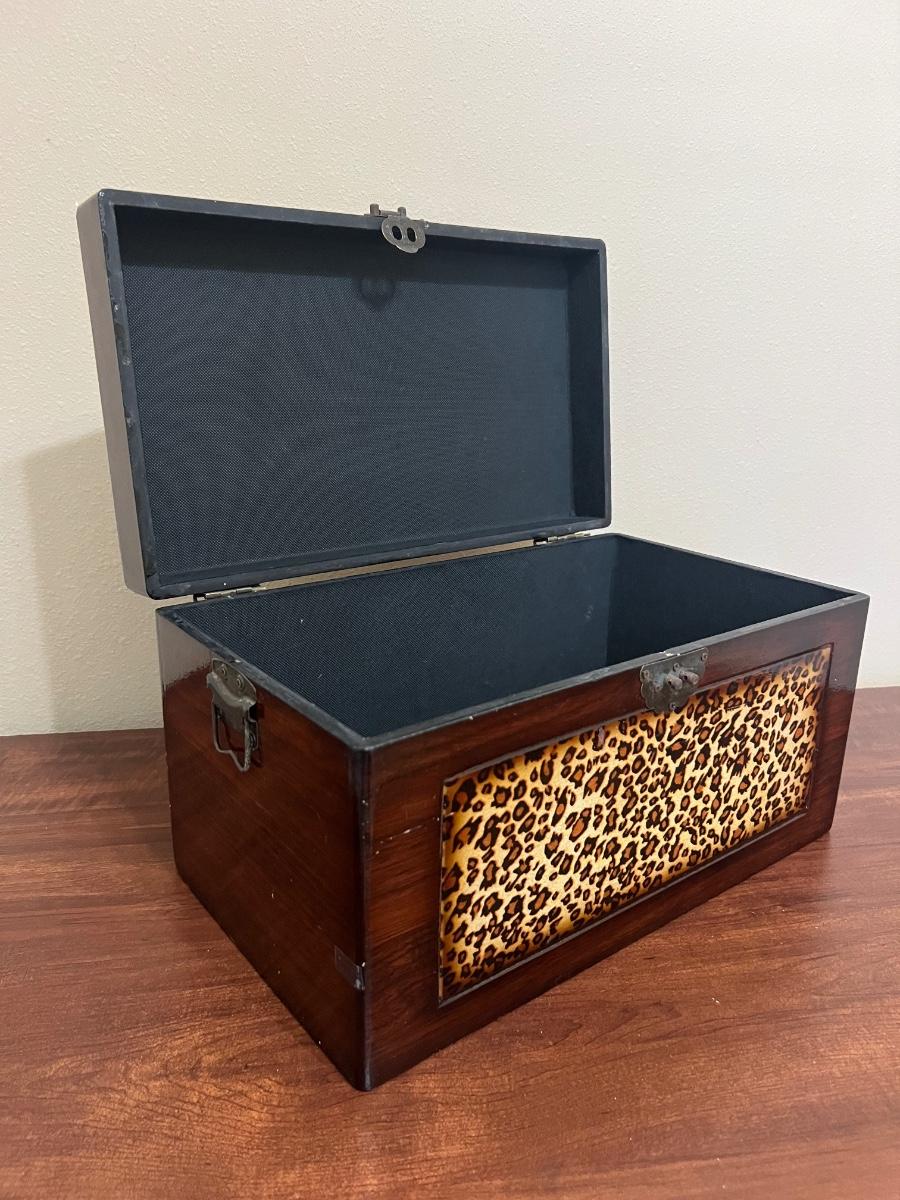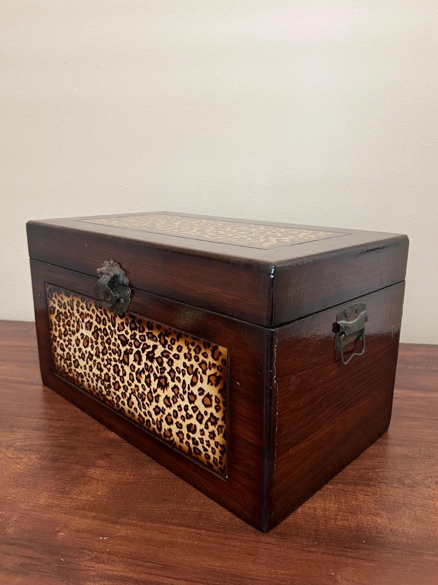 Wooden Storage Box with Chetah Print. Measures 9 1/2 inches tall, 16 1/2 inches wide and 9 1/2 inches deep.