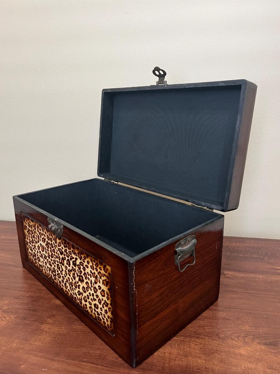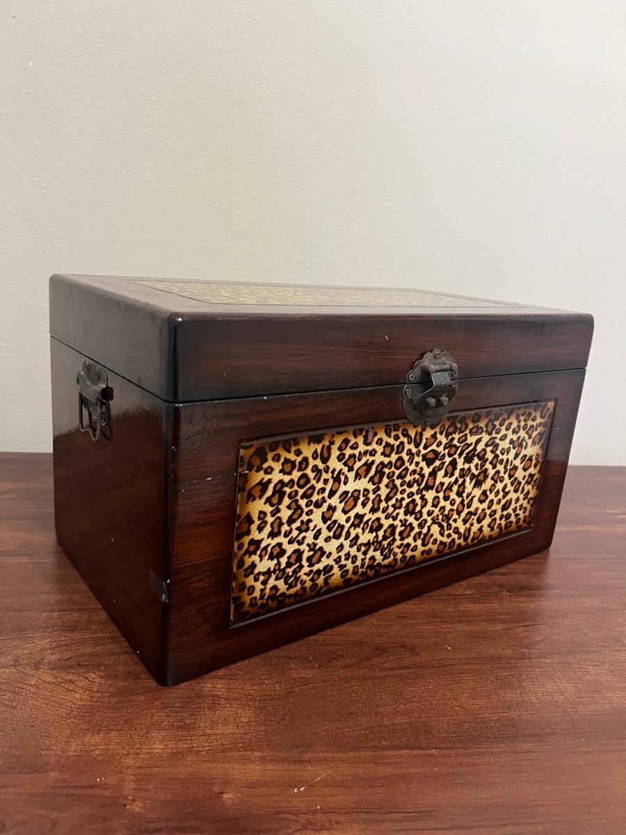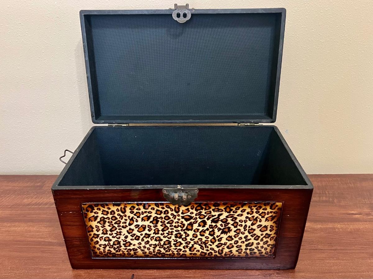 Wooden Storage Box with Chetah Print. Measures 9 1/2 inches tall, 16 1/2 inches wide and 9 1/2 inches deep.