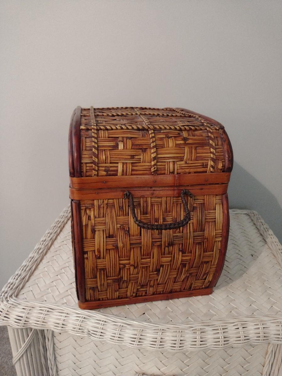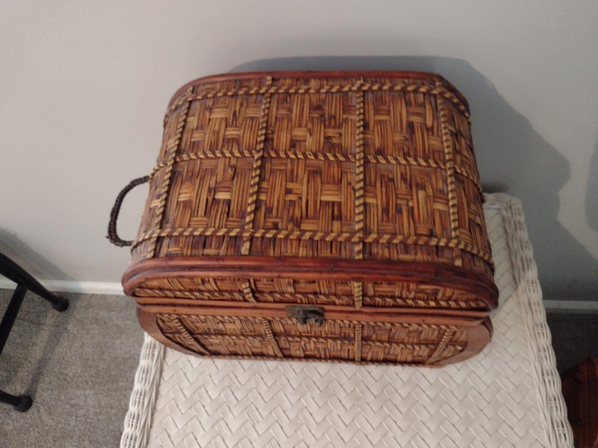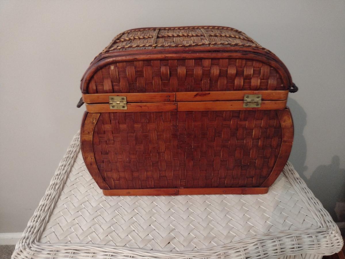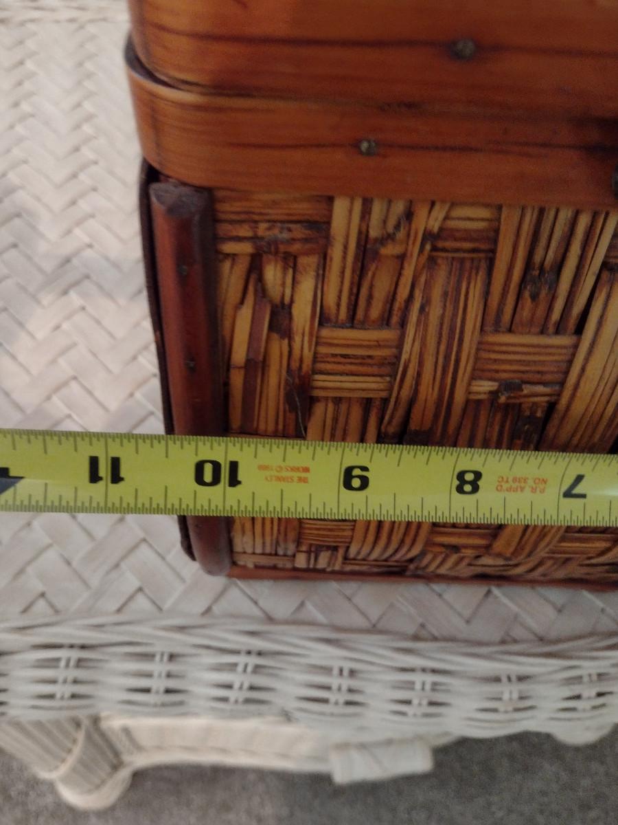 Wooden Storage Box with Woven Design and Side Handles. Measures approx 17 1/2" x 10 1/2" x 14" tall.