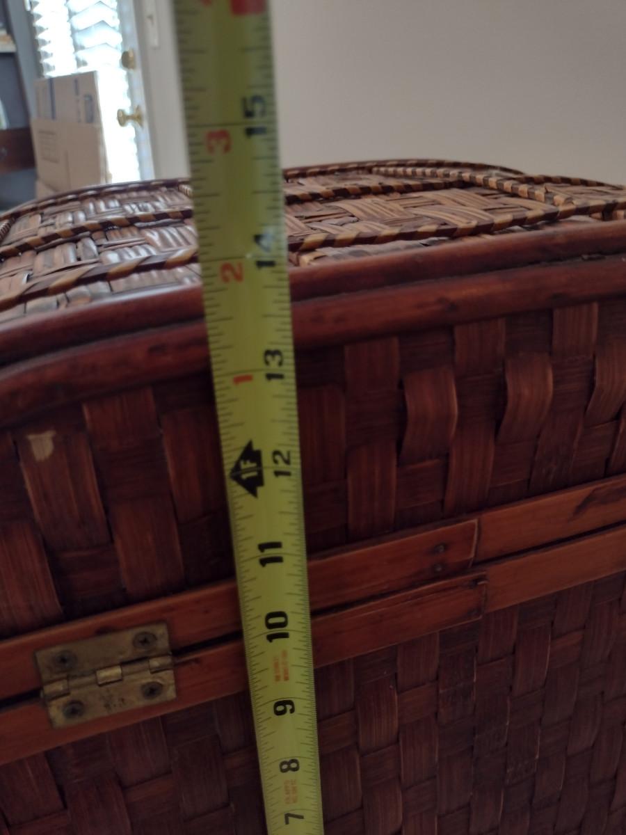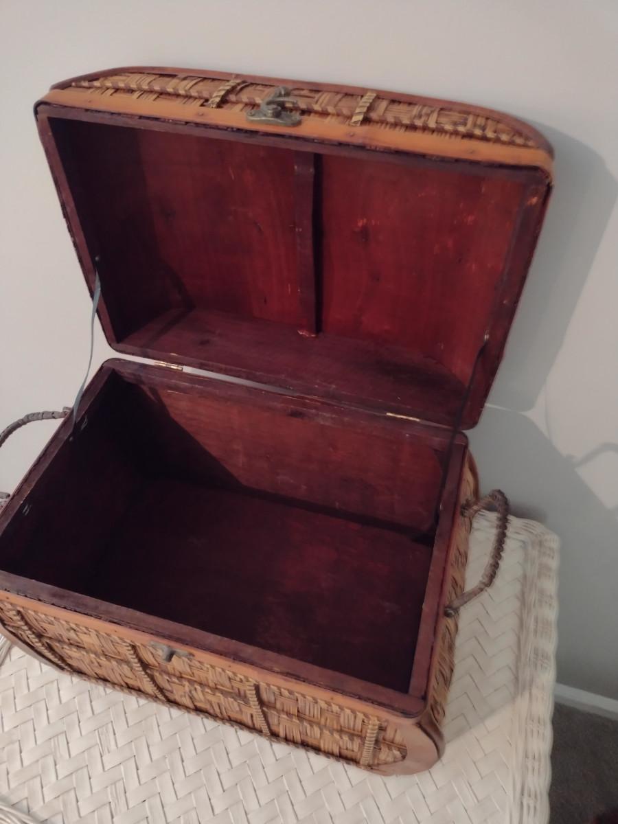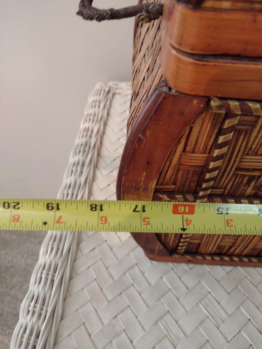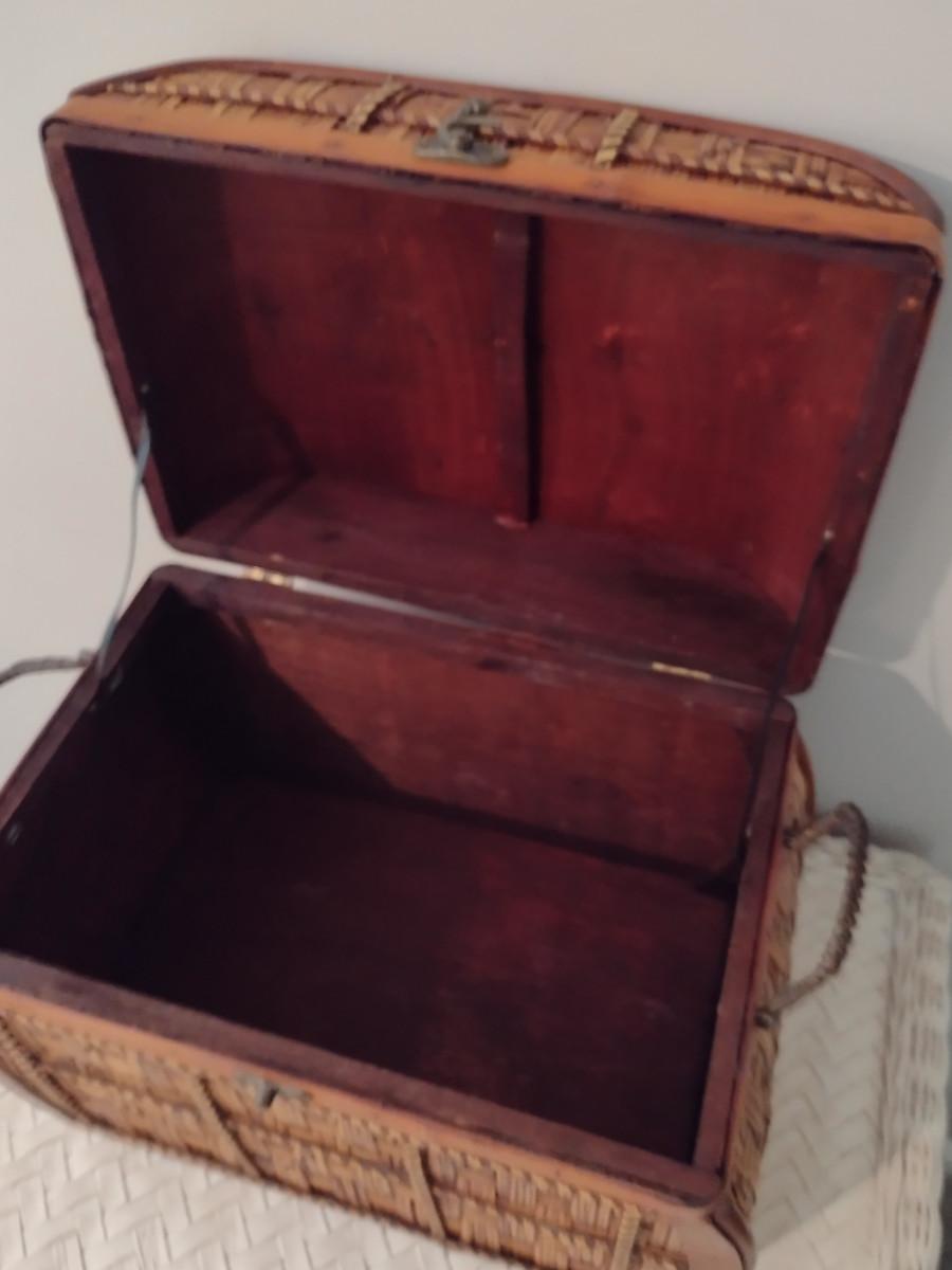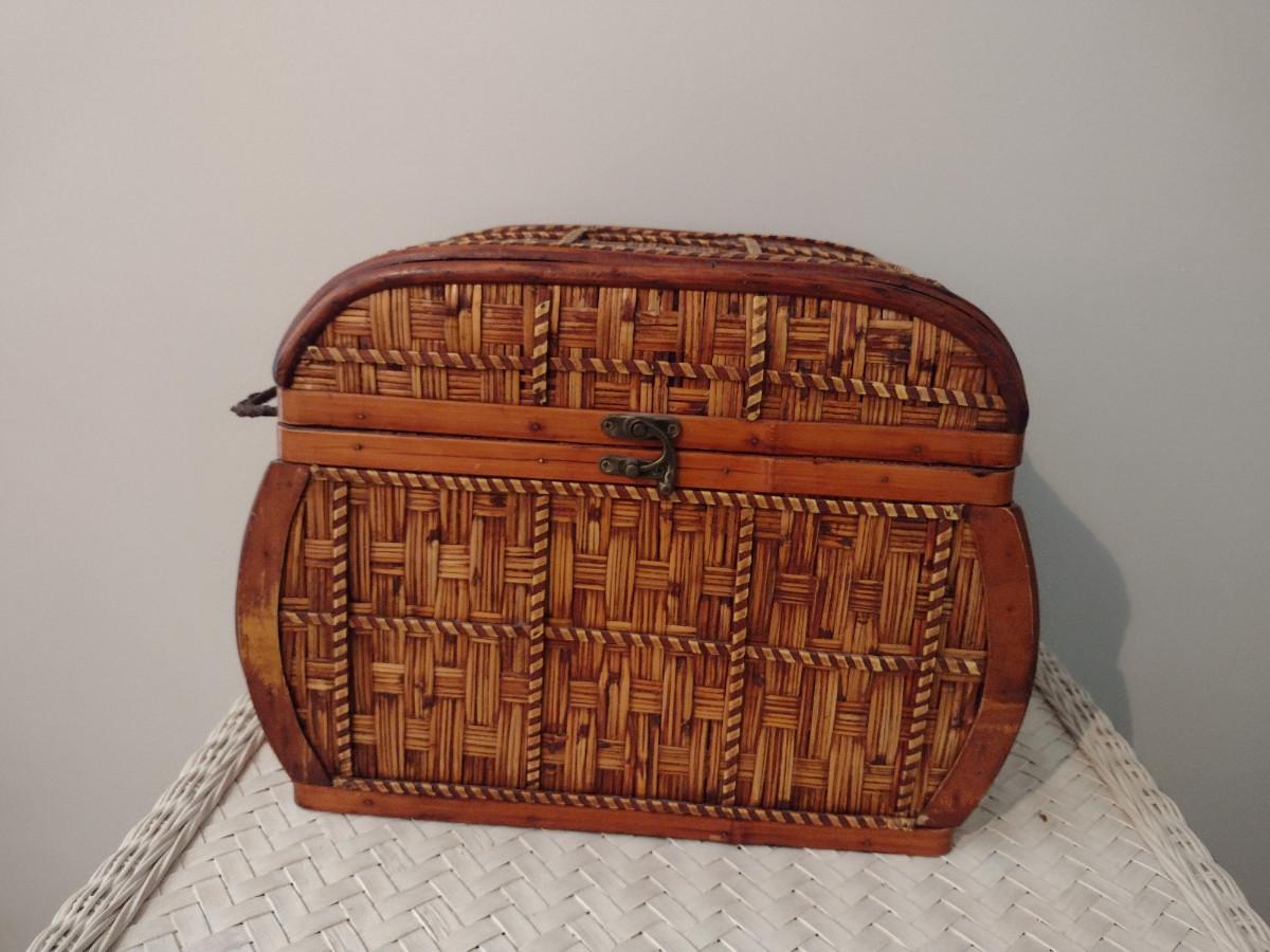 Wooden Storage Box with Woven Design and Side Handles. Measures approx 17 1/2" x 10 1/2" x 14" tall.