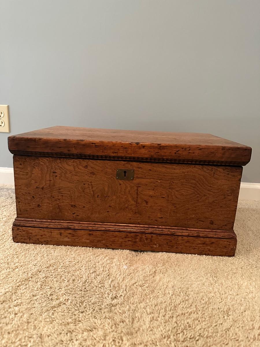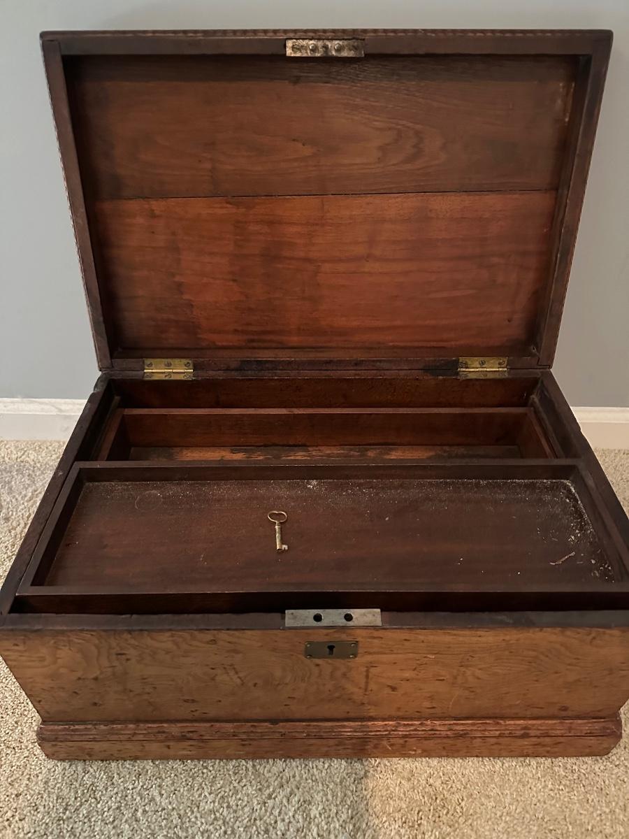 Large box measures 22” X 14” X 11”H. Small box measures 11.5” X 7.5” X 5”. Both appear to have original keys but they no longer work. Shipping available.