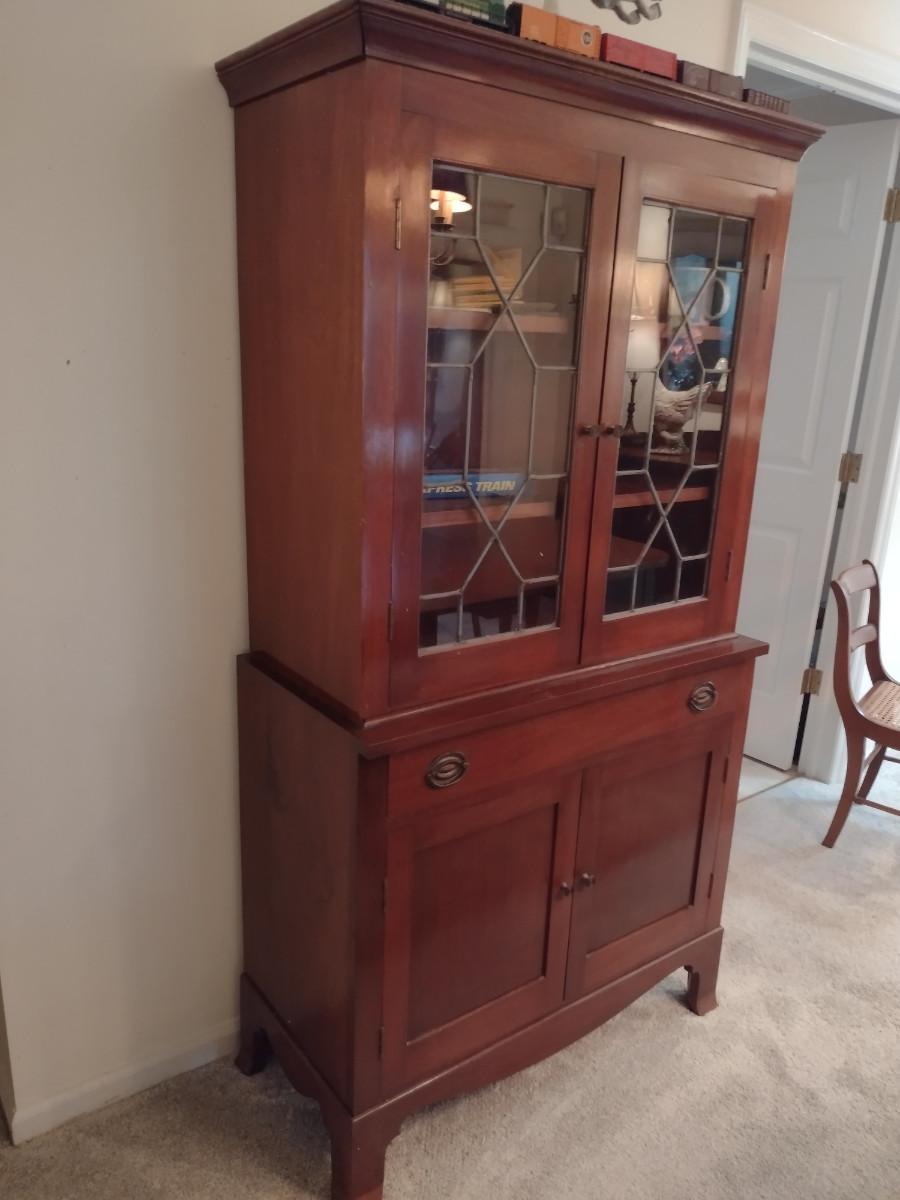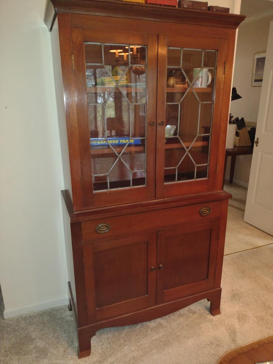 Wooden Storage Hutch with Leaded Glass Doors. Item appears to be one piece. Measures approx 36" wide, 17 1/2" deep, 69 1/2" tall.