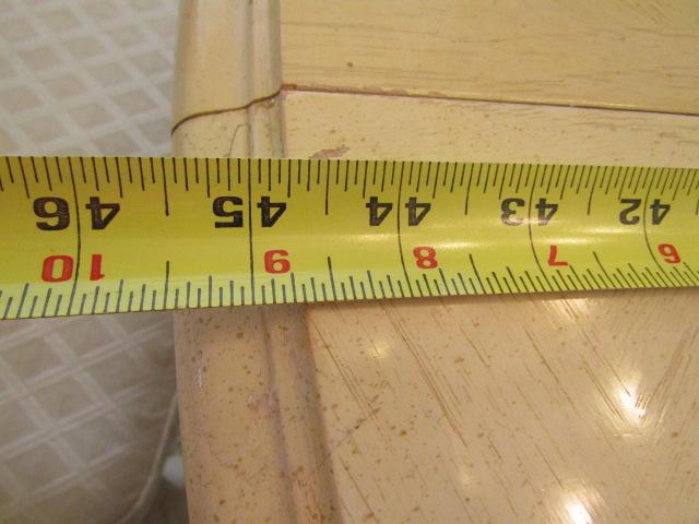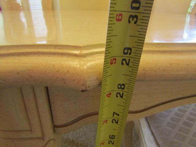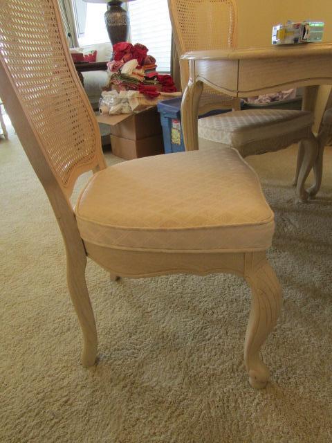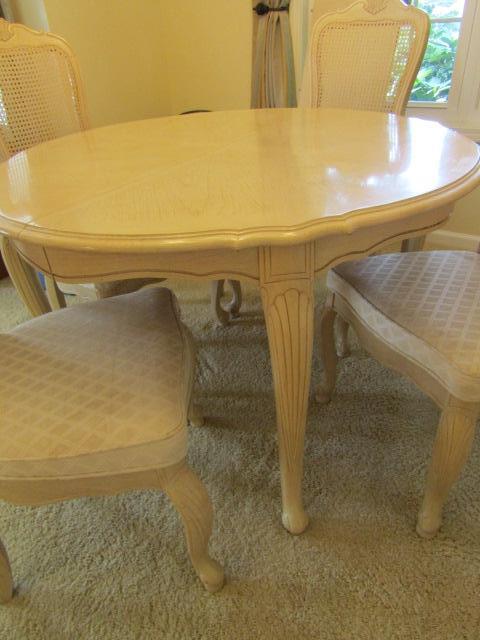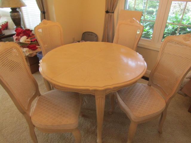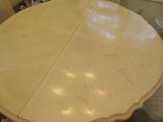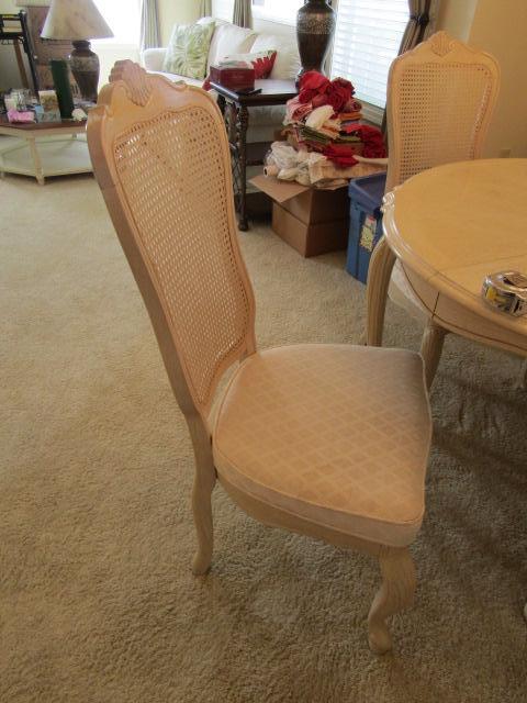 Wooden Table and 4 Cane Backed Chairs. Table is 45 1/2" Across, 29" High. Comes with 2- 16" Leaves and Padded Protective Top.
