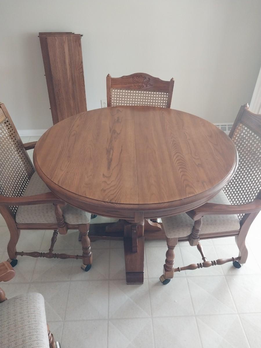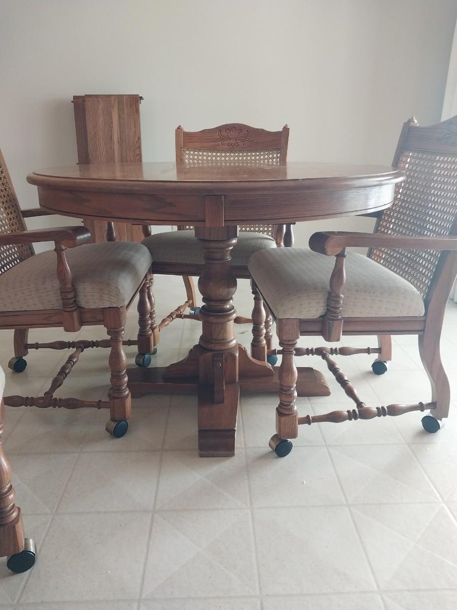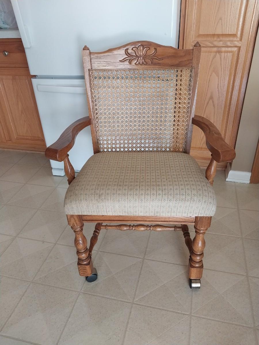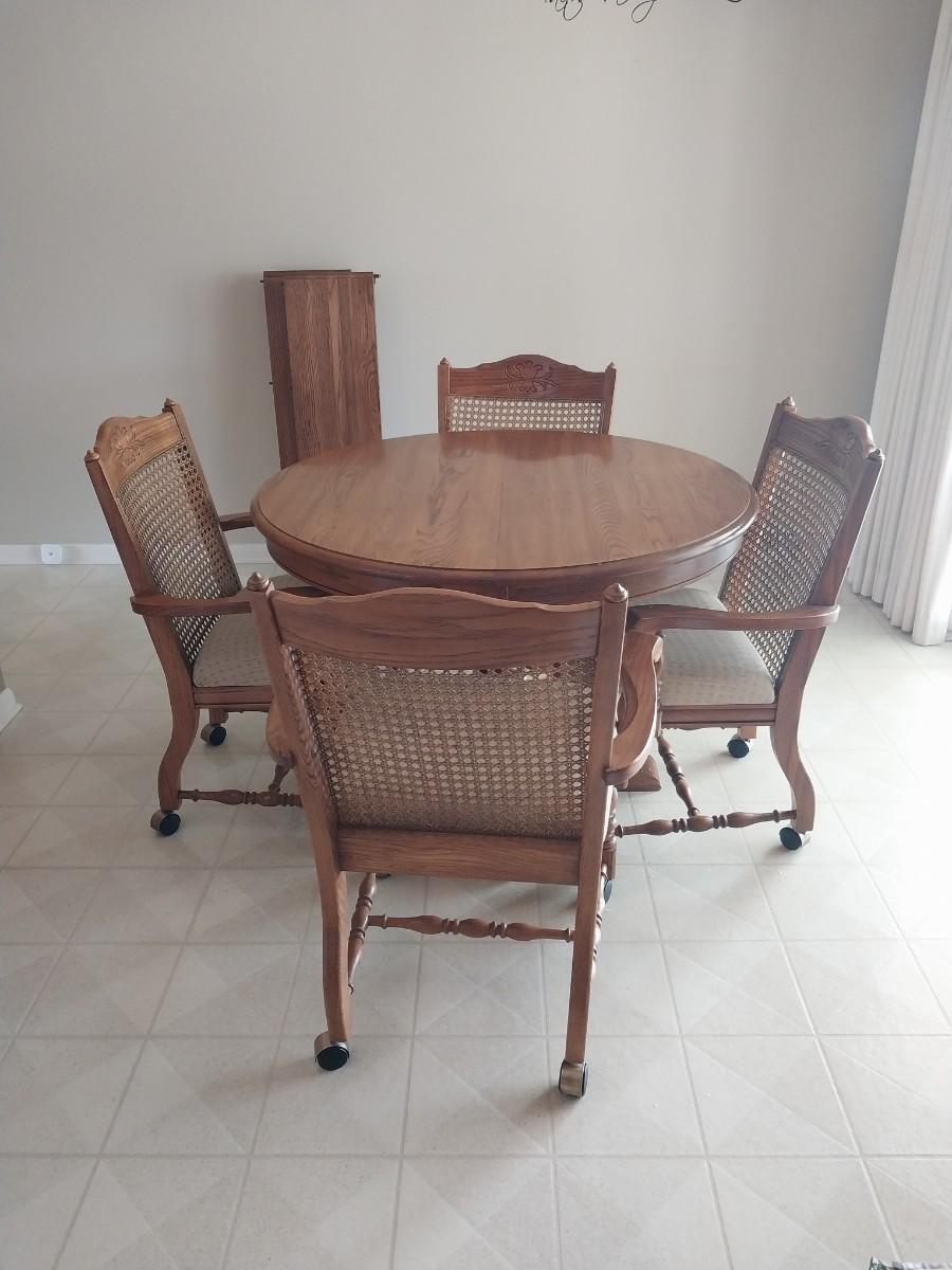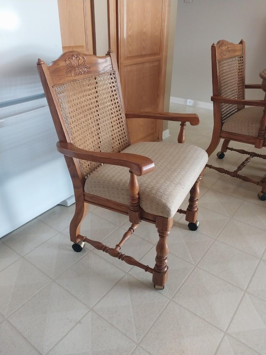 UPHOLSTERED SEATS, CAIN BACKS MEASURES 41" ROUND AND (2) 12" LEAVES TO ADD