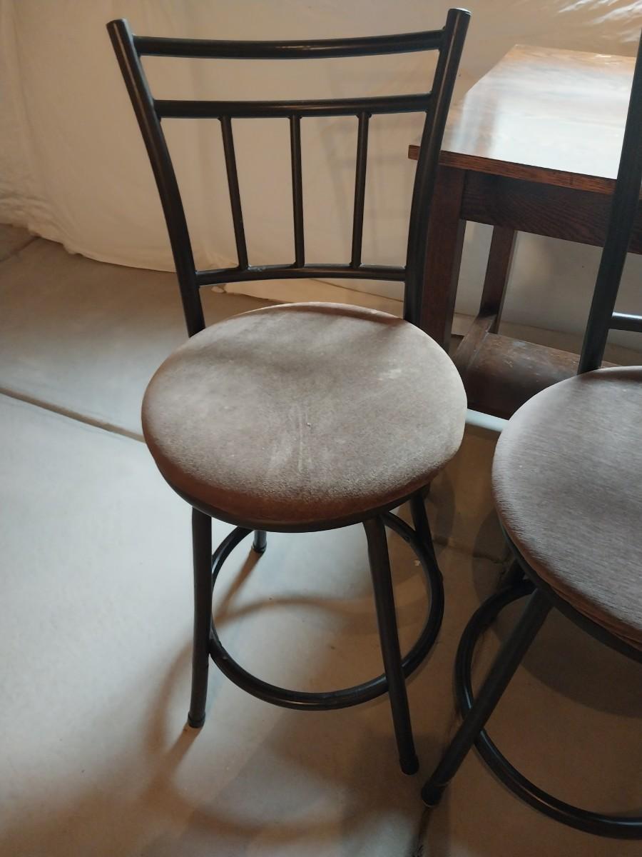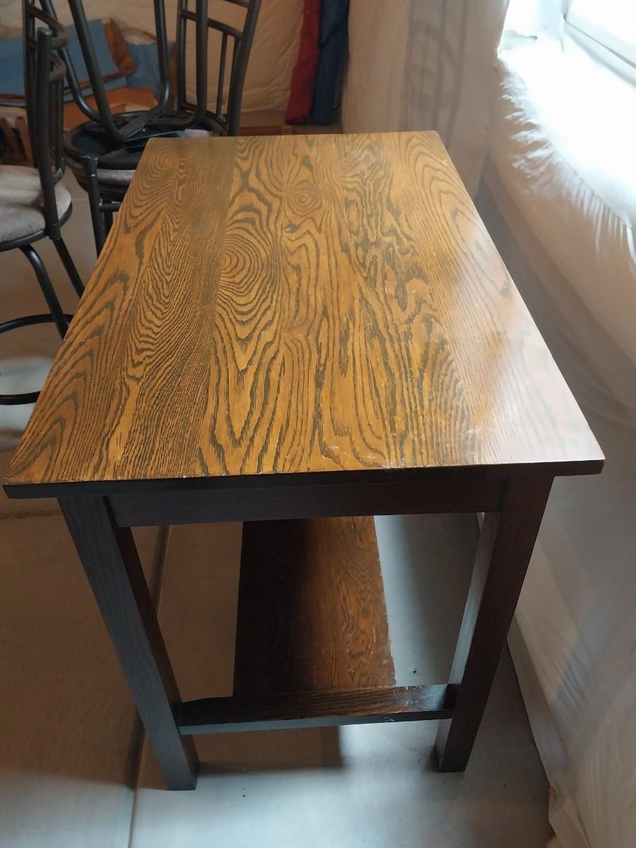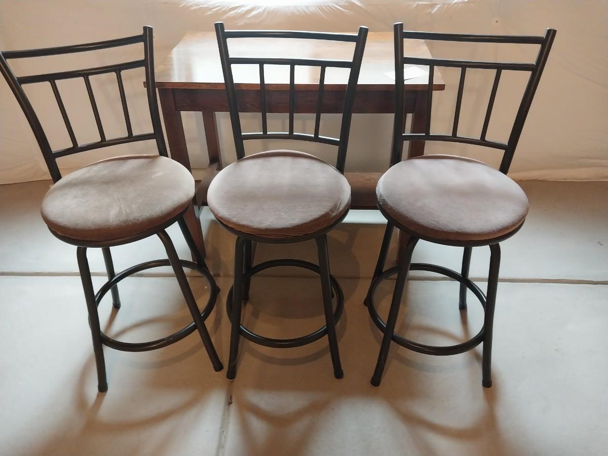 WOODEN TABLE AND THREE BARSTOOLS