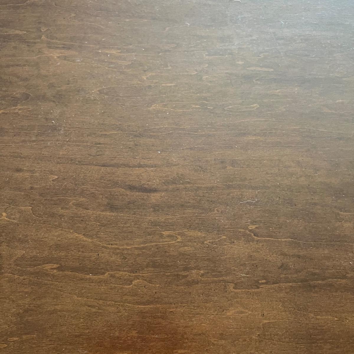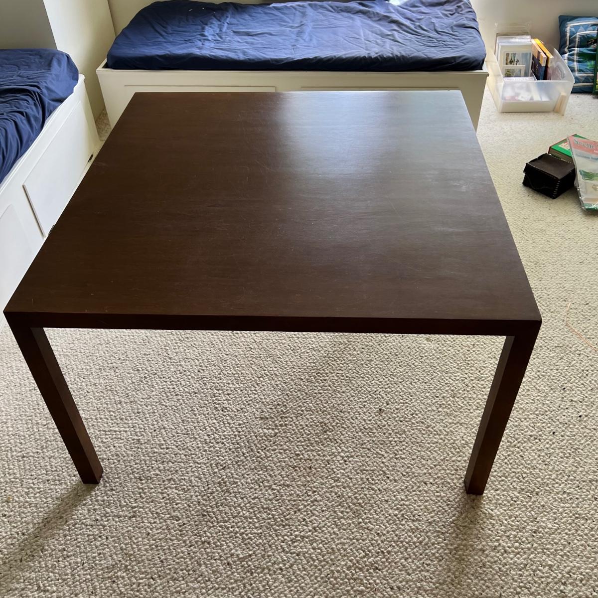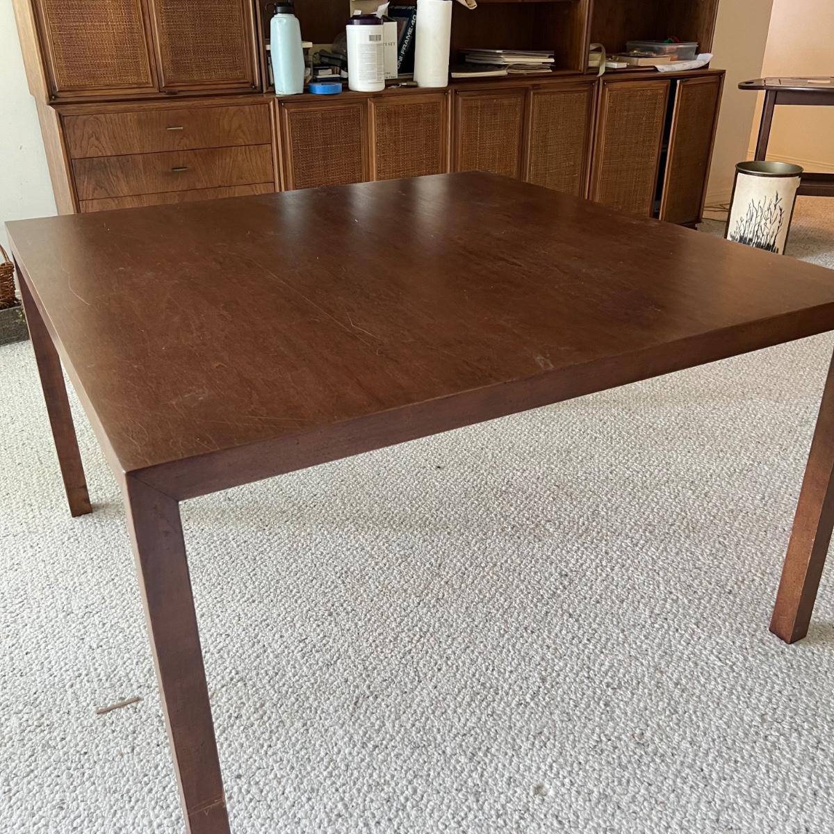 Square wooden brown stained table. The table measures 43” square and is 26” high. The table appears to be solid wood.