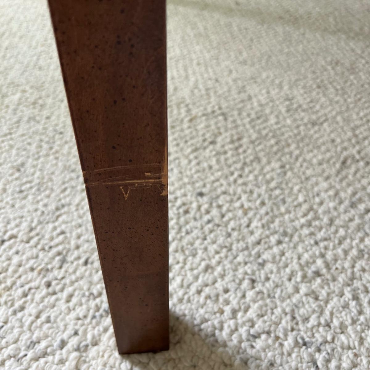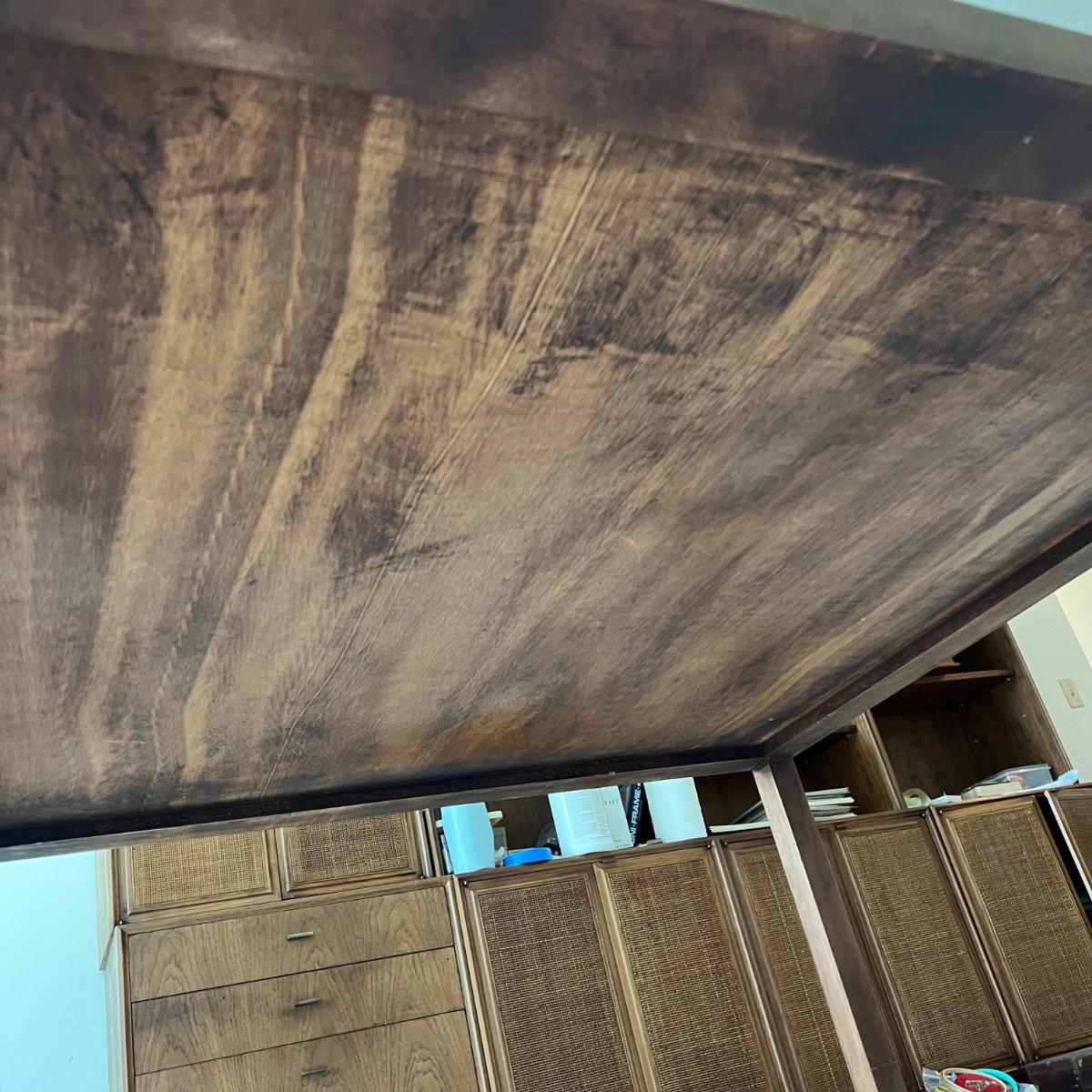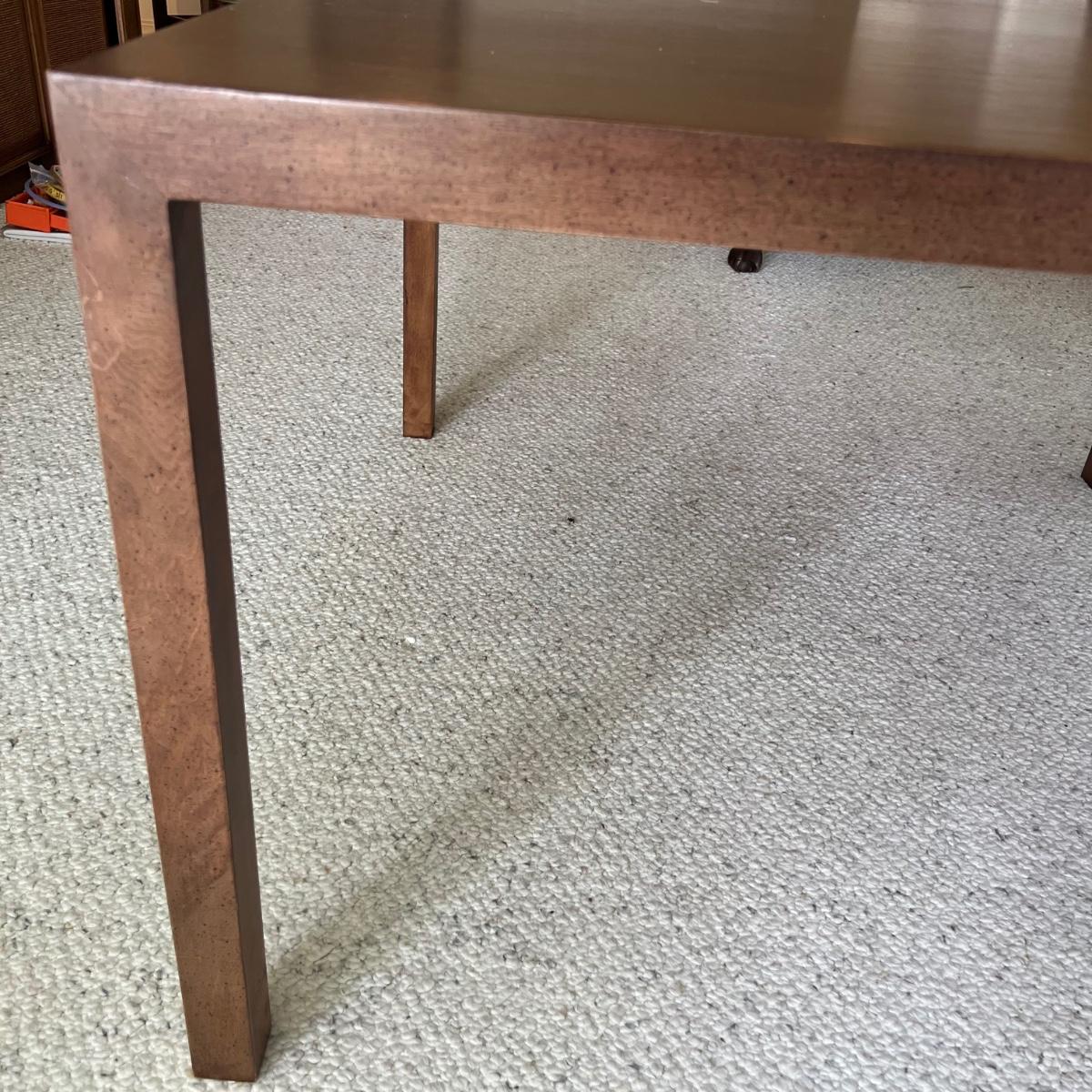 Square wooden brown stained table. The table measures 43” square and is 26” high. The table appears to be solid wood.