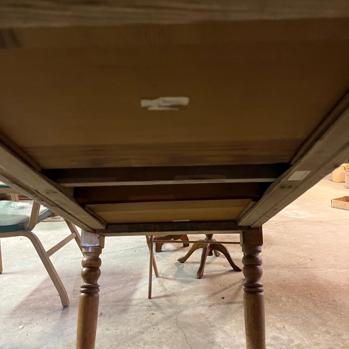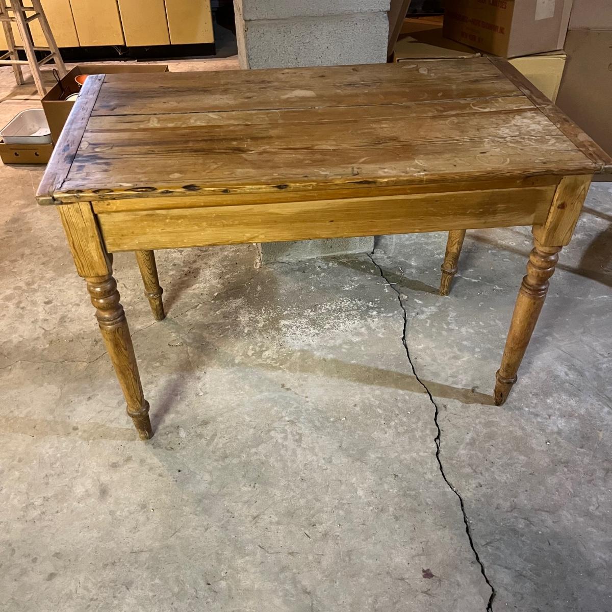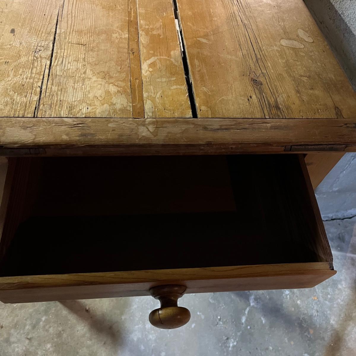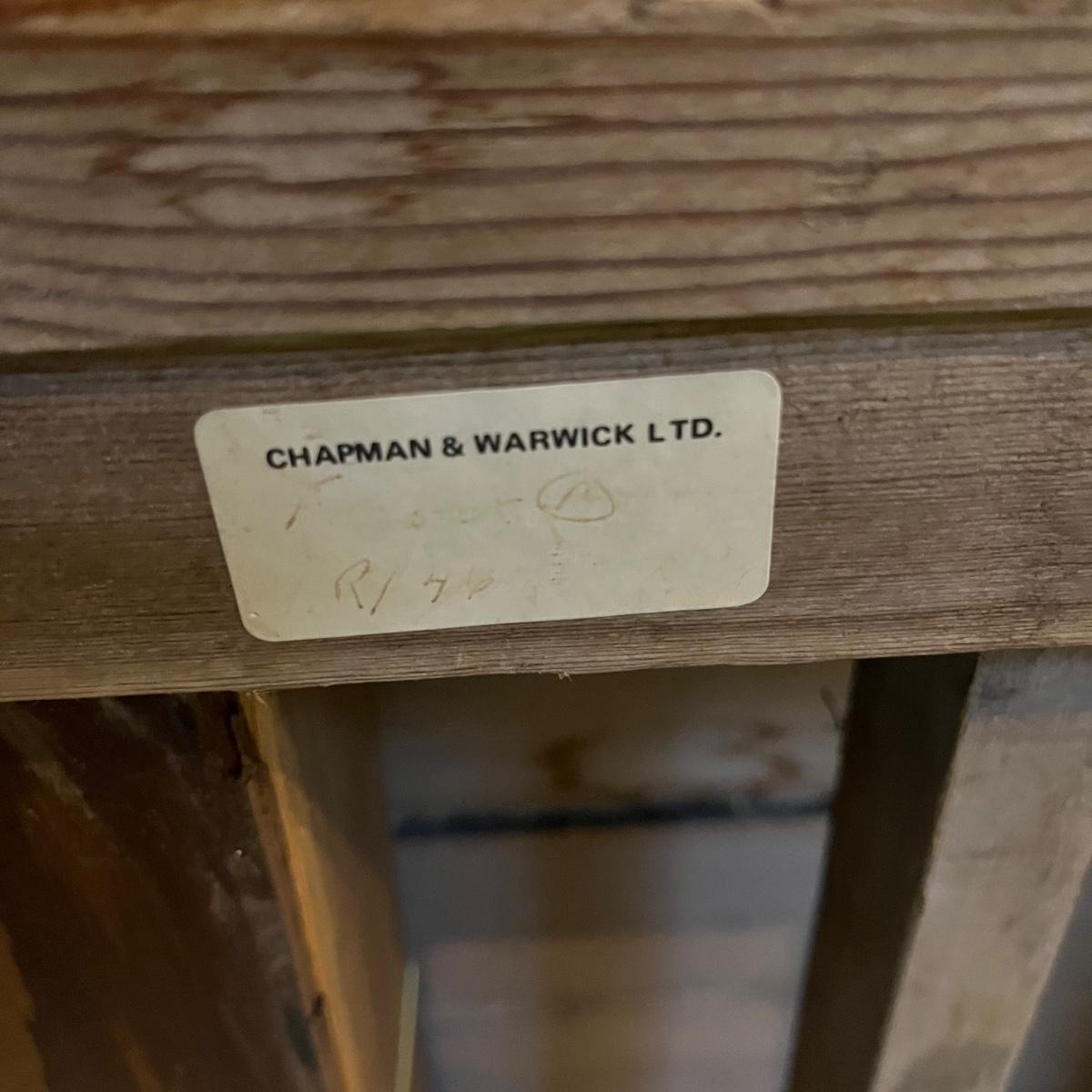 Lot includes a solid wood table with a drawer on each end. Table has some scratches, nicks, and water stains, as well as a split on the top; see pictures. Table has stickers that say Chapman and Warwick, LTD. Table measures 24” x 42” x 28”.