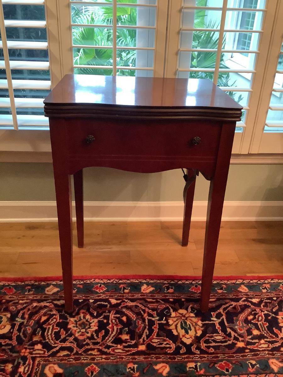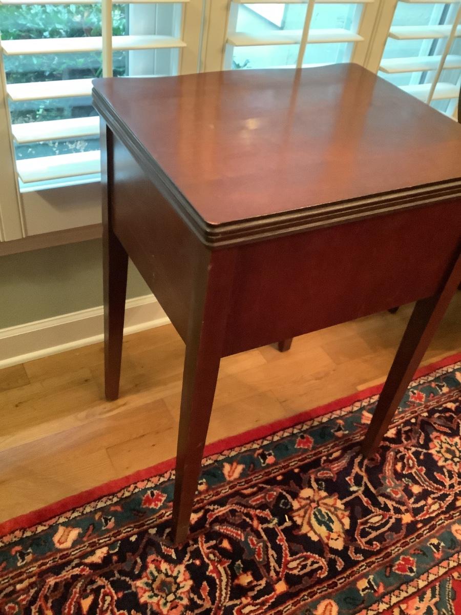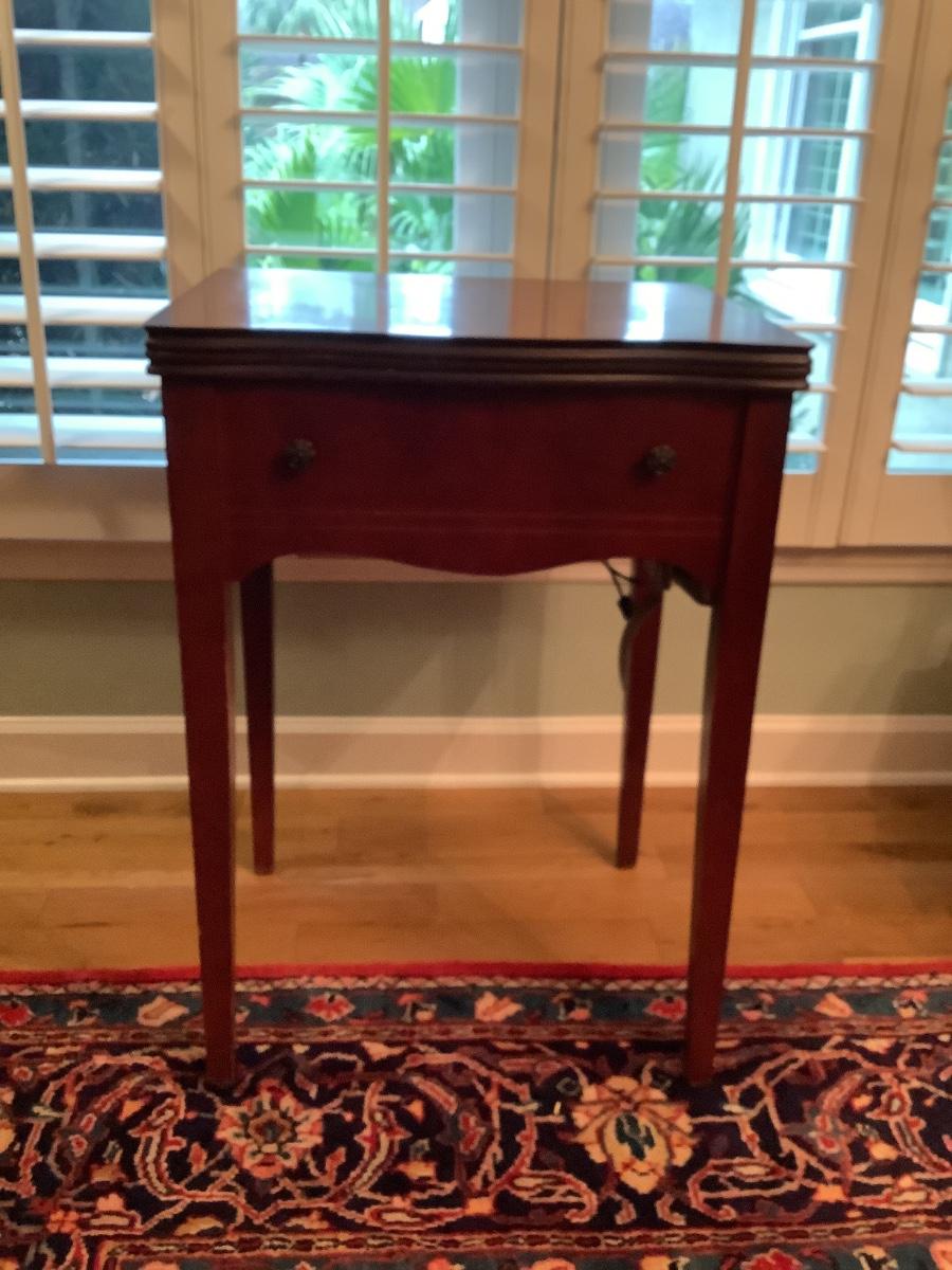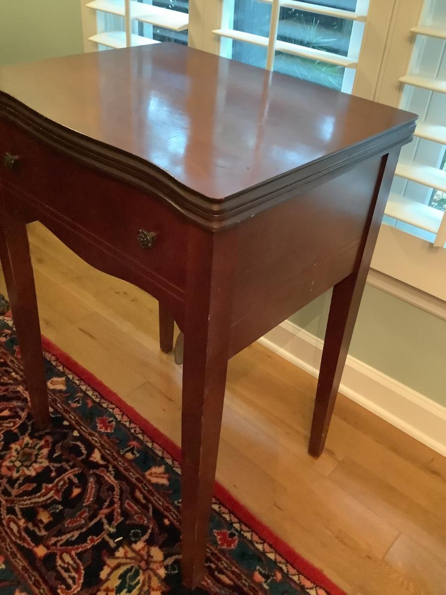 Wooden table in good condition, currently used as bar in dining area, technically a sewing table with non-working machine, without machine it’s a great foldout side table as needed or used closed, cover machine hole for an extended table