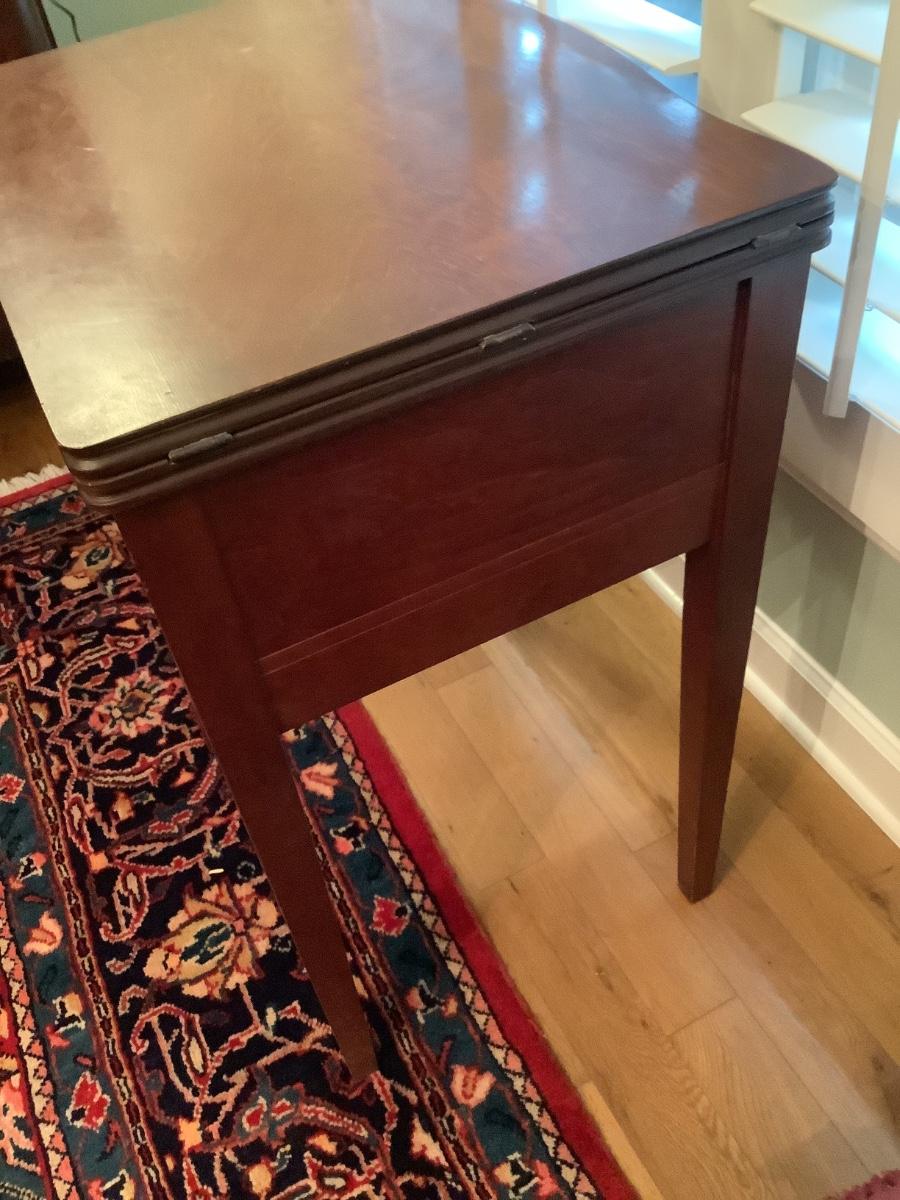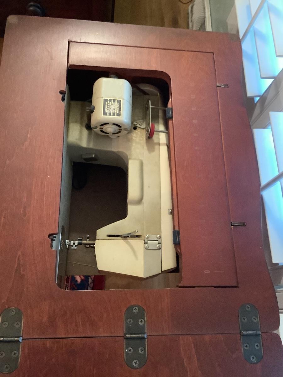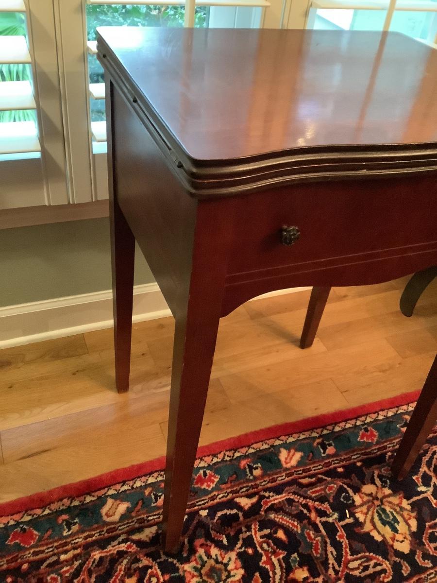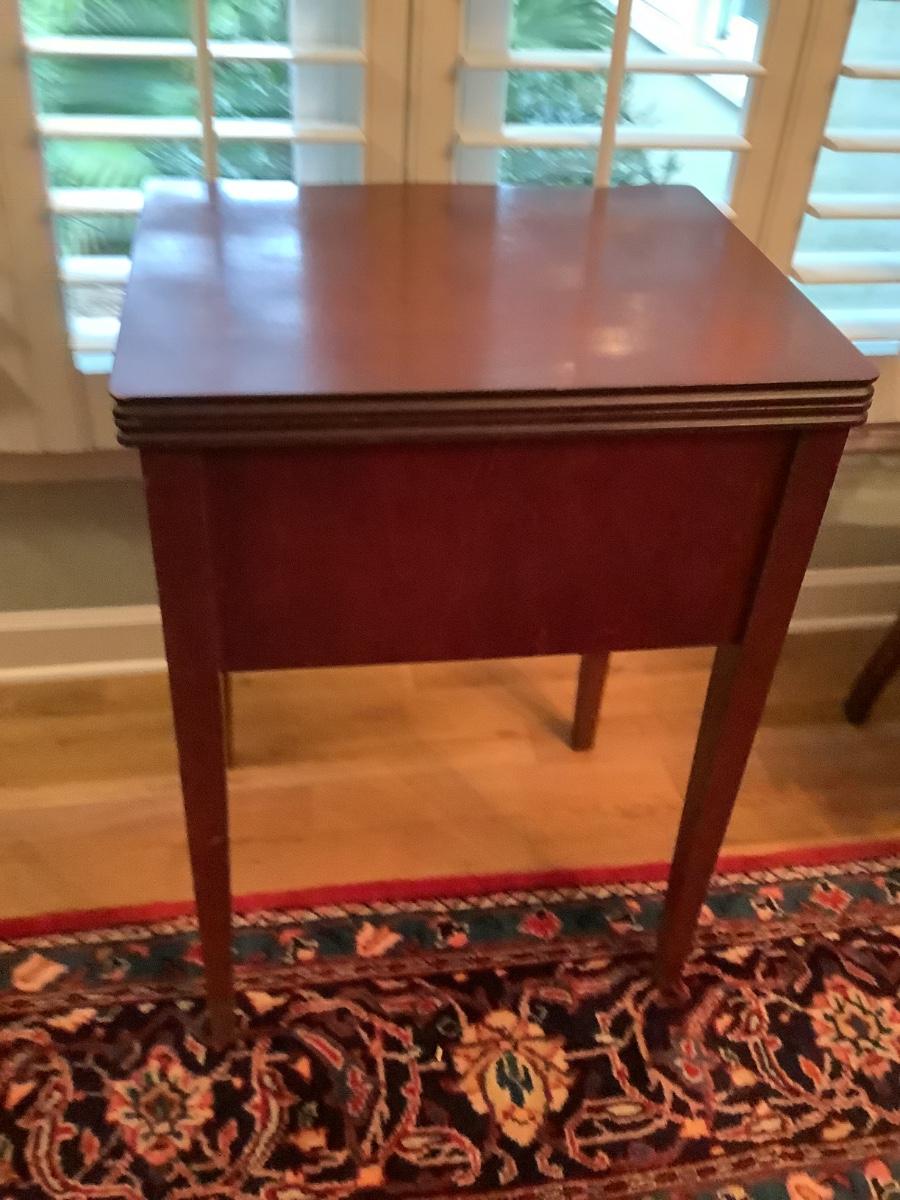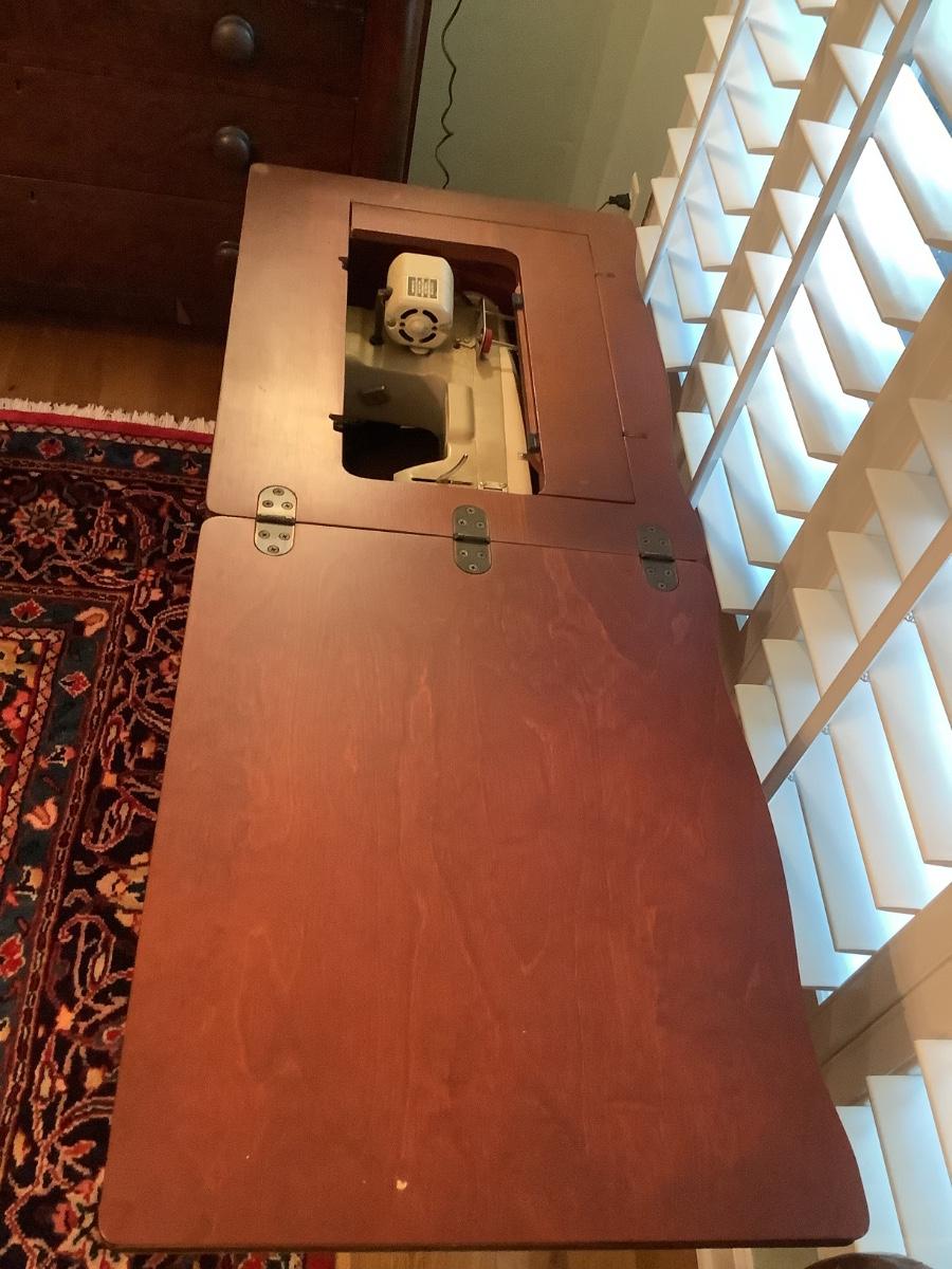 Wooden table in good condition, currently used as bar in dining area, technically a sewing table with non-working machine, without machine it’s a great foldout side table as needed or used closed, cover machine hole for an extended table