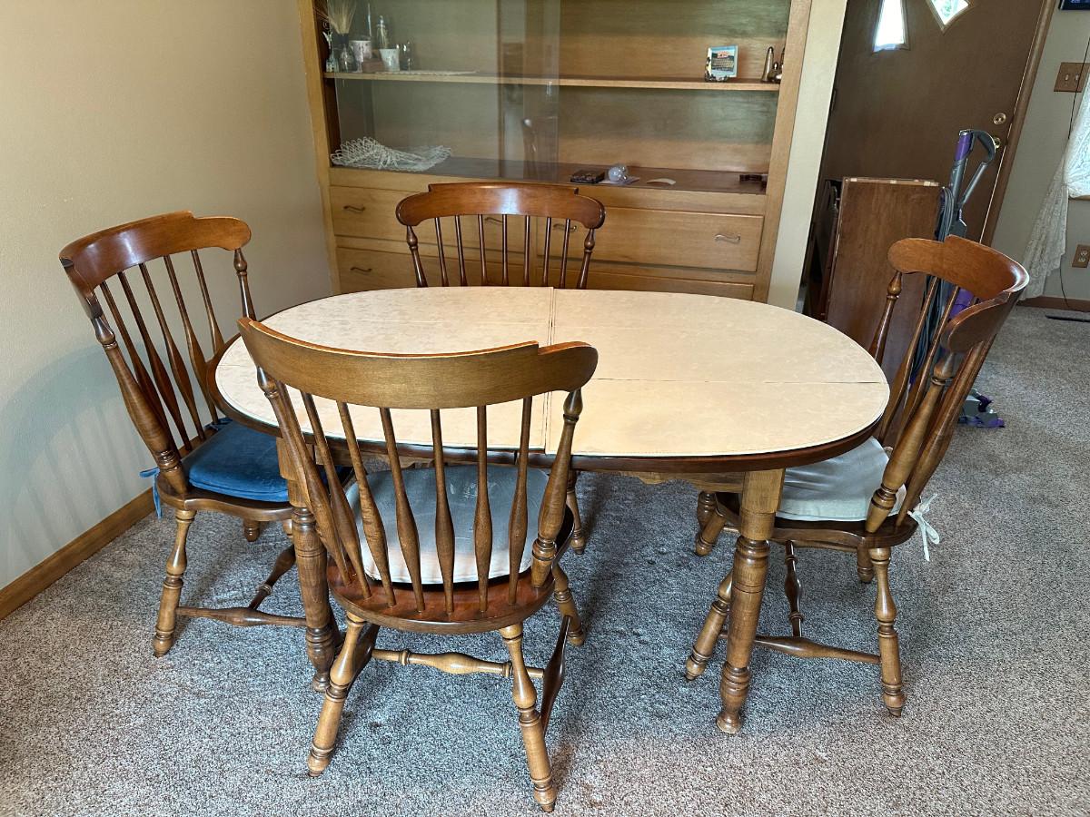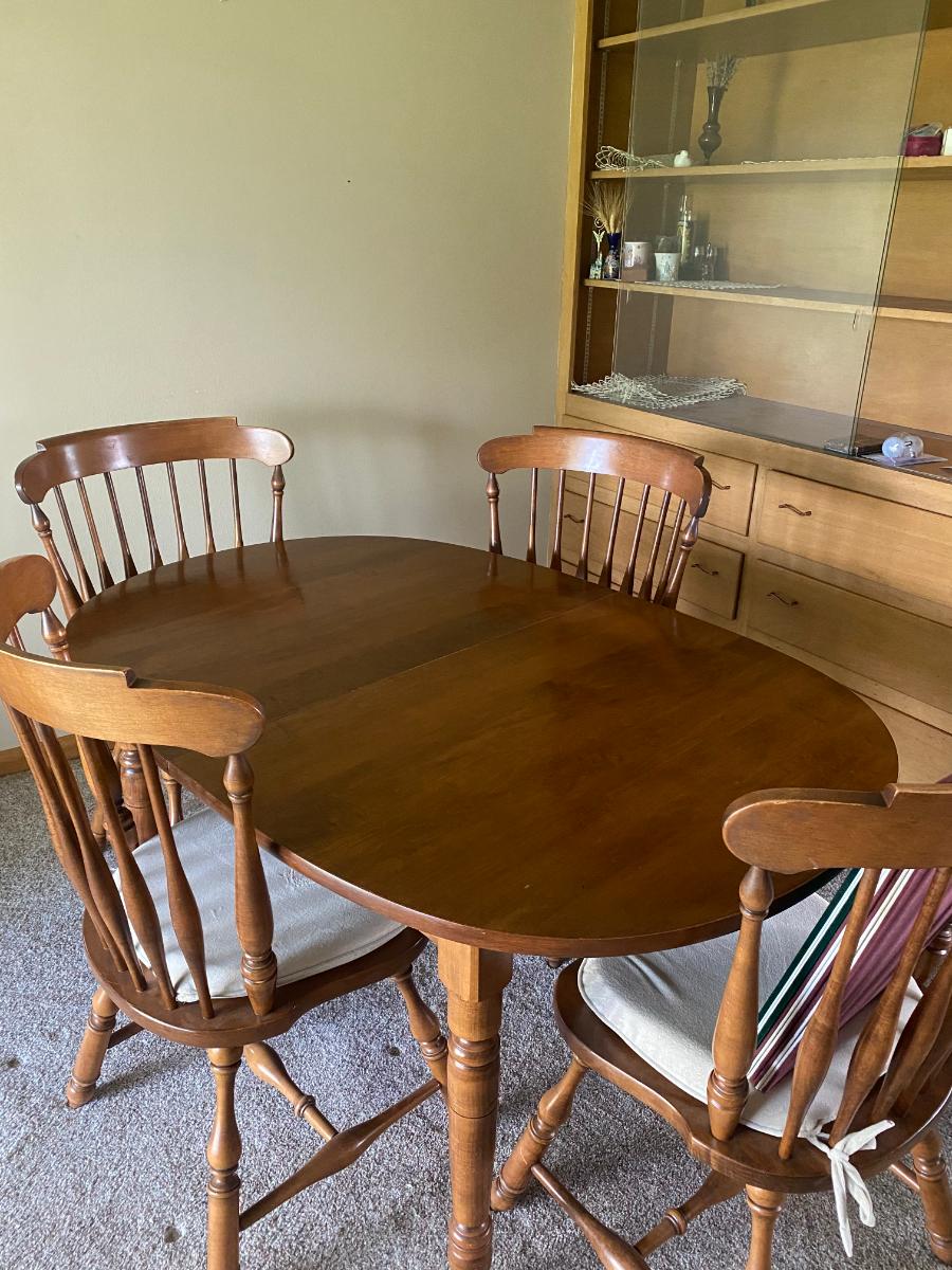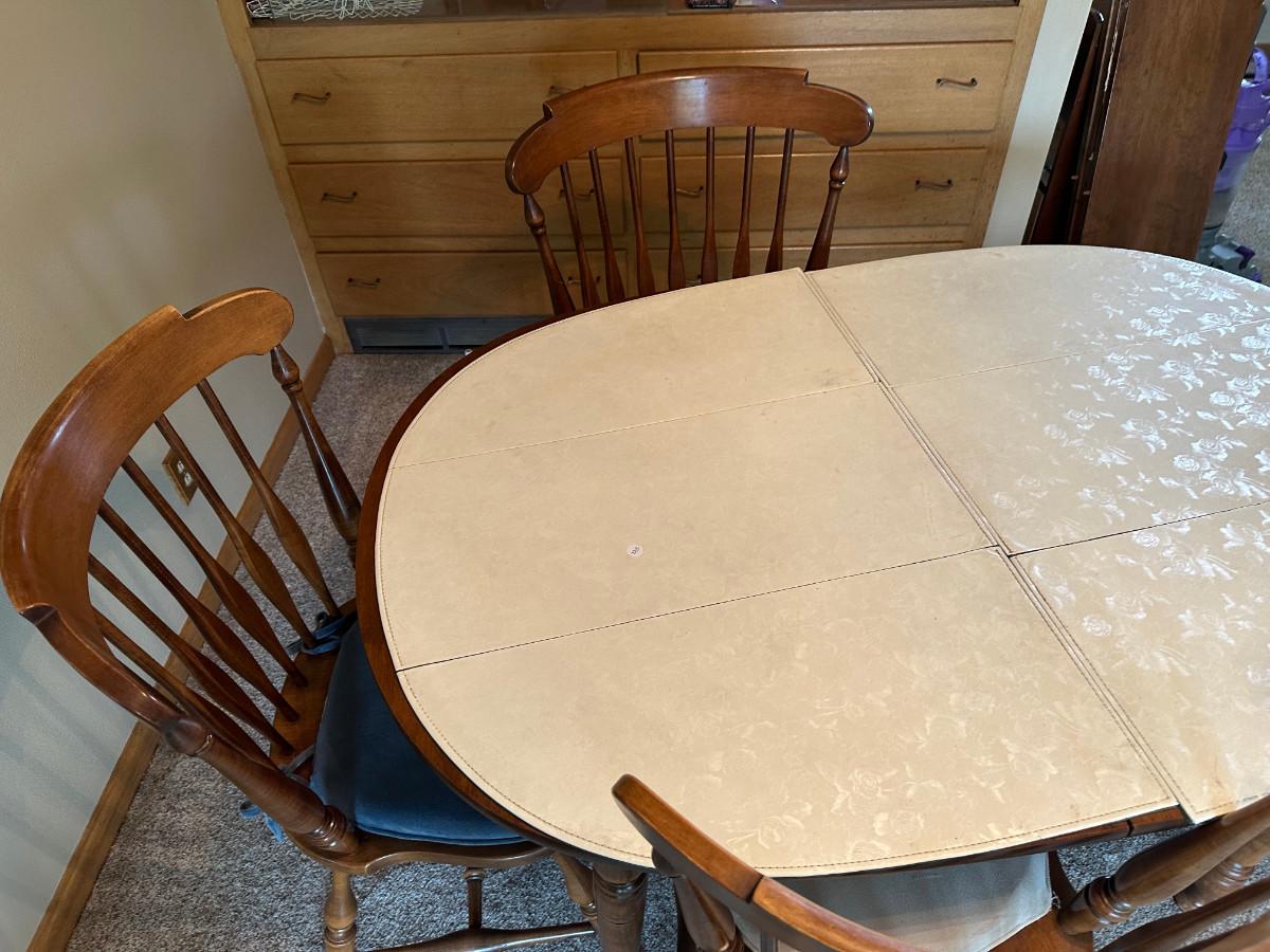 Wooden Table with 4 chairs. AMAZING shape, comes with 3 leaves