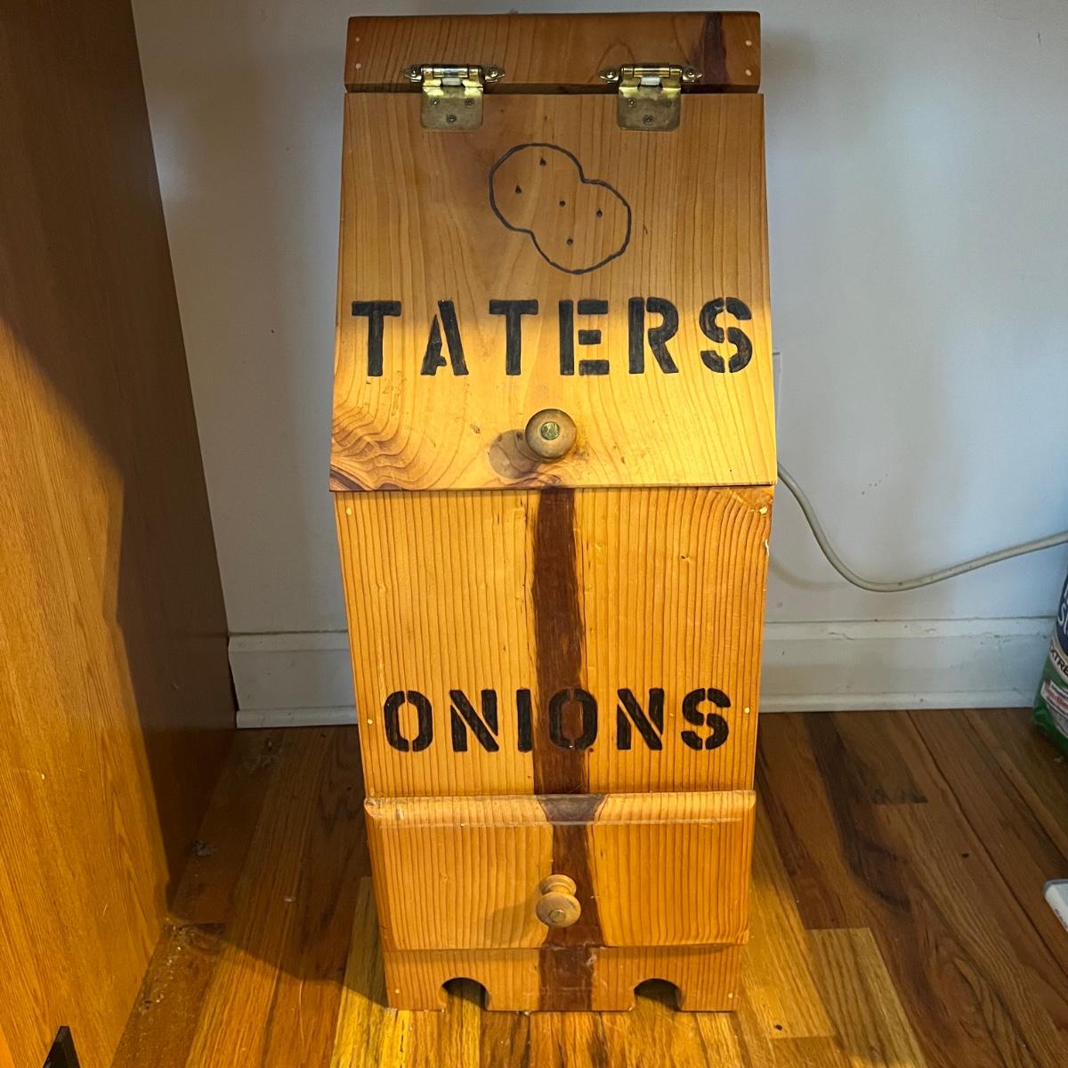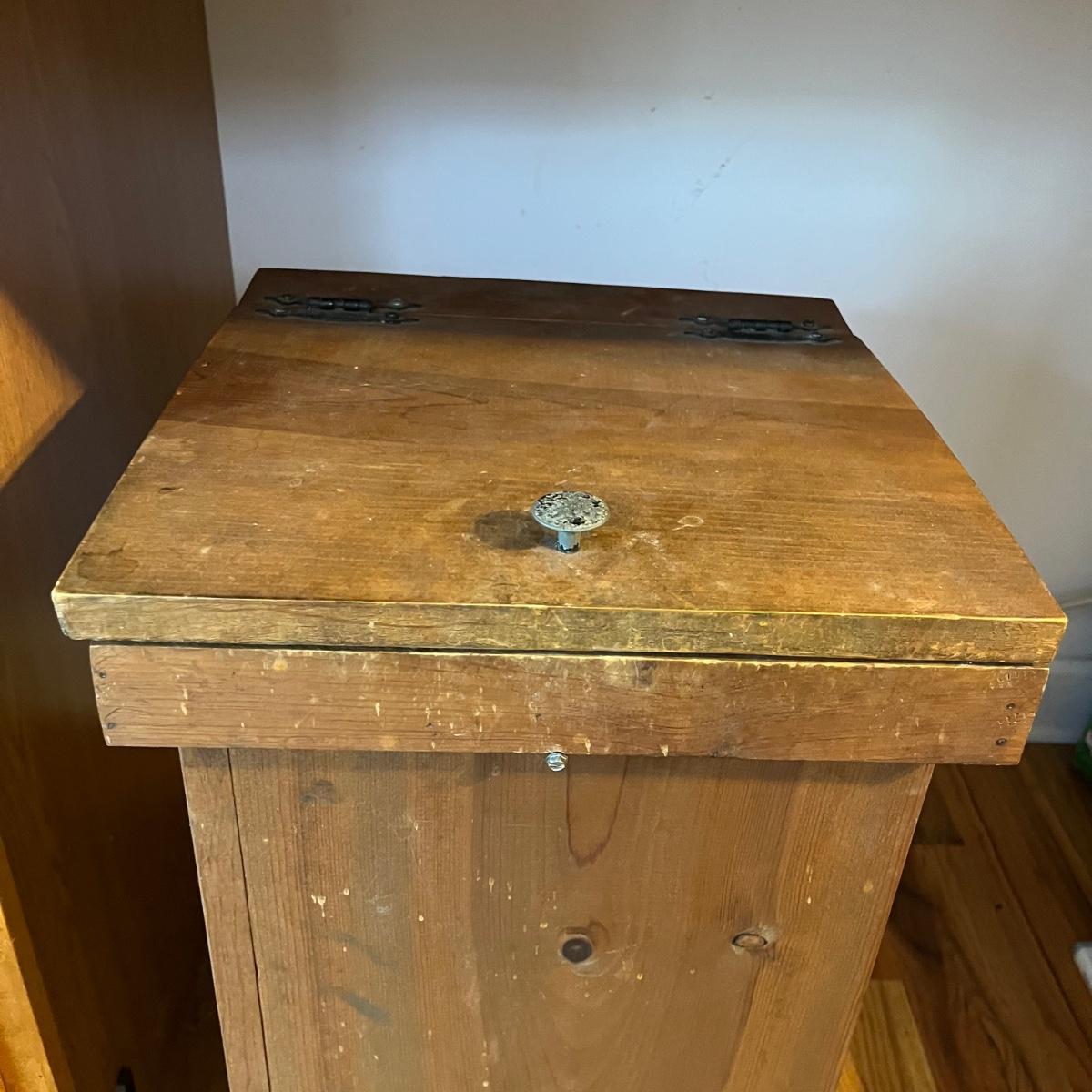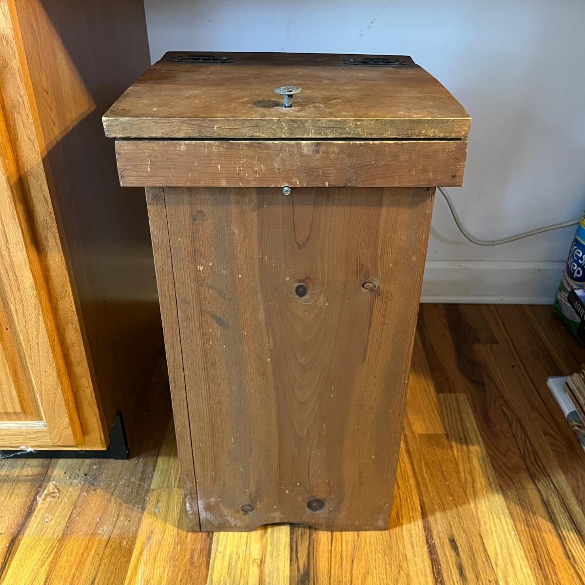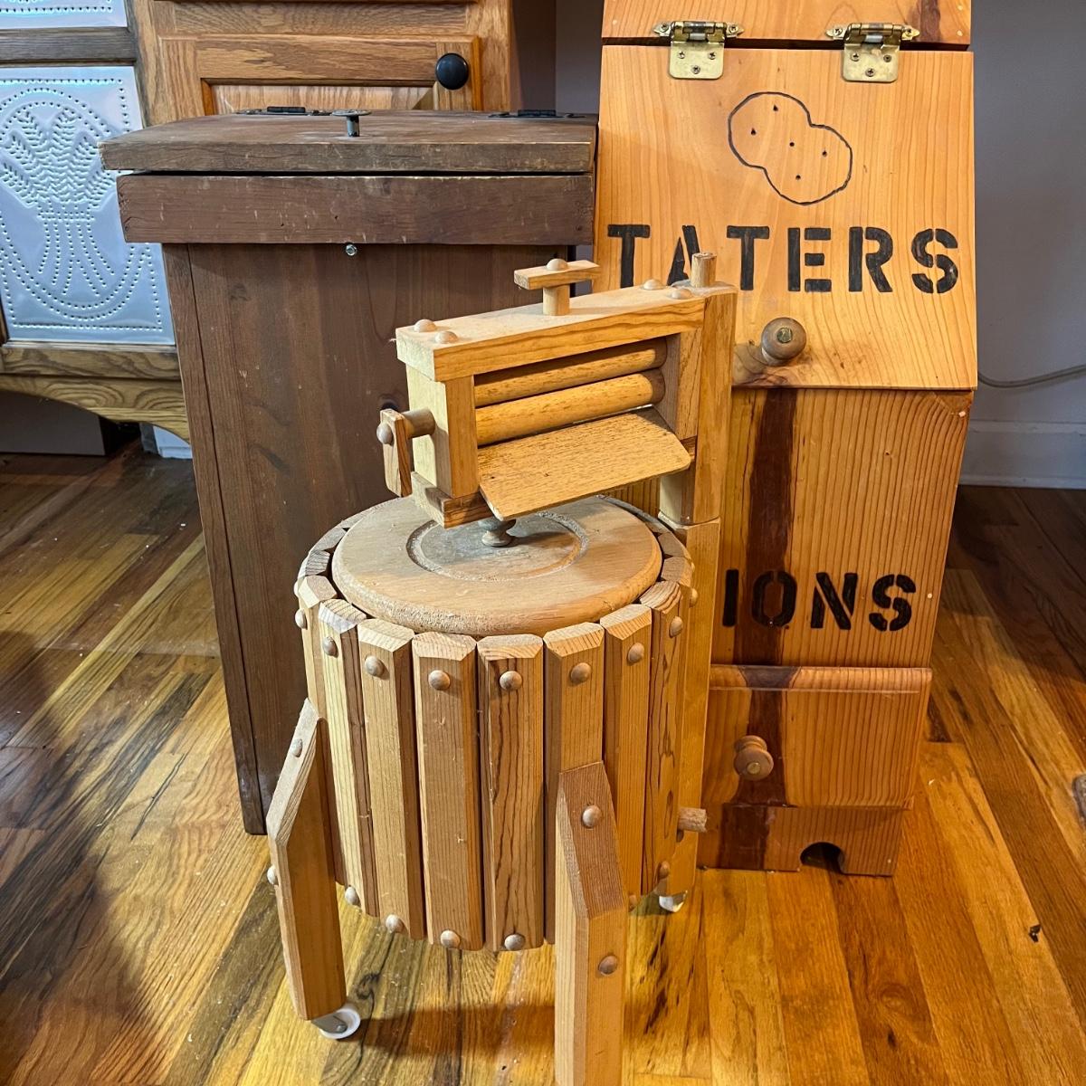 Lot includes a wooden tater and onion bin, rustic wooden garbage bin and a wooden canister that looks like a vintage washing machine. Tater bin measures 11” x 12” x 29”.