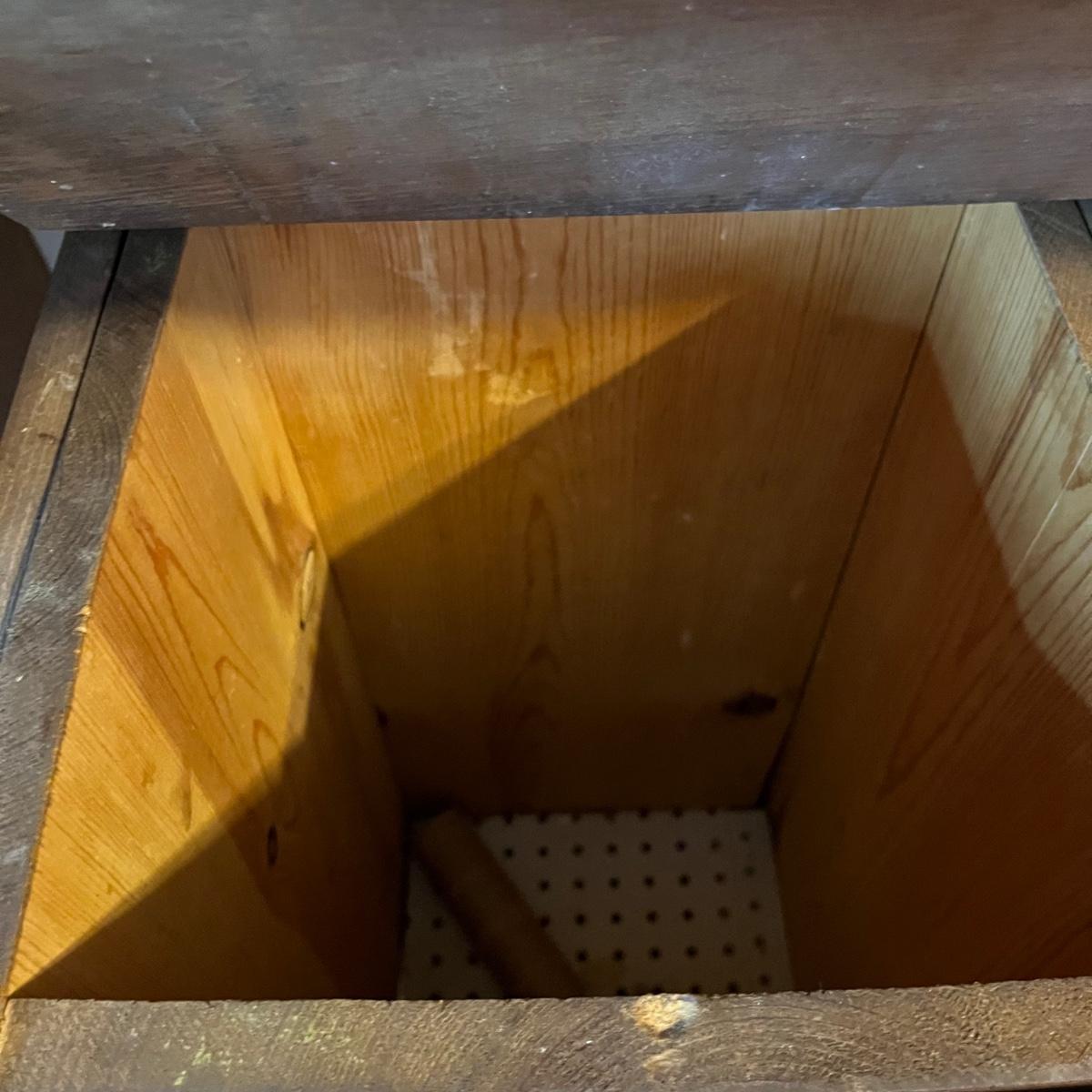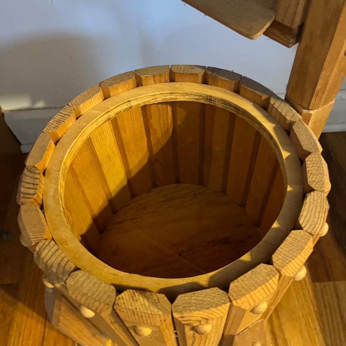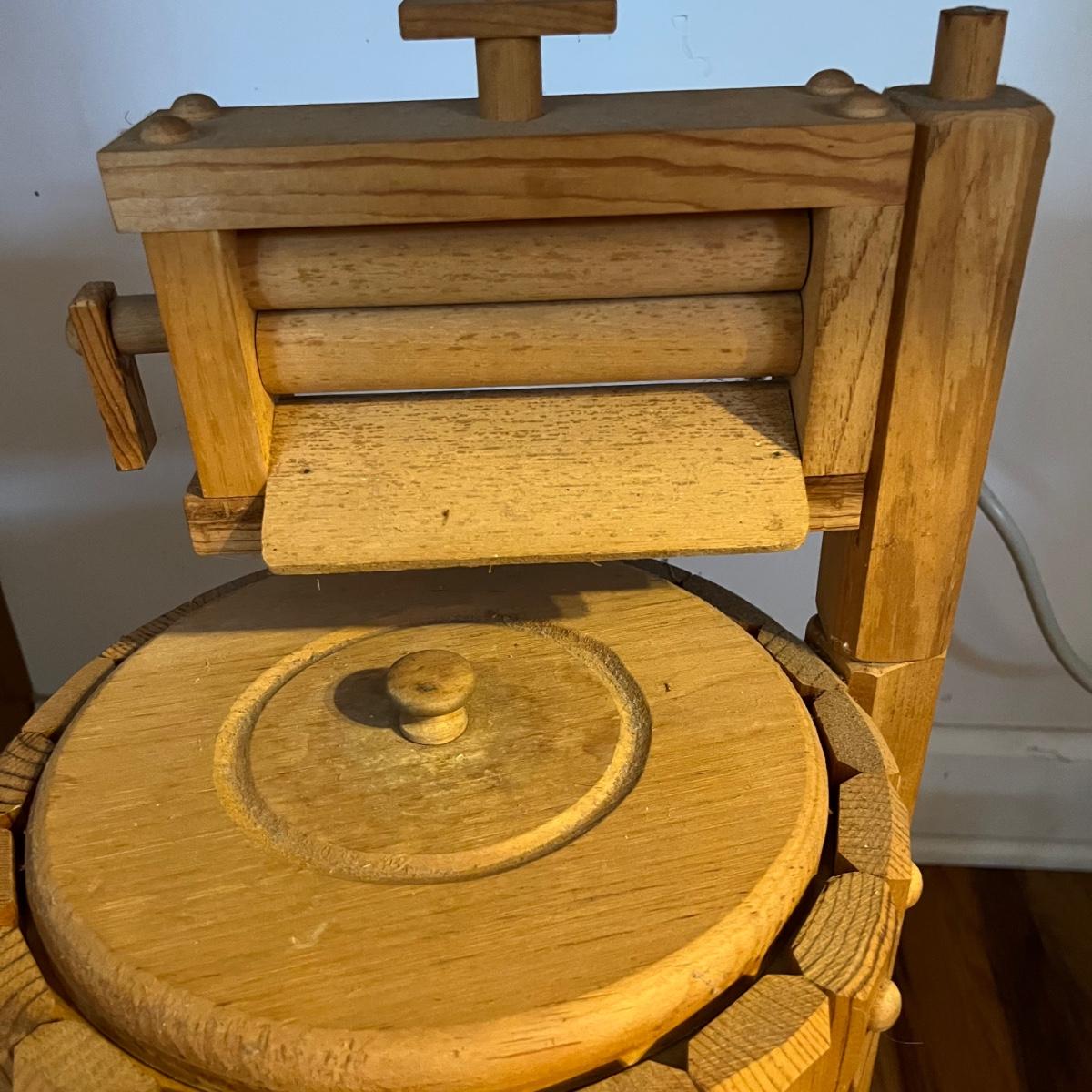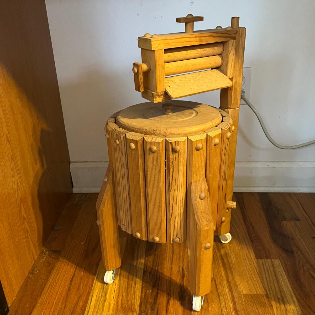 Lot includes a wooden tater and onion bin, rustic wooden garbage bin and a wooden canister that looks like a vintage washing machine. Tater bin measures 11” x 12” x 29”.