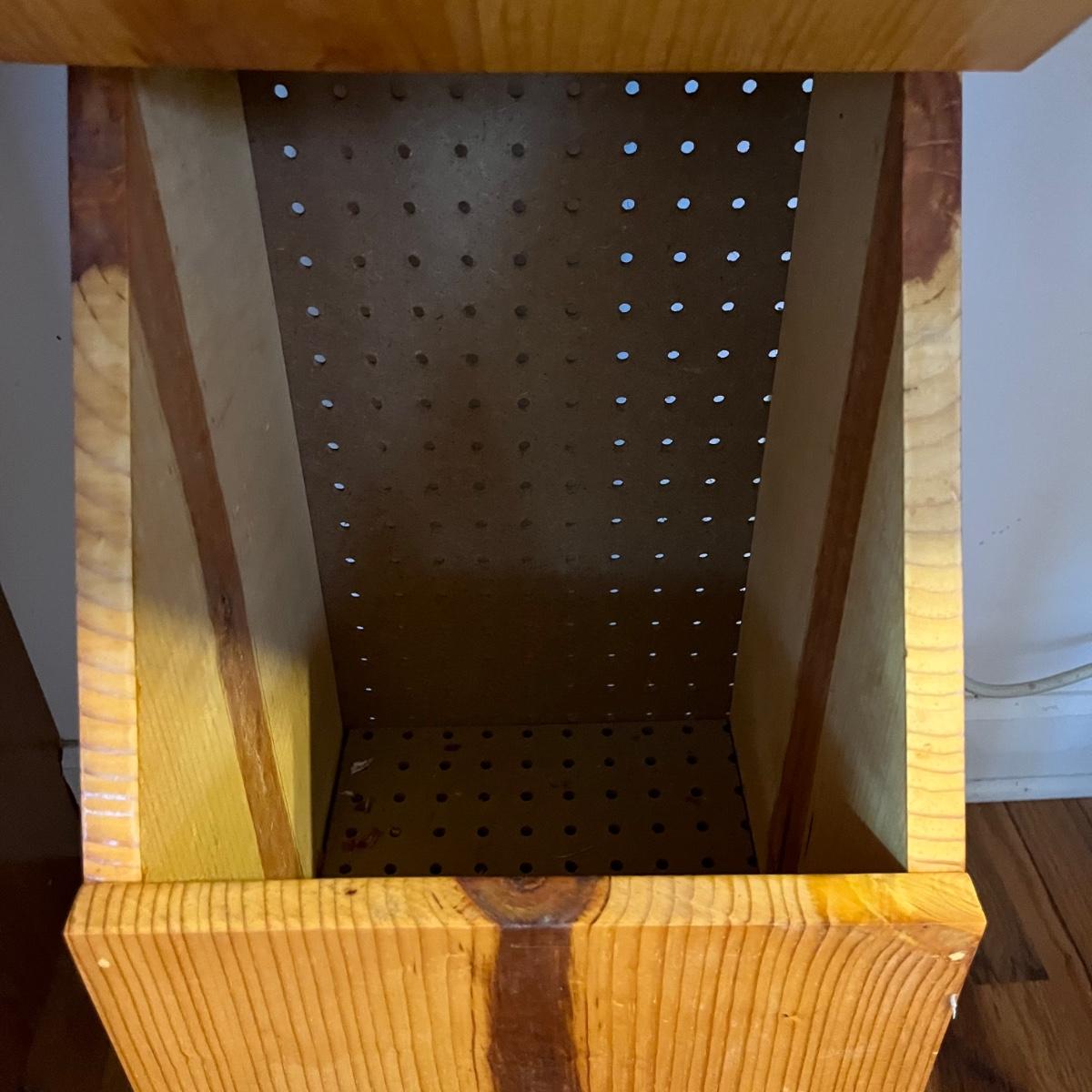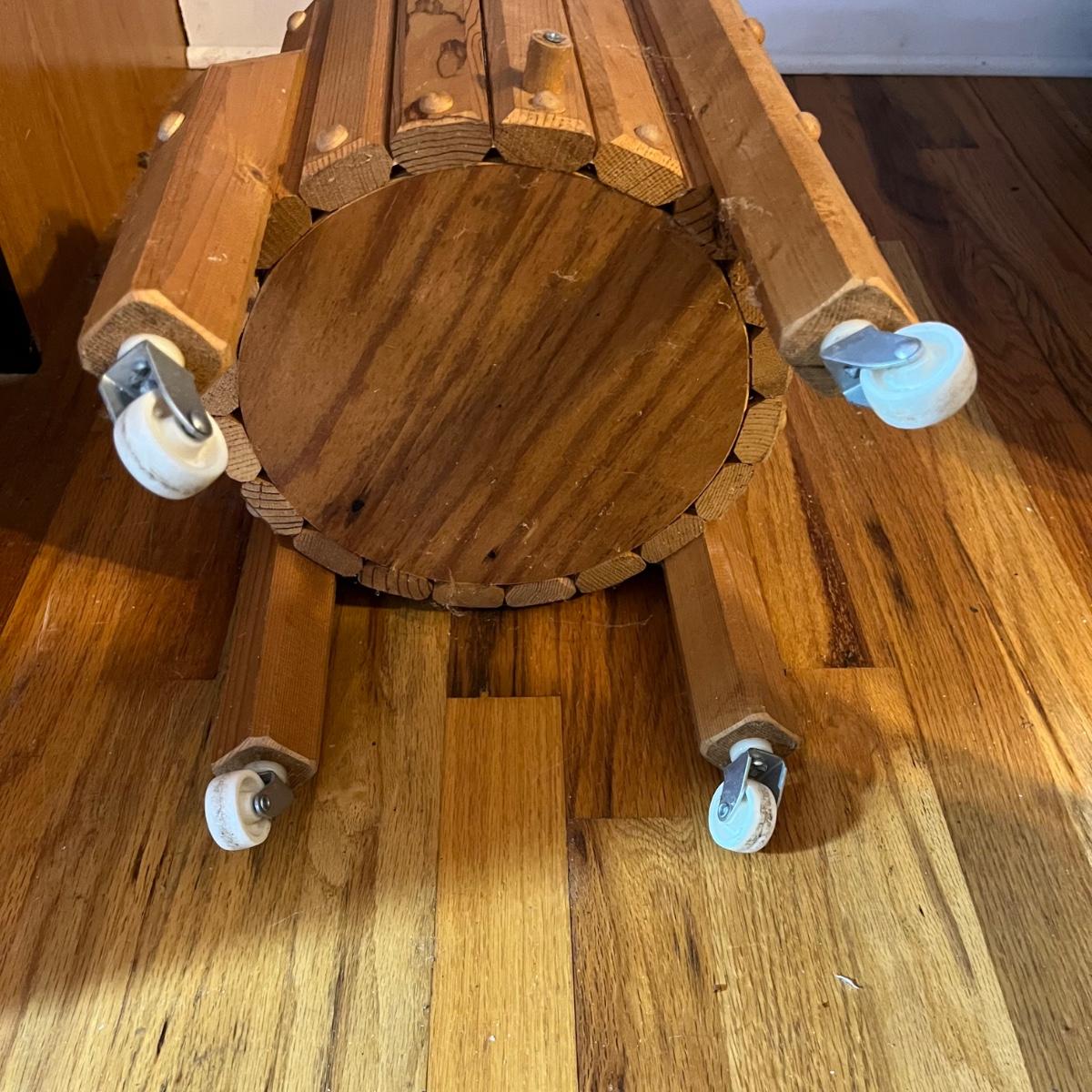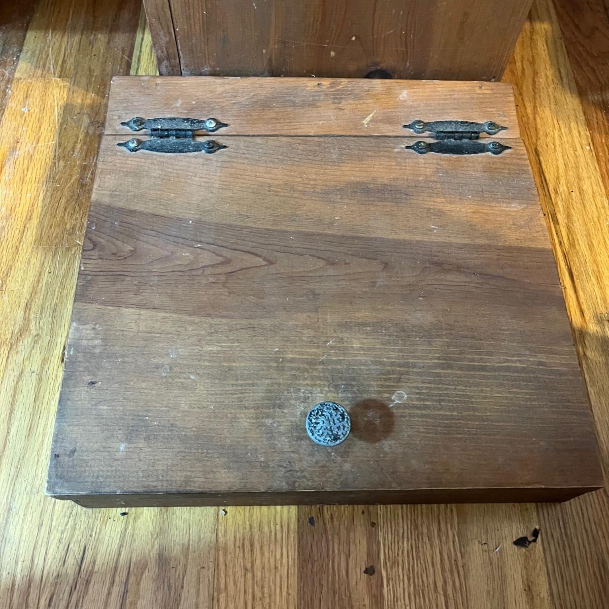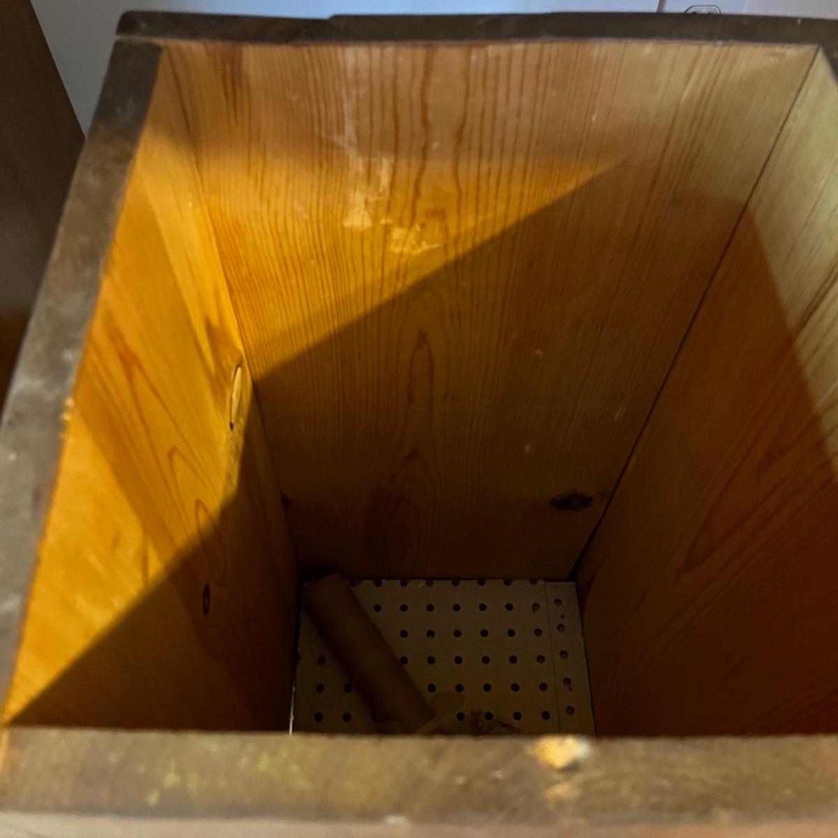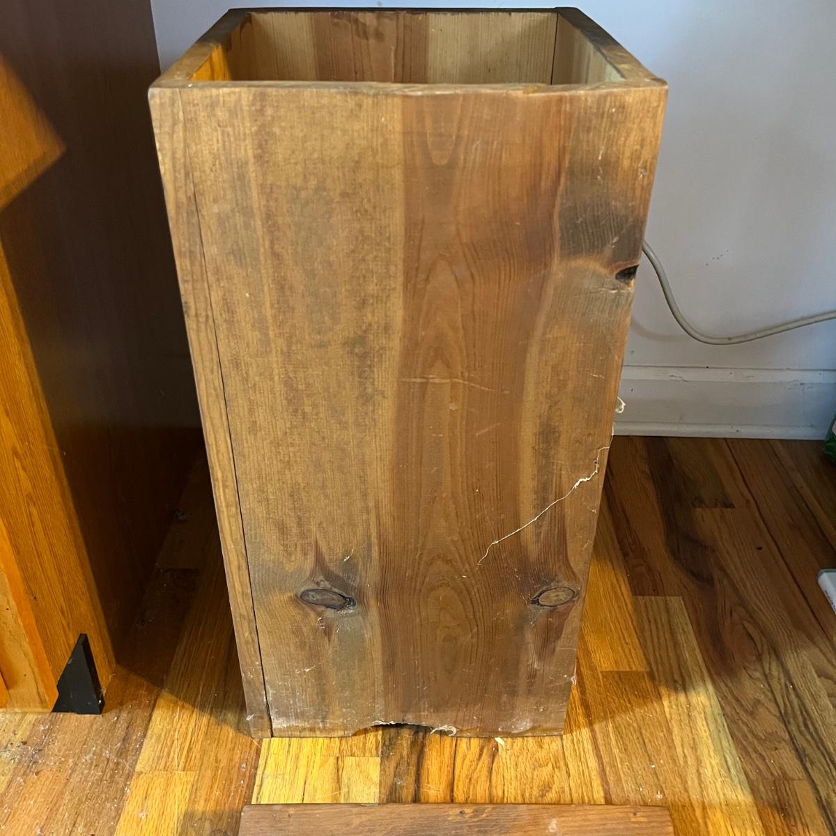 Lot includes a wooden tater and onion bin, rustic wooden garbage bin and a wooden canister that looks like a vintage washing machine. Tater bin measures 11” x 12” x 29”.