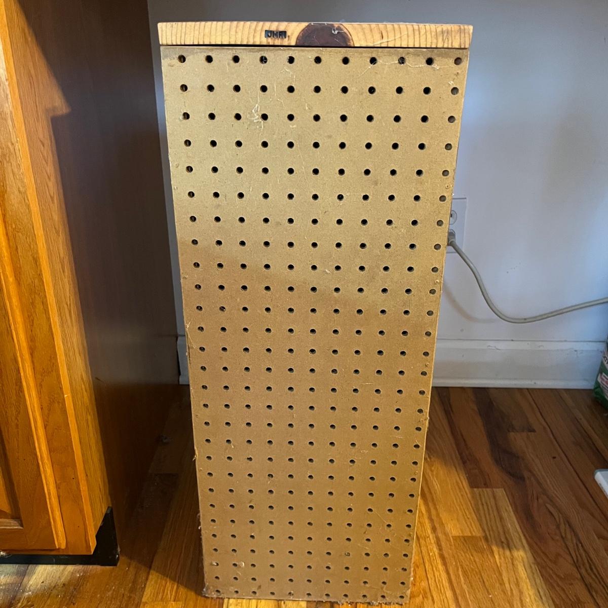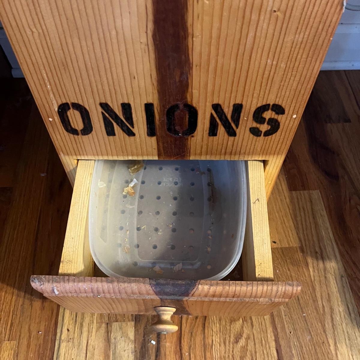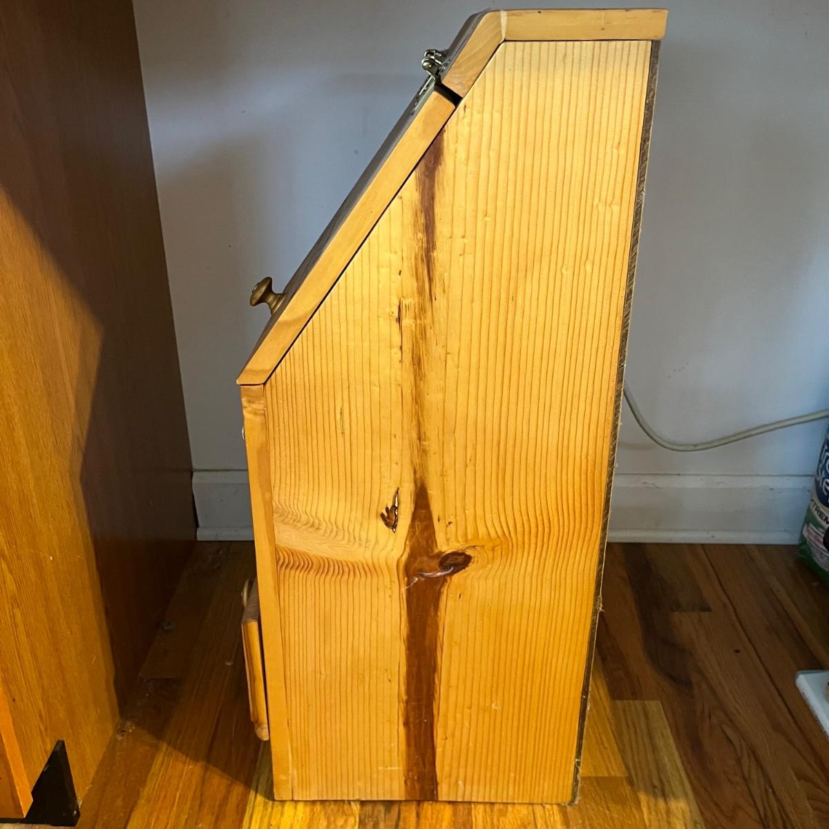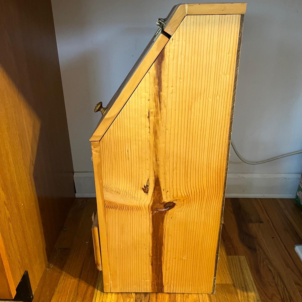 Lot includes a wooden tater and onion bin, rustic wooden garbage bin and a wooden canister that looks like a vintage washing machine. Tater bin measures 11” x 12” x 29”.