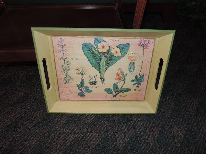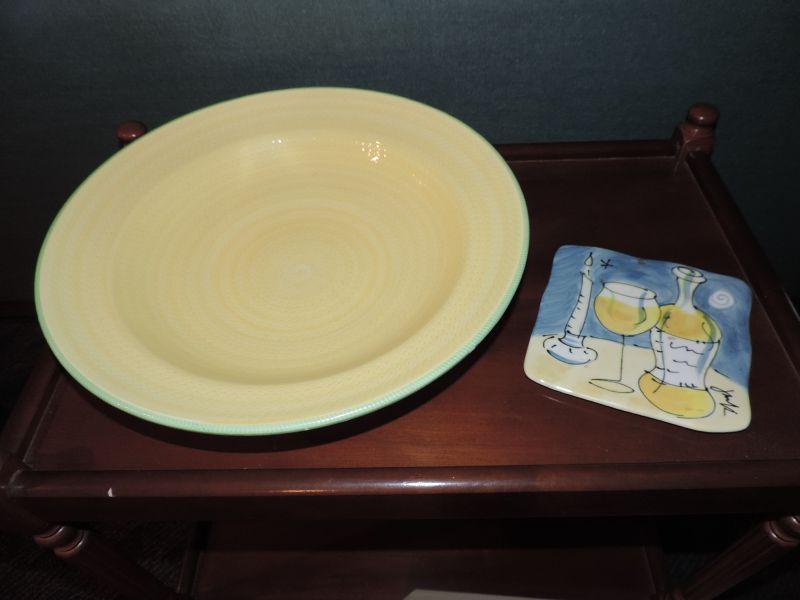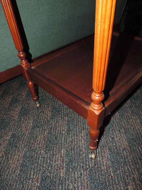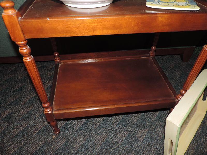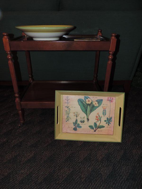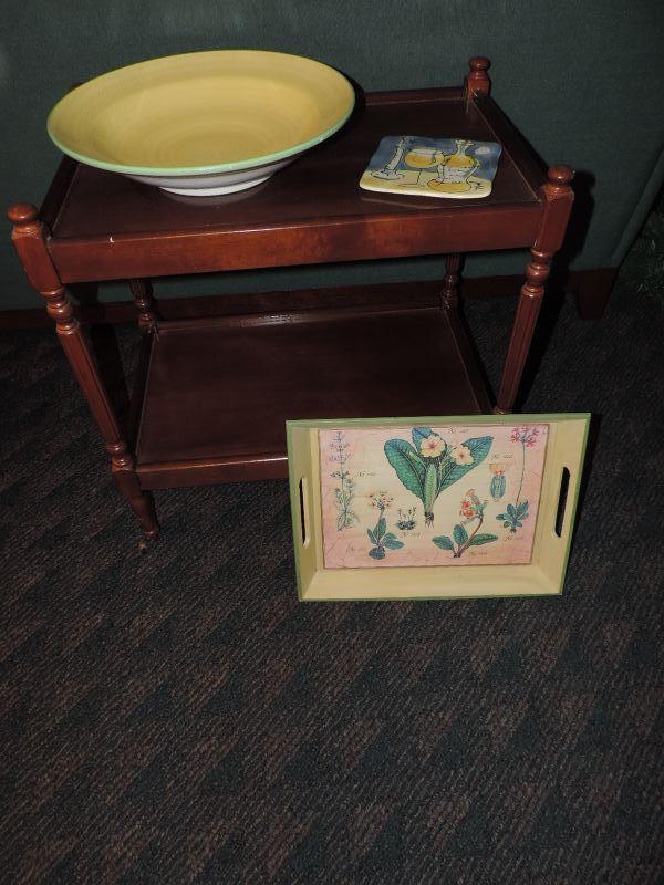 NICE 2 TIER CART ON CASTERS MEASURES 25"X15"X24", PAINTED WOOD SERVING TRAY, CERAMIC HOT PLATE, AND CERAMIC SERVING BOWL