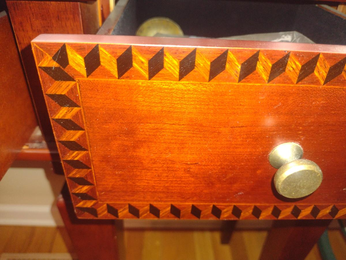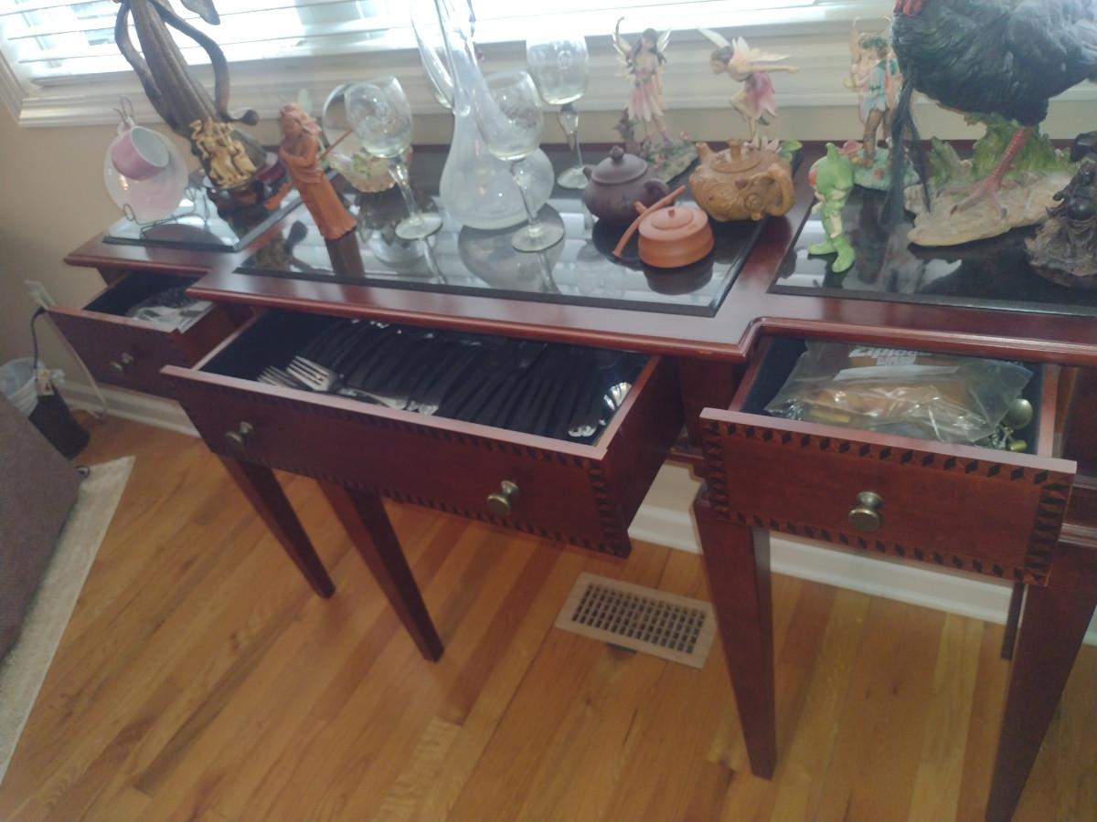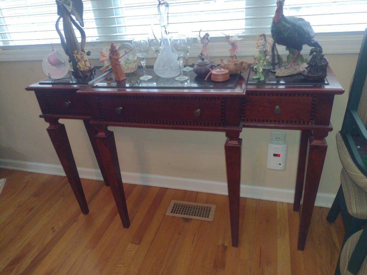 Wooden Three Drawer Breakfront Style Console Table with Granite Panel Inlay Top. Approx 51 1/2" long. No contents included.