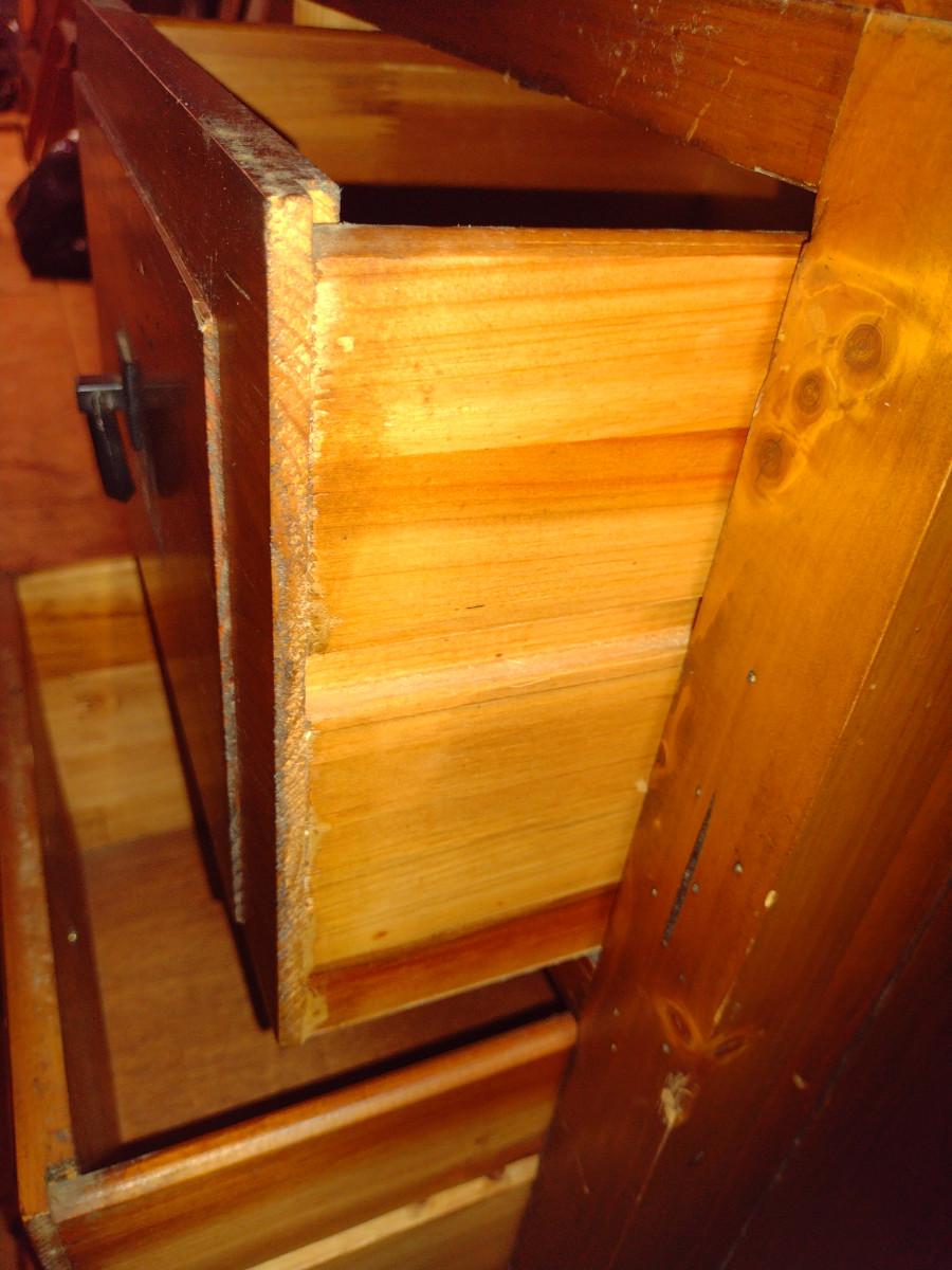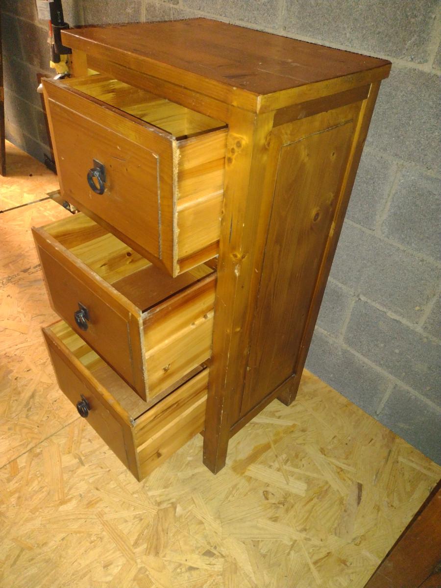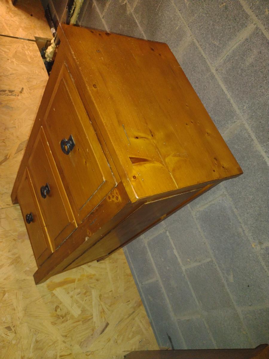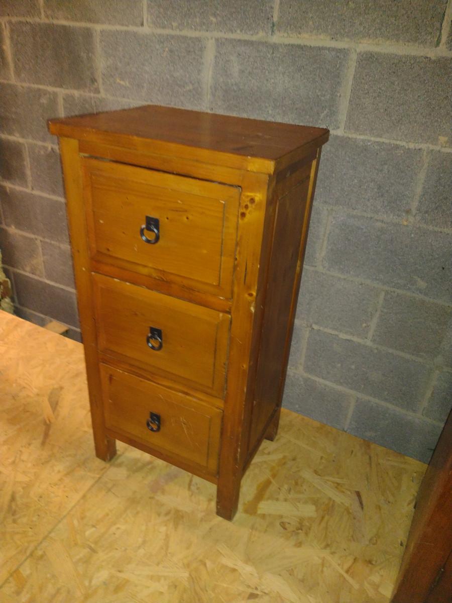 Wooden Three Drawer Cabinet. Item is located in crawlspace and must be carried up approx 18 steps up a hill.