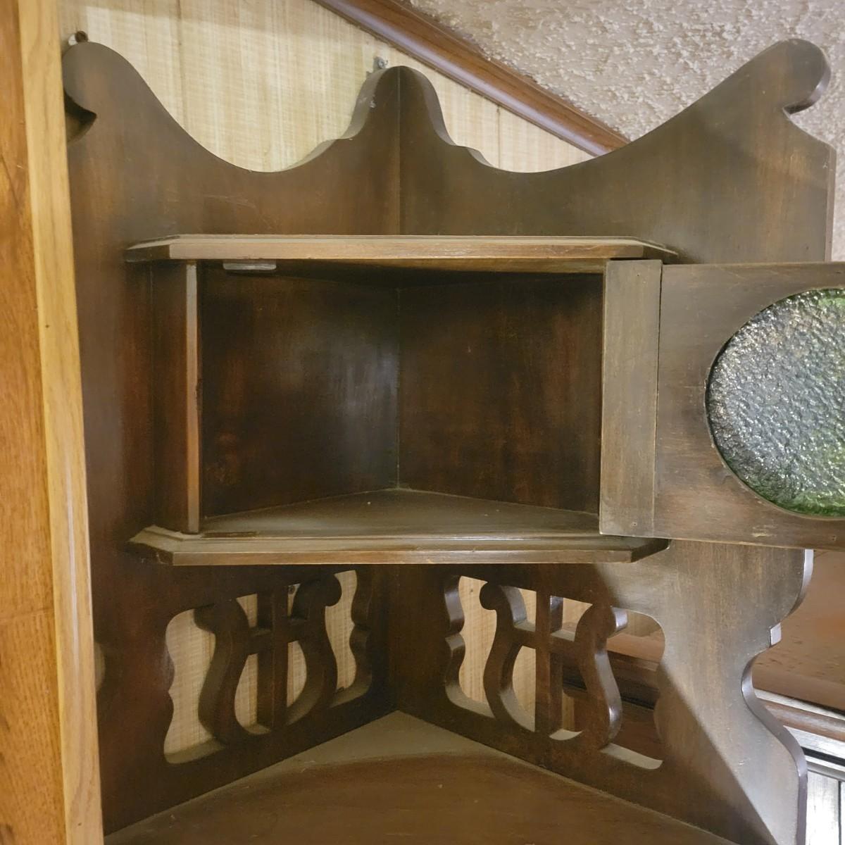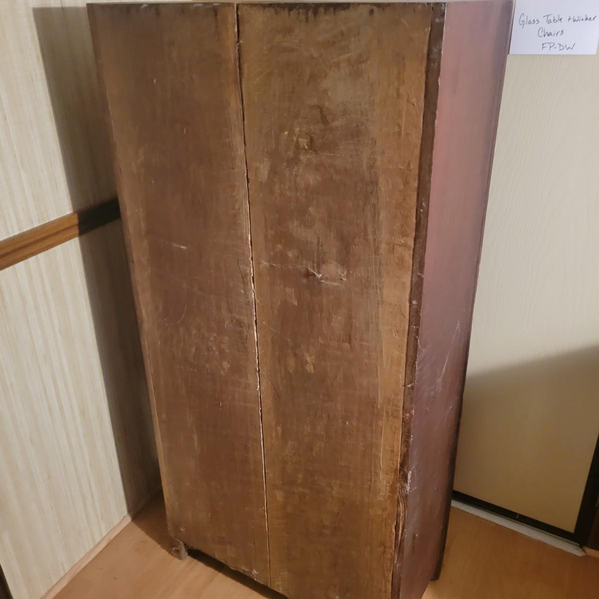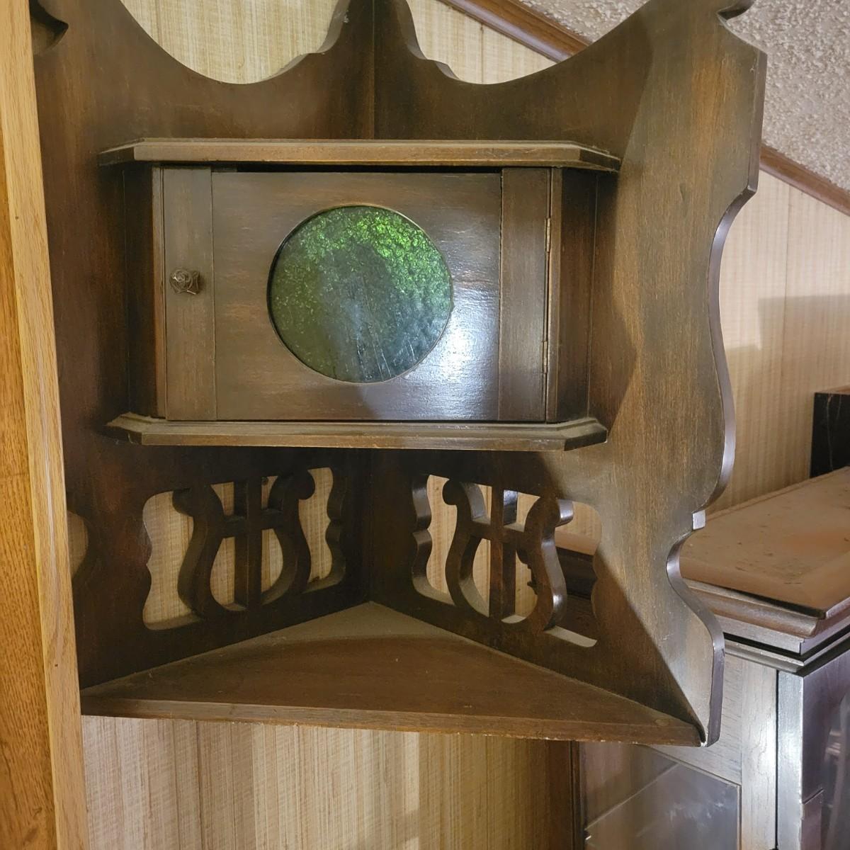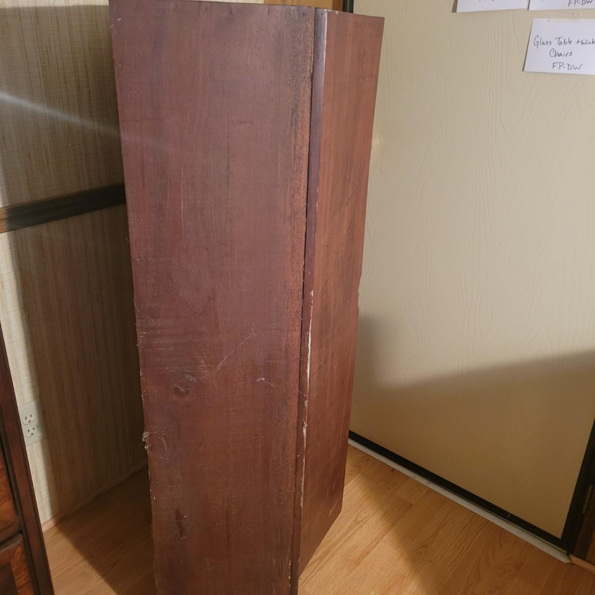 A wooden three drawer cabinet in fair condition with notable scratches and blemishes. Cabinet could definitely be refinished to bring it back to life. See attached pictures for more detail Measures approximately 24.5" x 12" x 51" also includes a hanging corner cabinet with a small cubby with green glass. Cabinet is in good condition with no notable damage. Winning bidder will need to bring tools to remove from the wall. Held up by two philips head screws. Measures approximately 21" x 16" Local pickup only