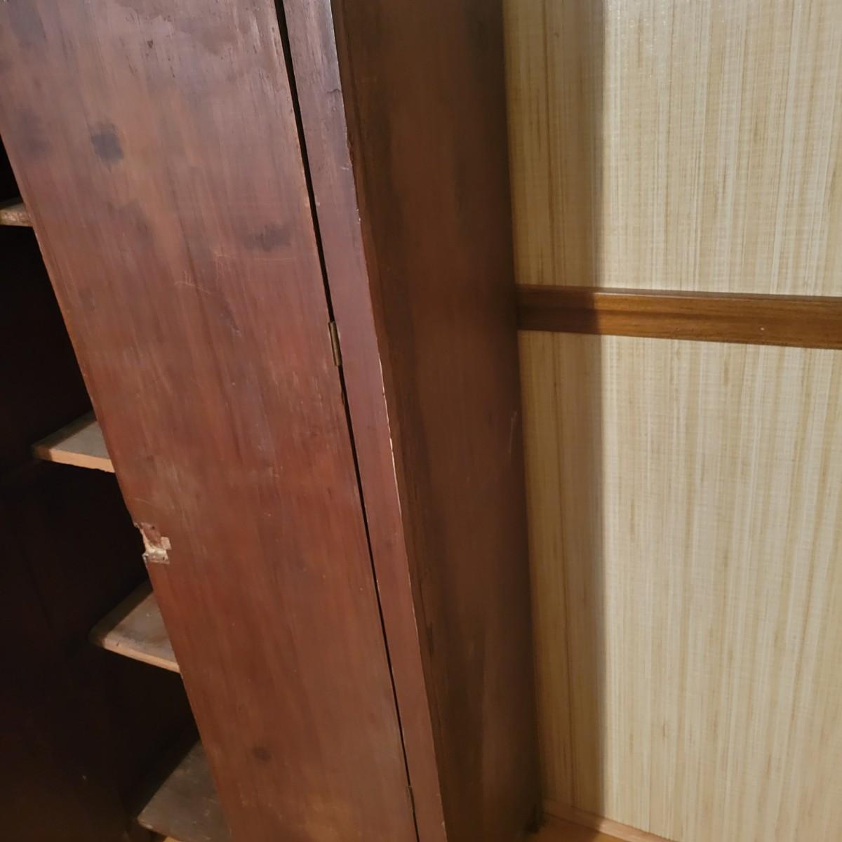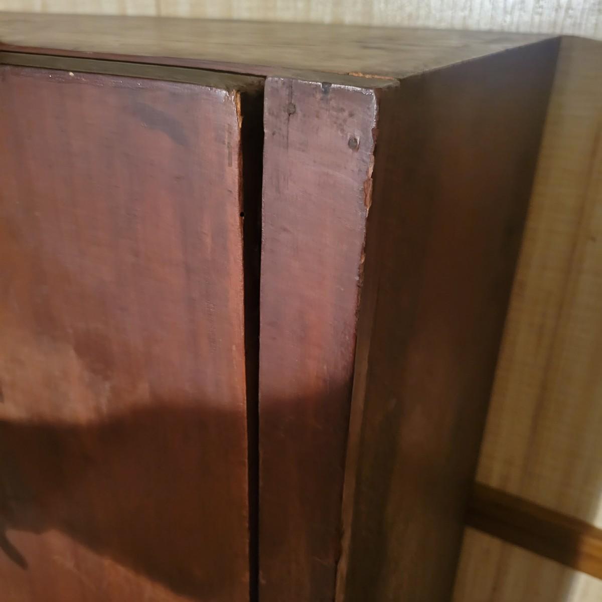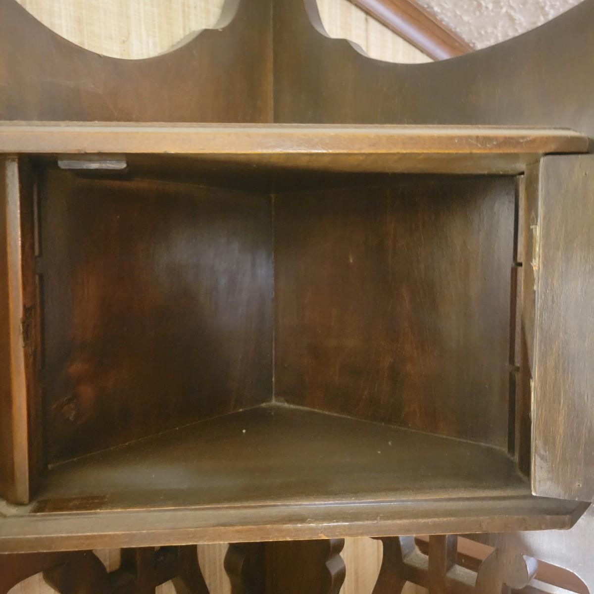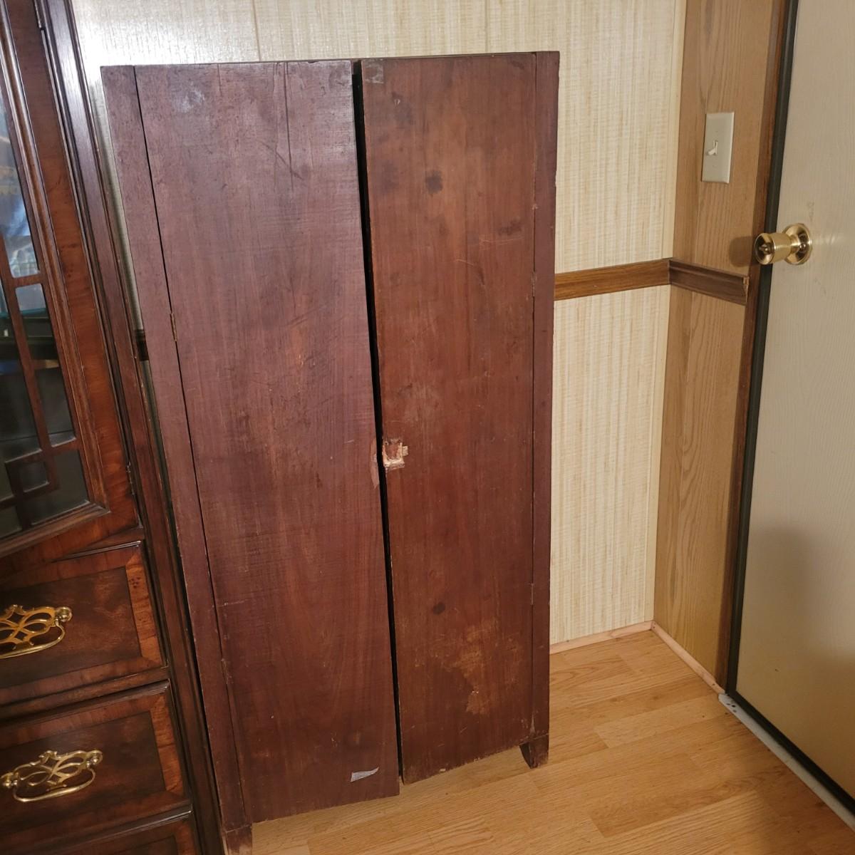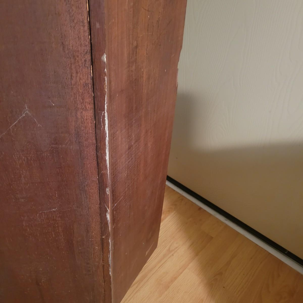A wooden three drawer cabinet in fair condition with notable scratches and blemishes. Cabinet could definitely be refinished to bring it back to life. See attached pictures for more detail Measures approximately 24.5" x 12" x 51" also includes a hanging corner cabinet with a small cubby with green glass. Cabinet is in good condition with no notable damage. Winning bidder will need to bring tools to remove from the wall. Held up by two philips head screws. Measures approximately 21" x 16" Local pickup only