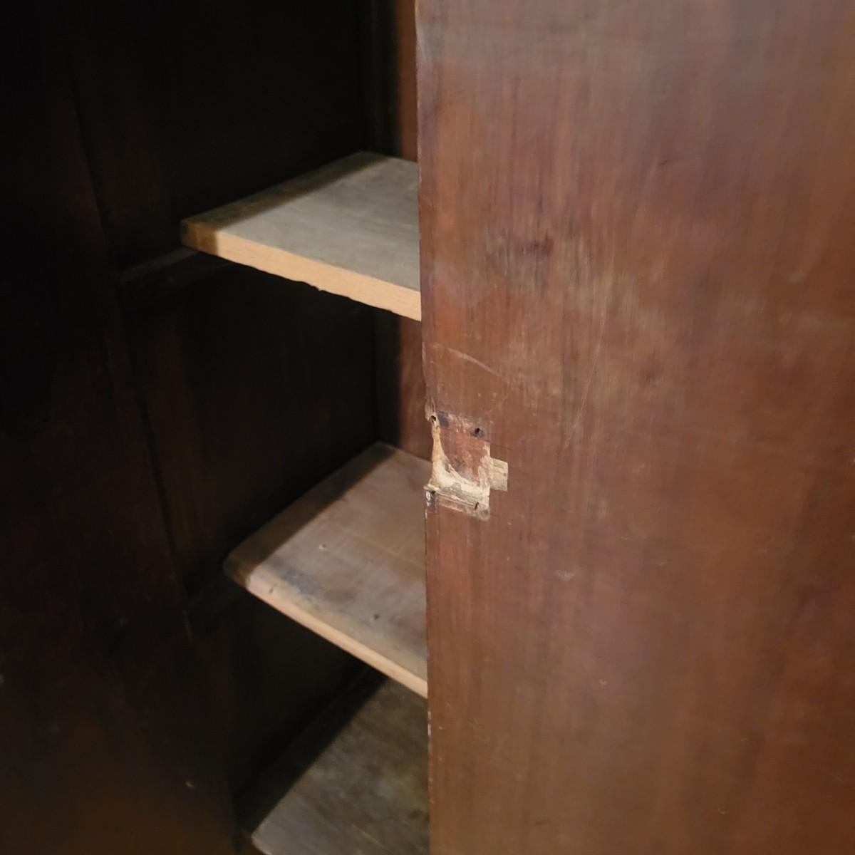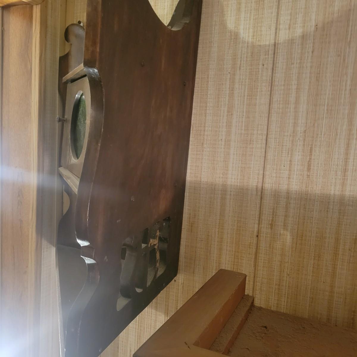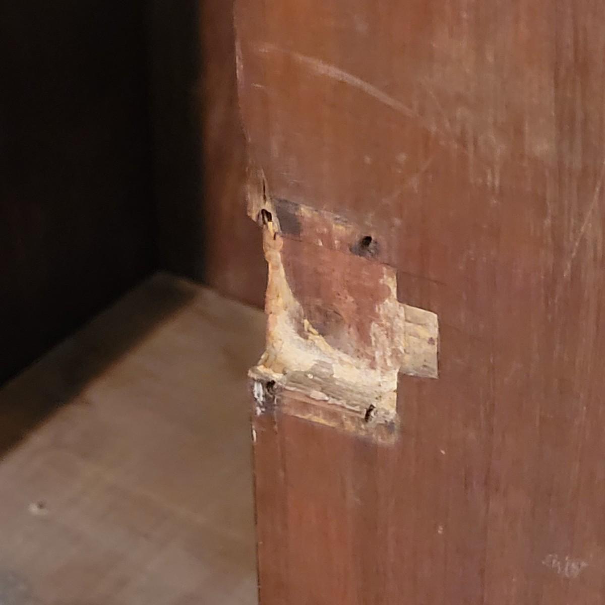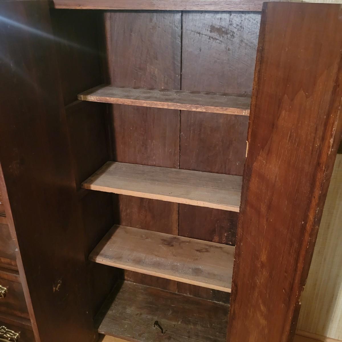 A wooden three drawer cabinet in fair condition with notable scratches and blemishes. Cabinet could definitely be refinished to bring it back to life. See attached pictures for more detail Measures approximately 24.5" x 12" x 51" also includes a hanging corner cabinet with a small cubby with green glass. Cabinet is in good condition with no notable damage. Winning bidder will need to bring tools to remove from the wall. Held up by two philips head screws. Measures approximately 21" x 16" Local pickup only