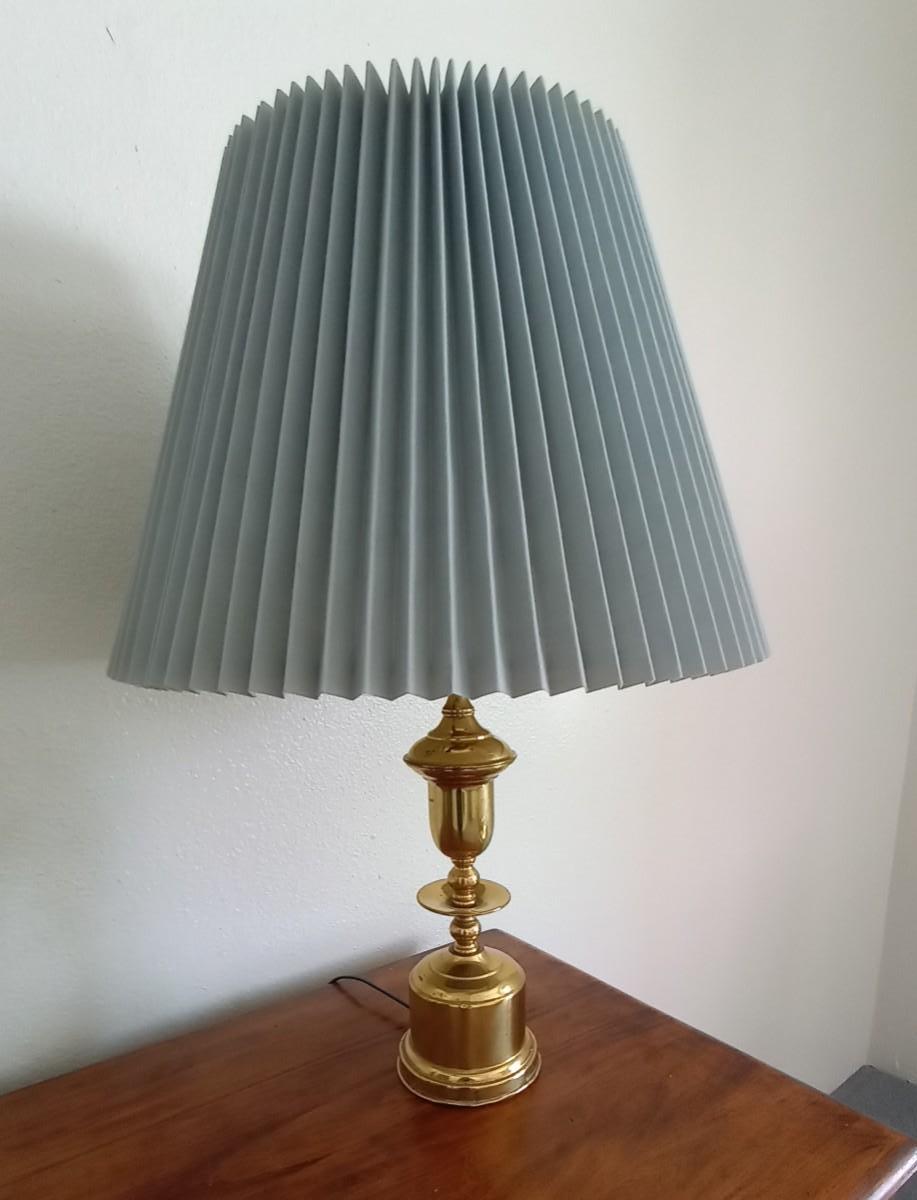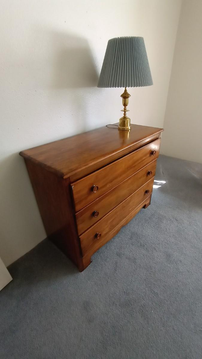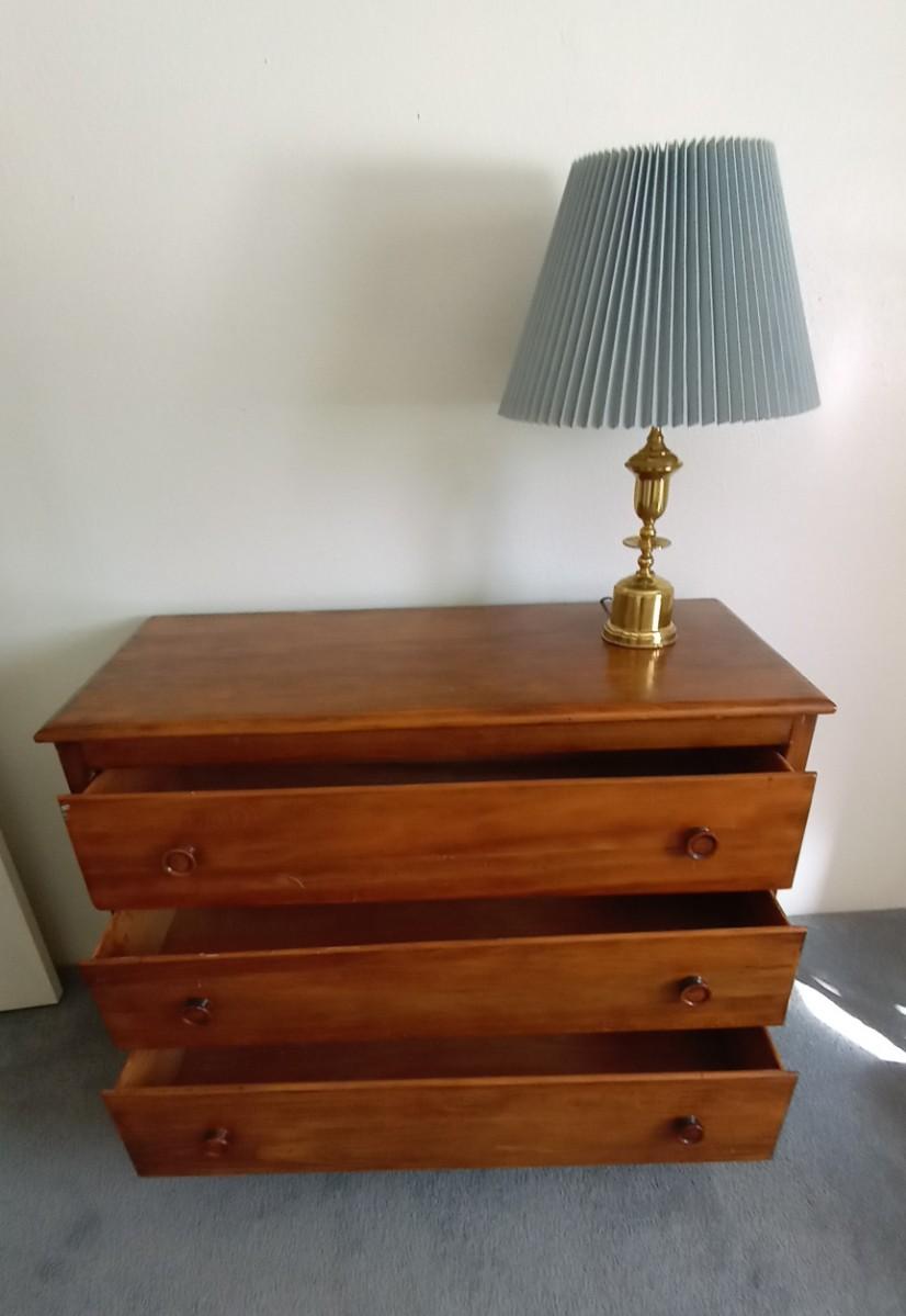 WOODEN THREE DRAWER DRESSER AND BRASS LAMP APPROX.40X18X31 LAMP APPROX. 24 TALL